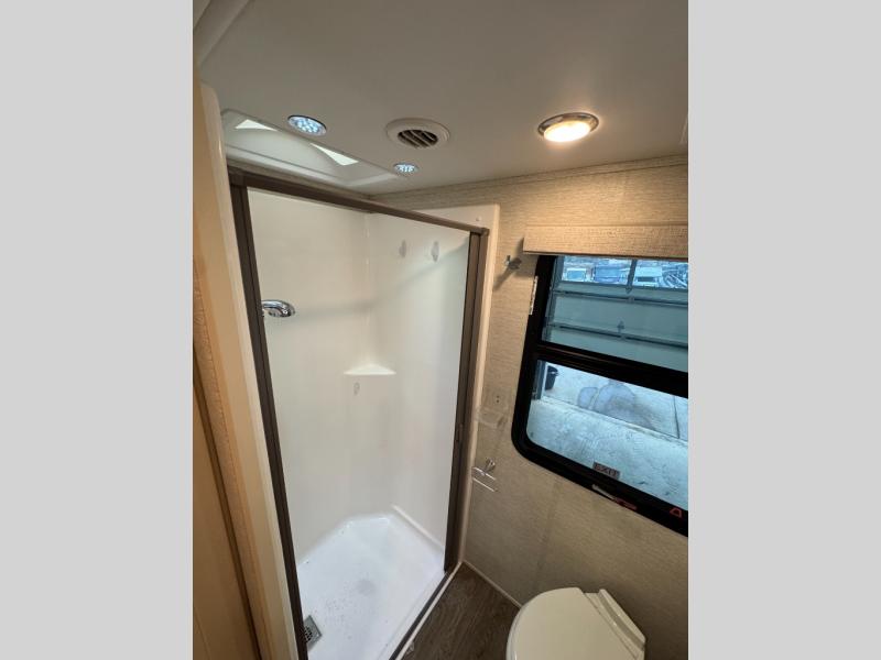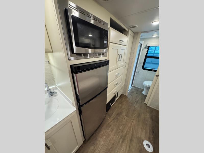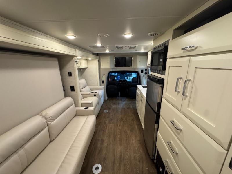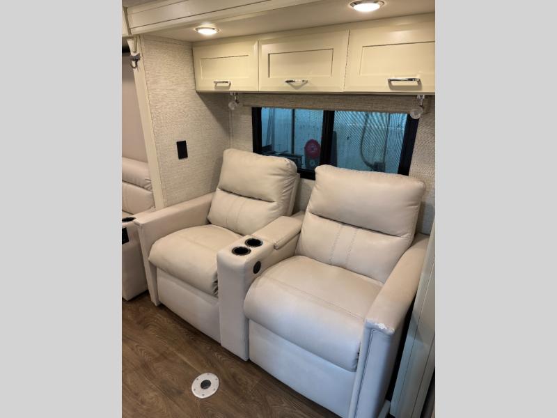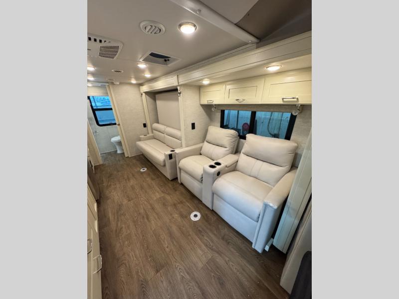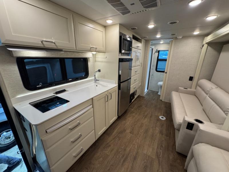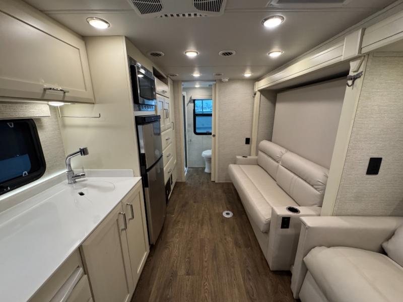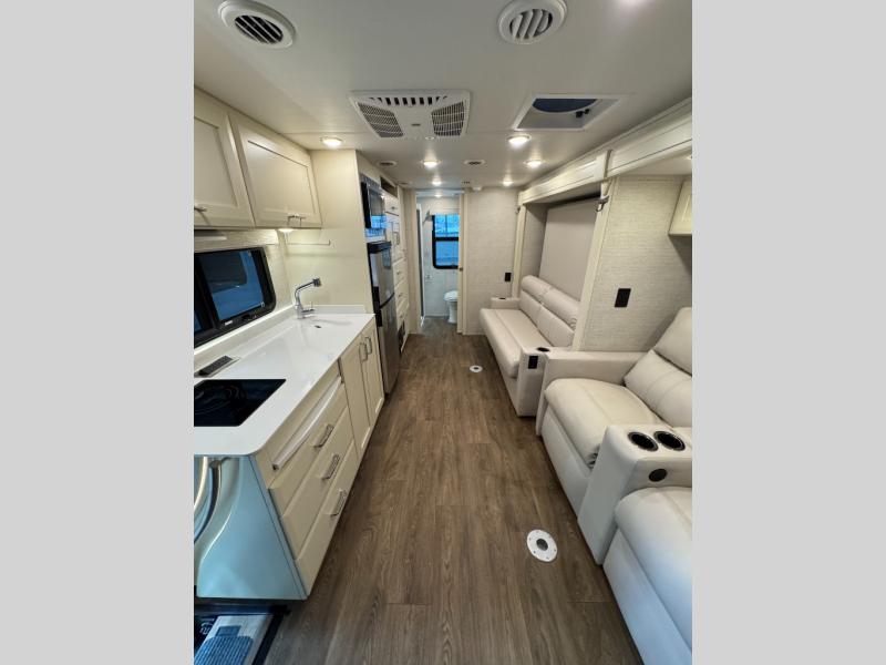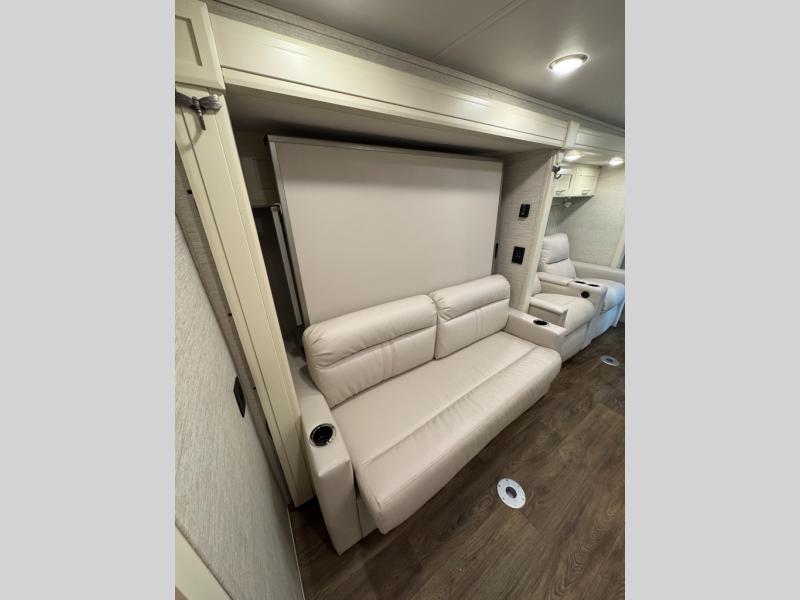 Maximize space and comfort each time you travel in this coach. The queen Murphy bed and sofa allow you to increase your living area each morning after waking up from a good night's rest. You can get cleaned up in the full rear bathroom with space savings sliding door and grab your clothing from the wardrobe or cabinet in front of the bed. There is a 32" TV to watch as well. The theater seats allows two people to recline & relax. The bunk over the cab is another space available for your overnights guests, yet you can choose to add the optional entertainment center in its place. The cook will love the galley kitchen with everything at their fingertips including a handy countertop extension and convection microwave.