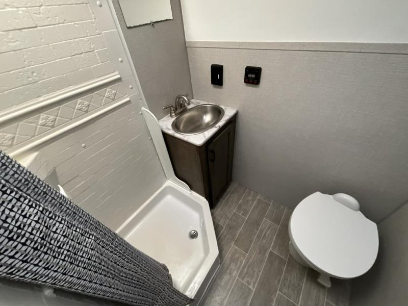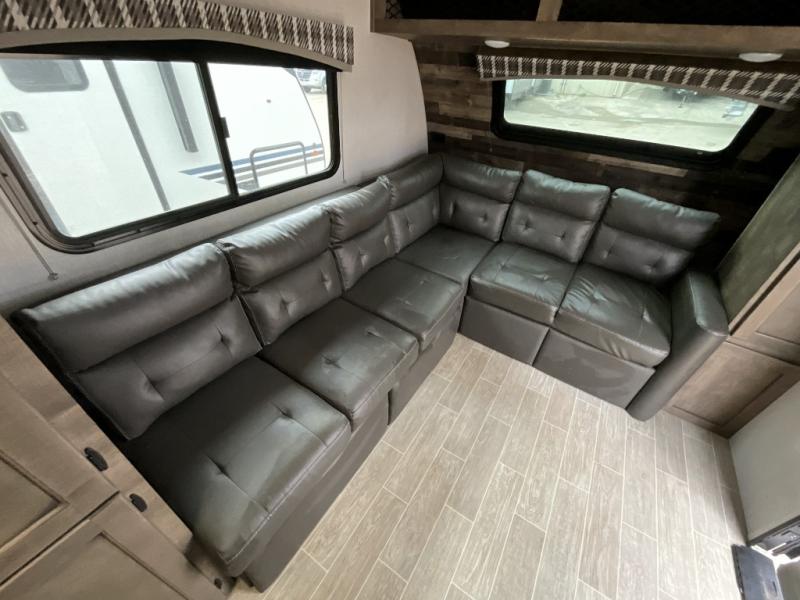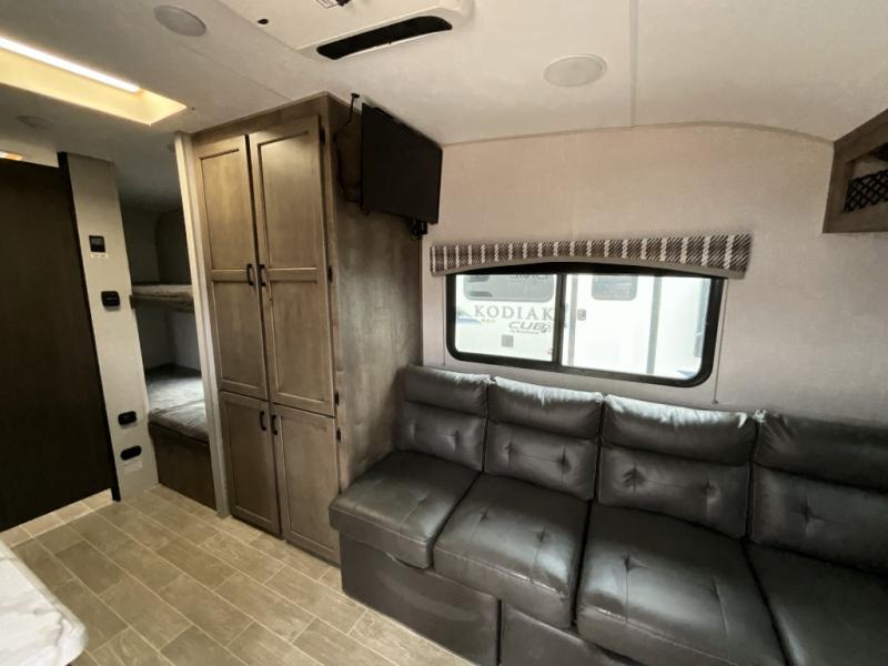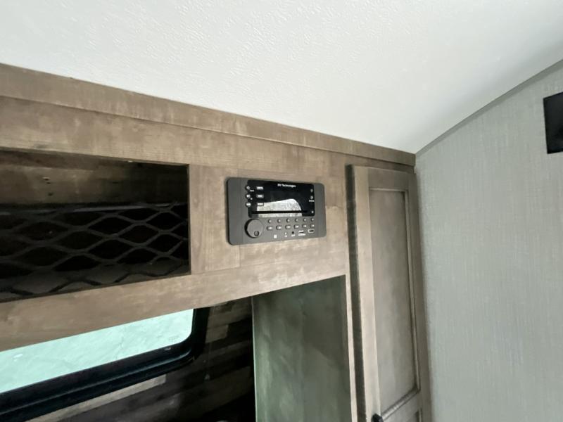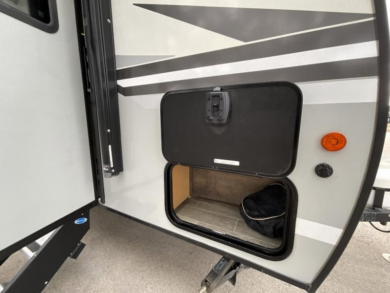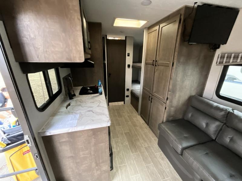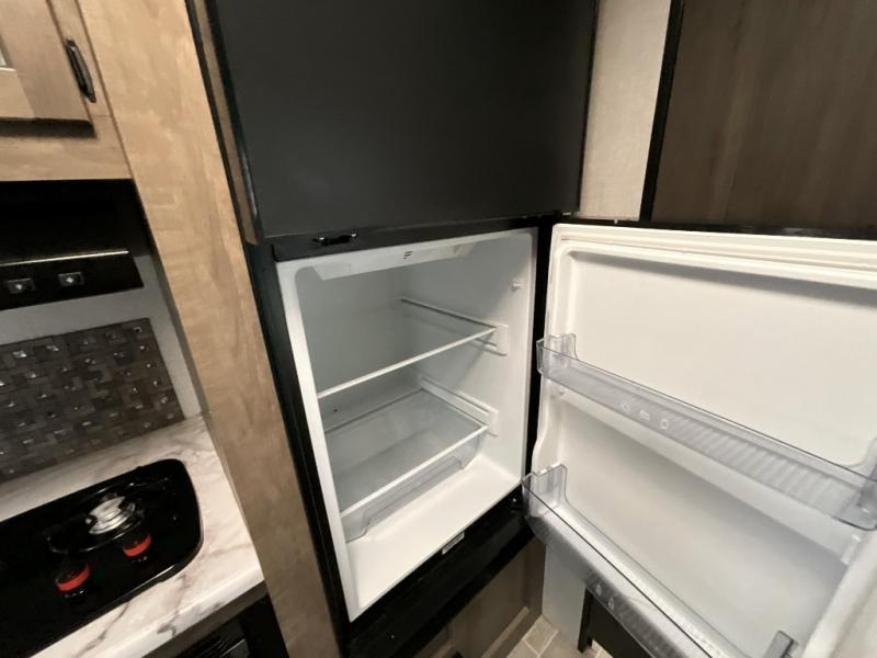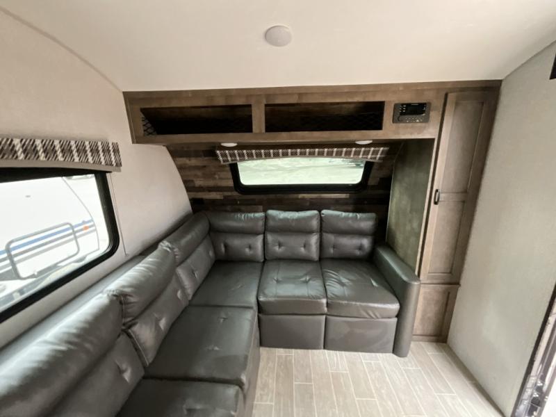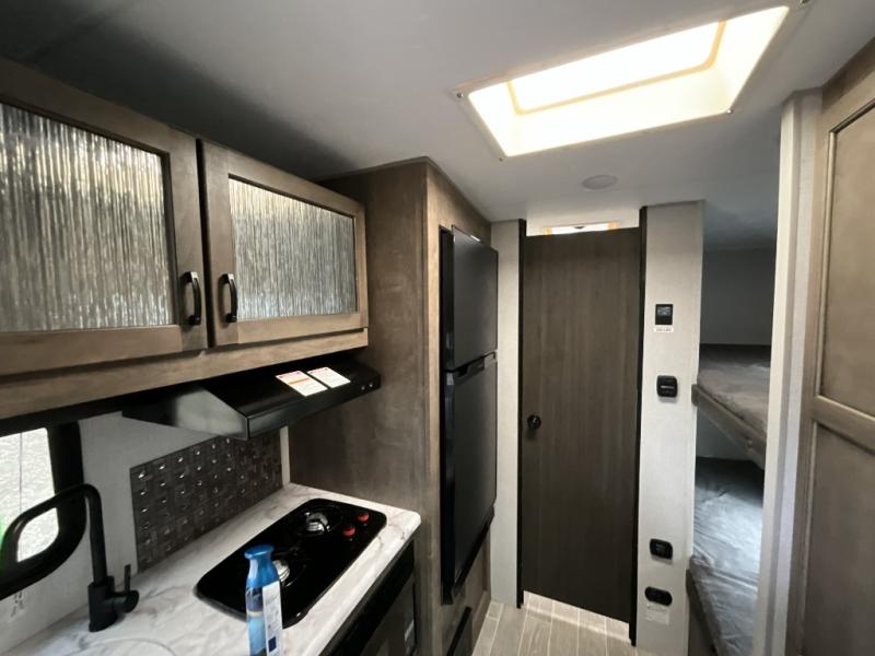 Camp simply with all the comforts of home in this trailer that offers sleeping space for four between the bunk beds near the full bathroom, and the L-lounge sofa that easily converts to a 60" x 75" bed at night. You can use the two ottomans to rest your legs after a hike around the campgrounds, and the removable table to dine at. The cook will enjoy using the two burner cooktop and convection microwave to make meals, and store the leftovers in the 8 cu. ft. refrigerator. And you will find storage in a pantry/closet, overhead cabinets and outside in the pass-through storage with a motion activated light.