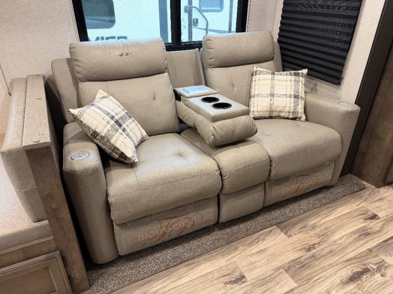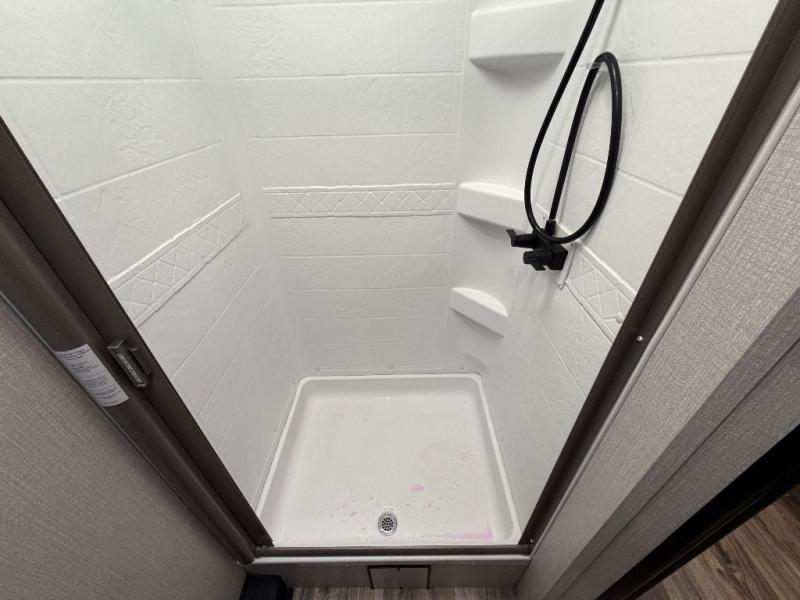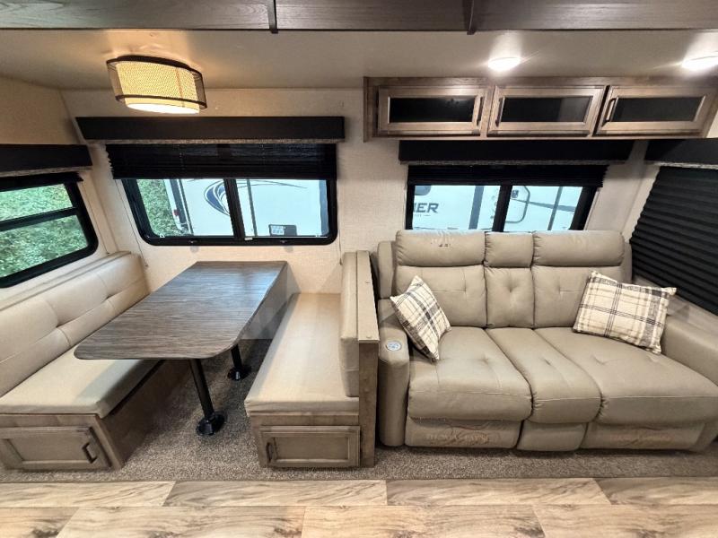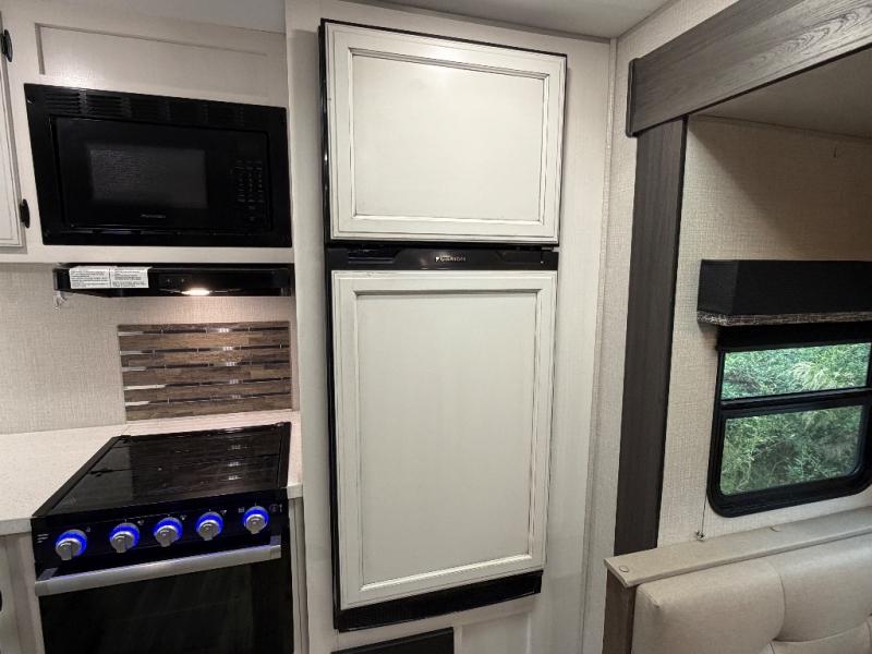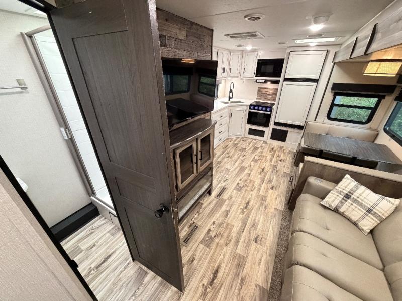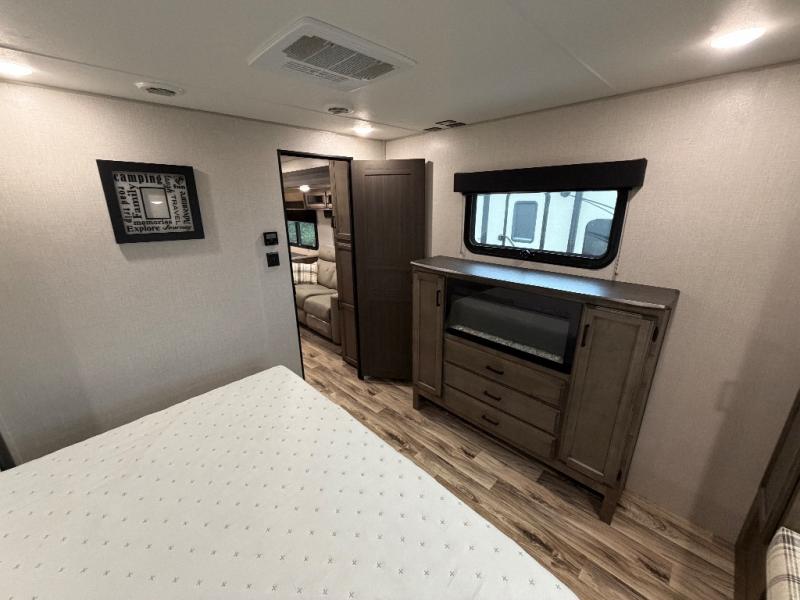 One step inside this travel trailer and you will want to go camping every weekend! You will love the front private bedroom with a front window seat, a slide out king bed, and your own fireplace for a cozy evening. The kids can convert the tri-fold sofa bed or the 42" grand dinette at night for a comfortable sleeping space. Prepare a big breakfast on the three burner cooktop, then take your plate to sit under the 16' power awning outside. After you've filled your day with hiking, you can freshen up in the full bath that includes a 30" x 36" shower. This model also includes plenty of storage, including a walk-in pantry just inside the entry door for convenience!