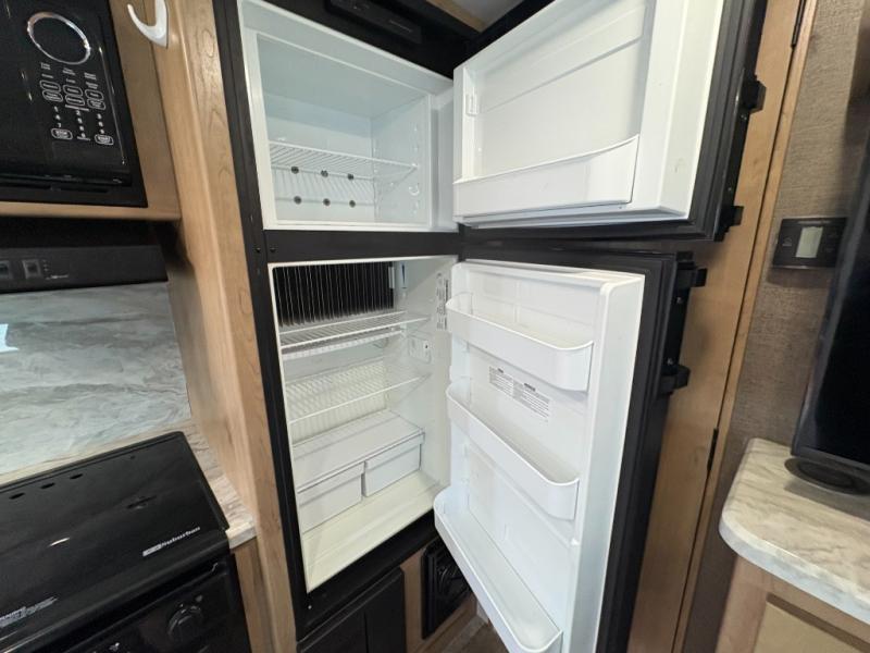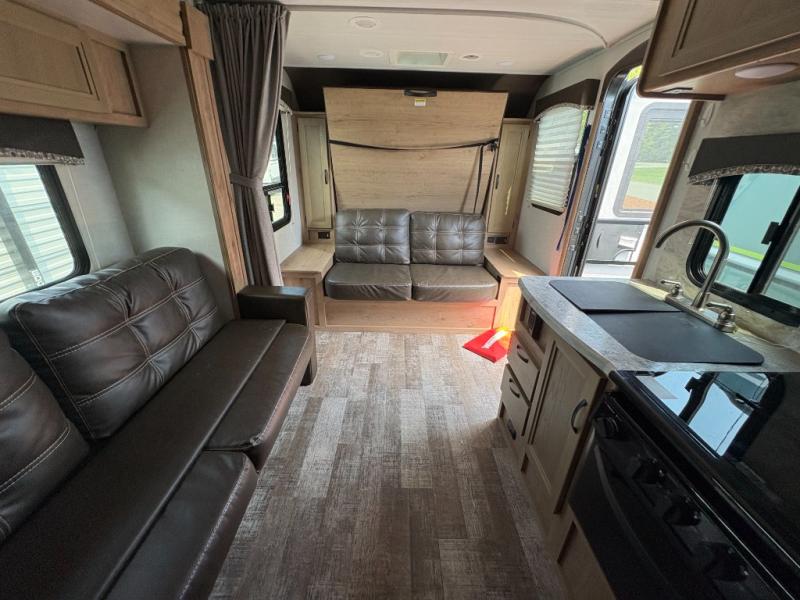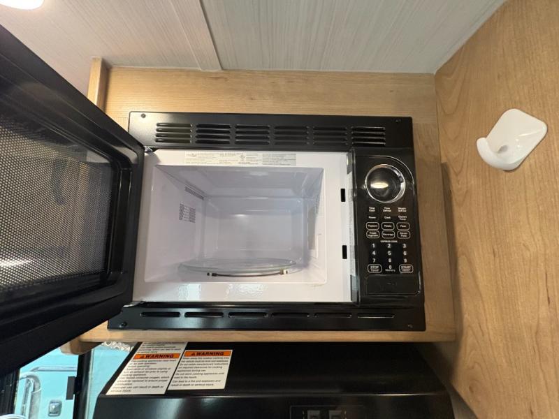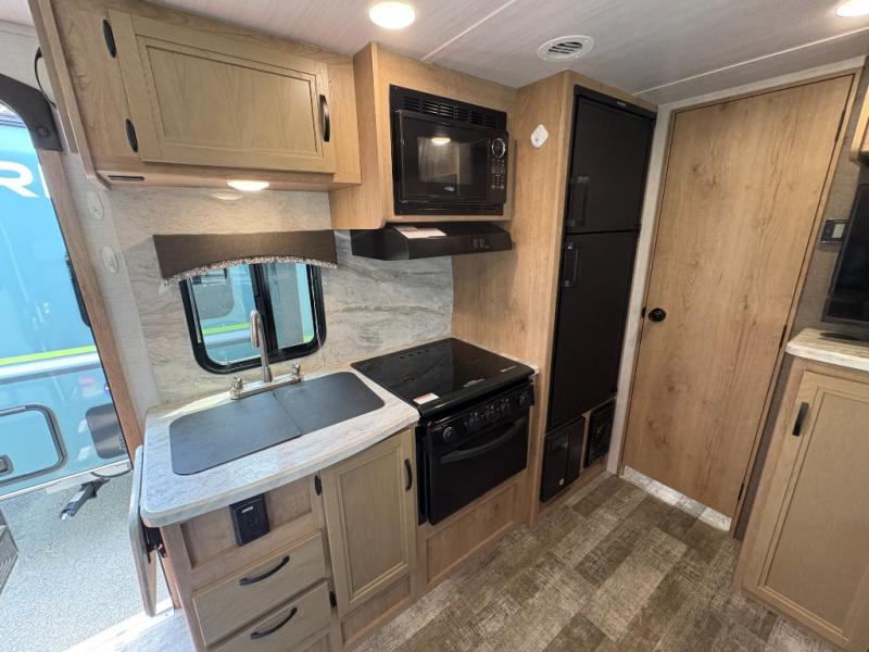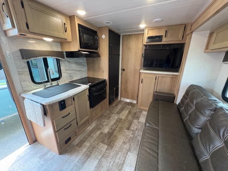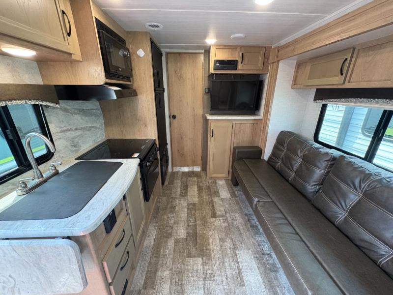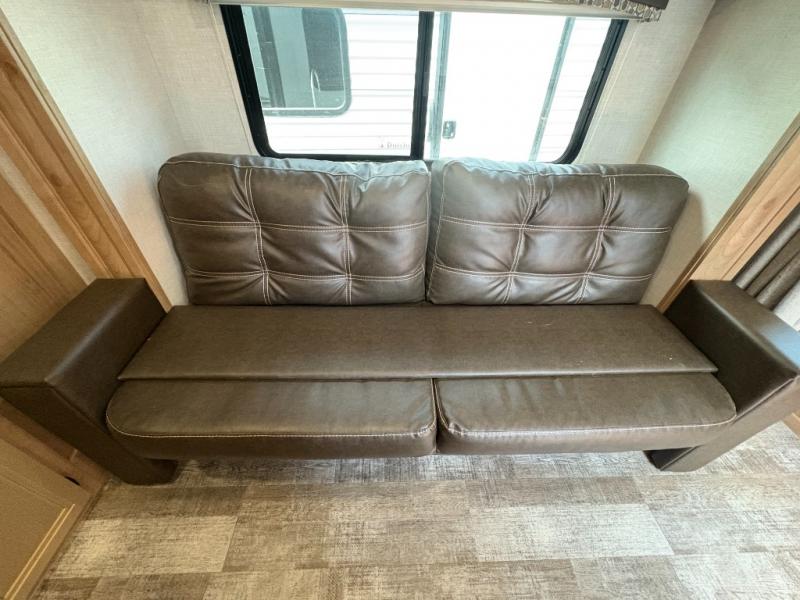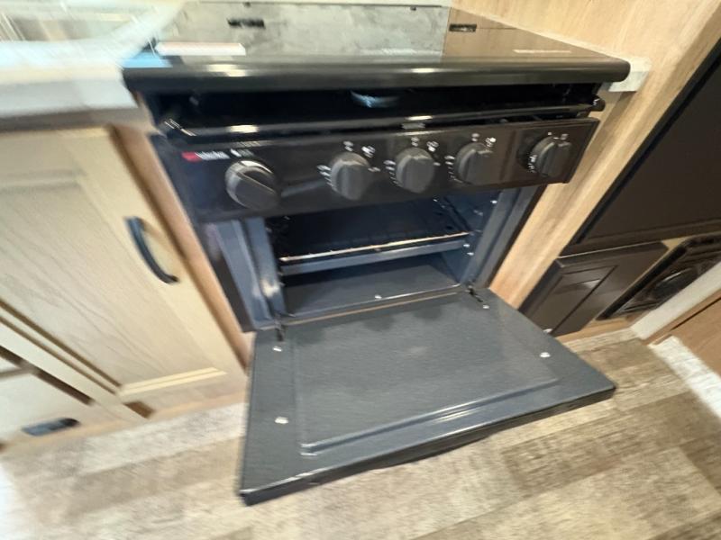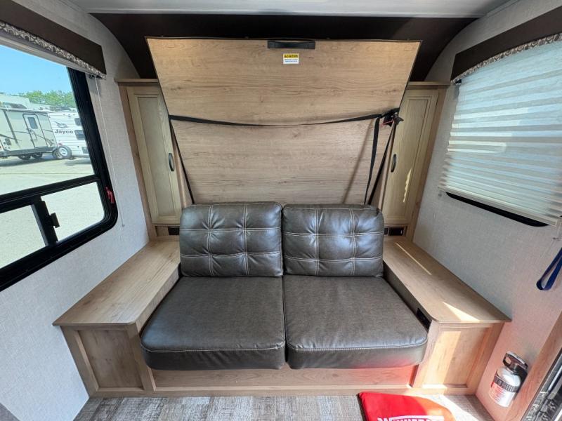 You're going to love the versatility of this travel trailer with the front Murphy bed with a wardrobe on one side and a nightstand on the other side! It also has a sofa slide with a folding table for you to enjoy your meals at and a full rear bathroom with a skylight above the shower and a wardrobe inside to store your linens. You can either whip up a home cooked meal on the three burner cooktop or pop some pizza rolls into the microwave to eat while you watch your favorite movie on the LED TV!
