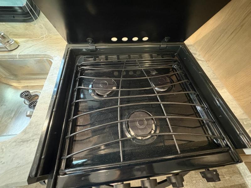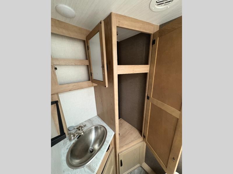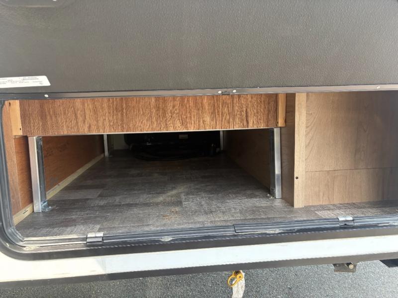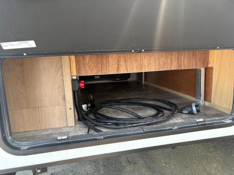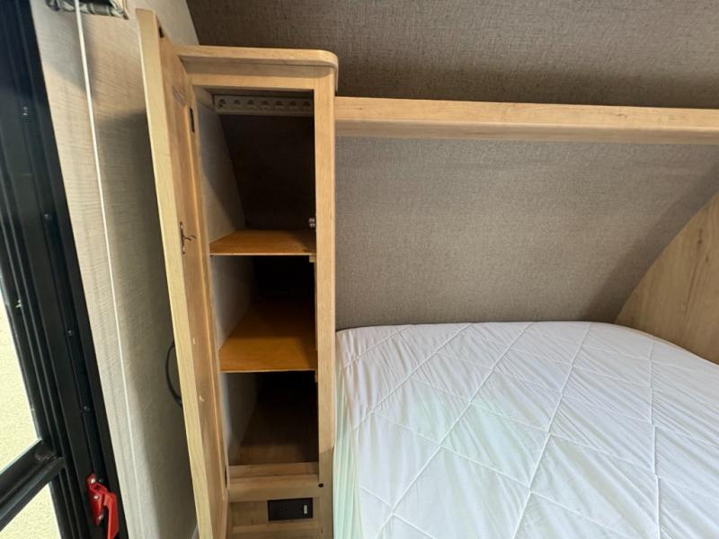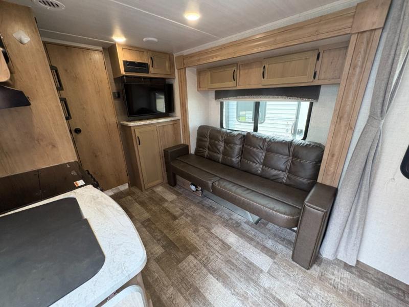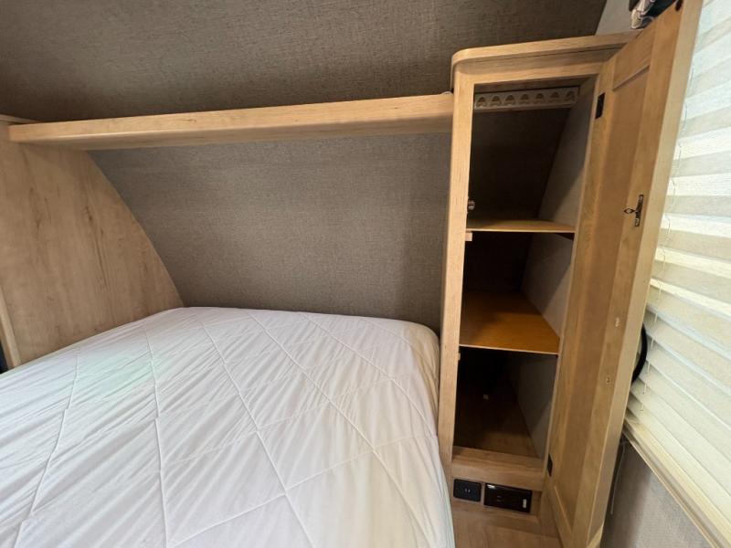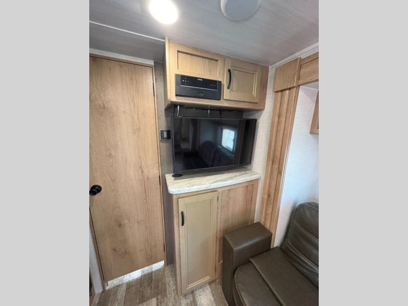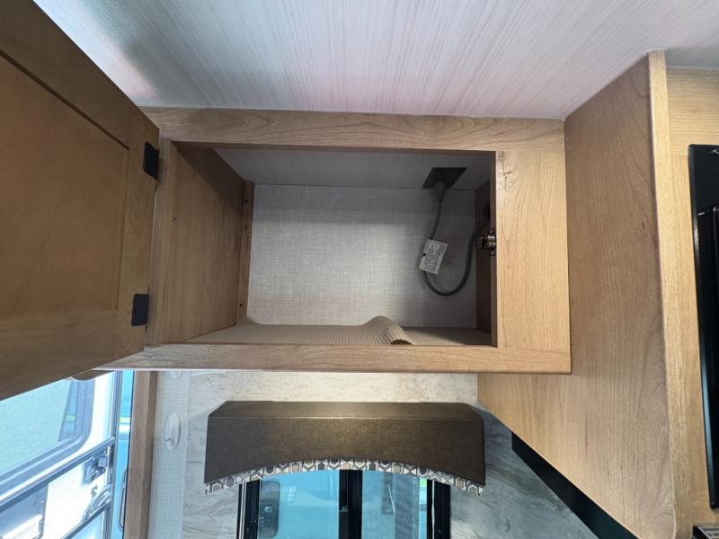 You're going to love the versatility of this travel trailer with the front Murphy bed with a wardrobe on one side and a nightstand on the other side! It also has a sofa slide with a folding table for you to enjoy your meals at and a full rear bathroom with a skylight above the shower and a wardrobe inside to store your linens. You can either whip up a home cooked meal on the three burner cooktop or pop some pizza rolls into the microwave to eat while you watch your favorite movie on the LED TV!