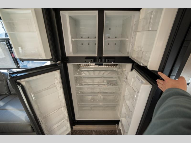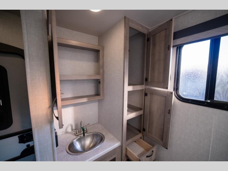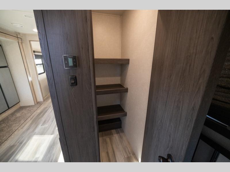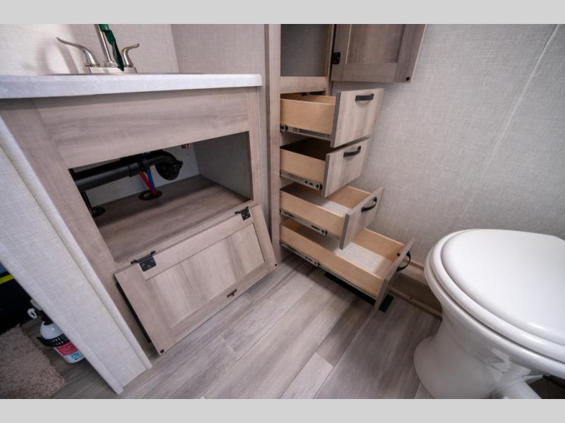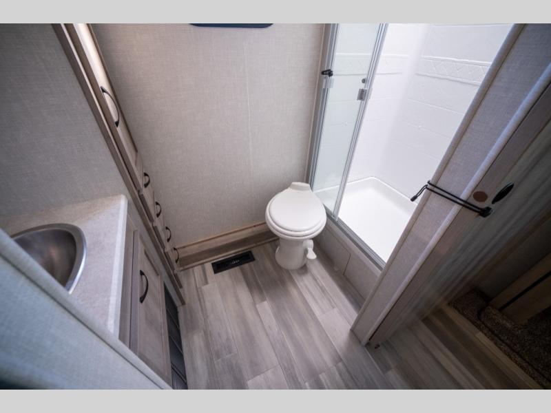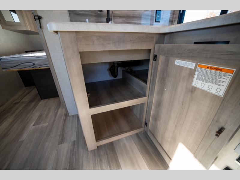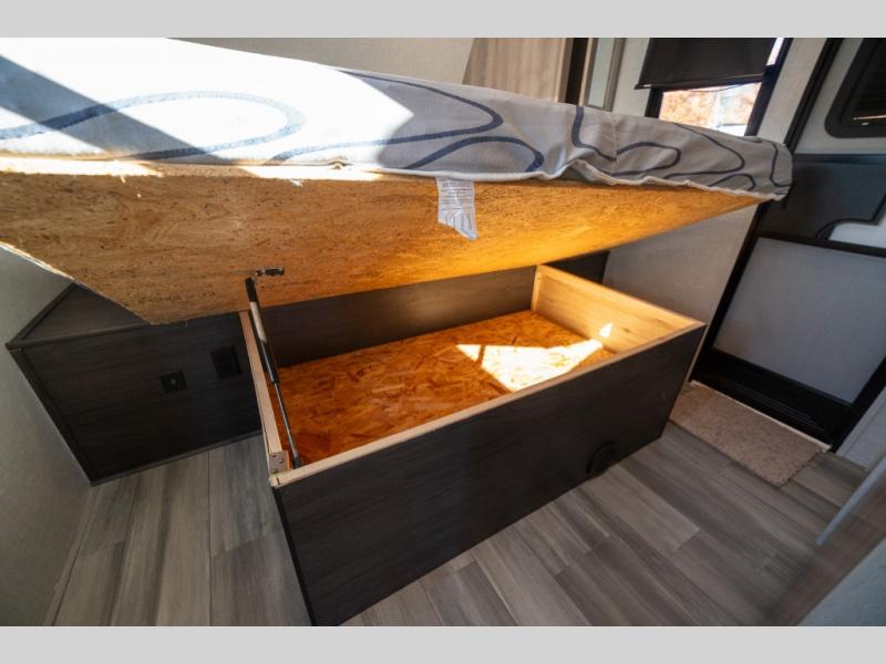Just think about all of the excursions you can plan with this Voyage travel trailer! From backpacking in the mountains to lounging by the lake, you will be able to do it all when you have these home-like comforts to return to. The front private bedroom provides you with a queen-size bed so that every night is comfortable, and the full rear bathroom has a large skylight above the shower and a large medicine cabinet with mirror for your morning routine. Sit back on the tri-fold sofa and enjoy the view of the entertainment center. You can also reach into the pantry right next to you to grab a little snack if you get hungry.