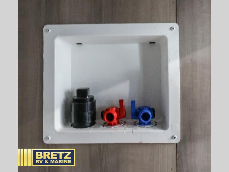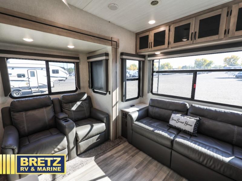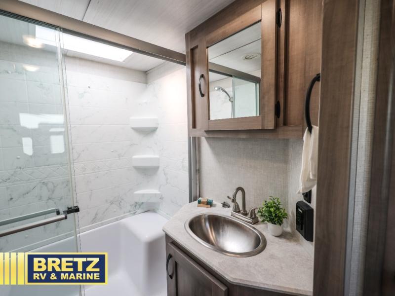 As you spend time lounging on the tri-fold sofa or in the theater seating on this Voyage fifth wheel, you'll be glad to have extra living space because of the opposing slides! You can keep your meals simple, or you can make all of the family favorites with the recessed three-burner cooktop, convection microwave, and 10.3-cubic foot refrigerator. Then, you can sit down with that meal at the free-standing table with chairs. Clean up the dishes like a pro using the high-rise pull-out faucet in the sink on the kitchen island, and then reward yourself by watching your favorite show on the LED TV. When you need to get changed for bed, you can find your clothes in the dresser and full-width wardrobe within the front bedroom.