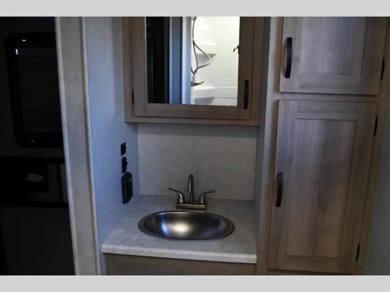 Just think about all of the excursions you can plan with this Voyage travel trailer! From backpacking in the mountains to lounging by the lake, you will be able to do it all when you have these home-like comforts to return to. The front private bedroom provides you with a queen-size bed so that every night is comfortable, and the full rear bathroom has a large skylight above the shower and a large medicine cabinet with mirror for your morning routine. Sit back on the tri-fold sofa and enjoy the view of the entertainment center. You can also reach into the pantry right next to you to grab a little snack if you get hungry.