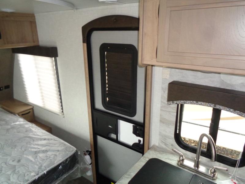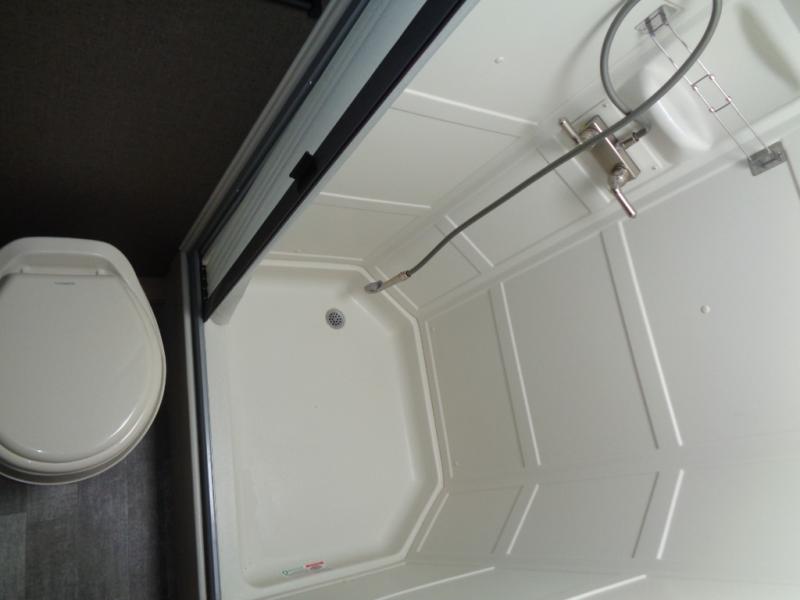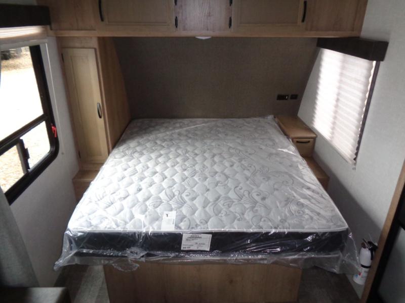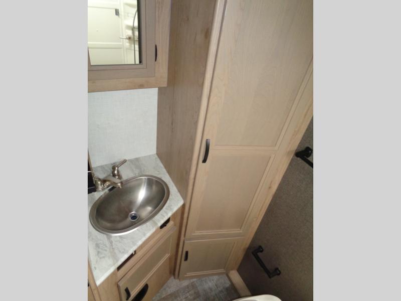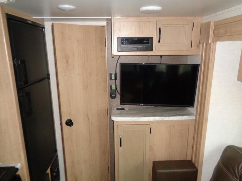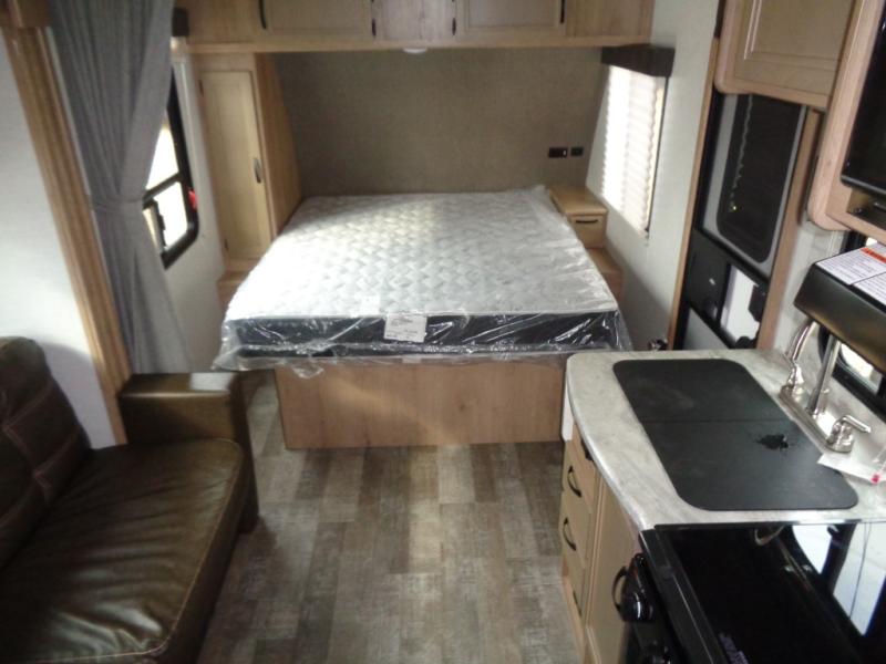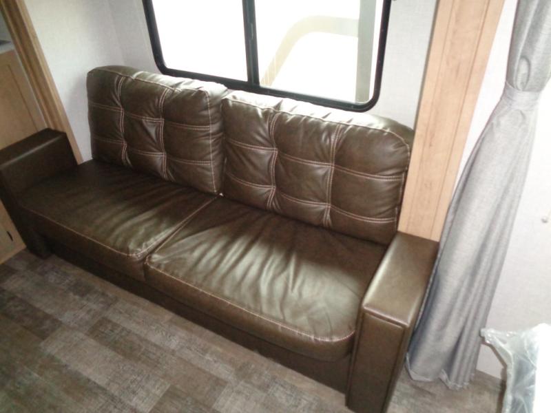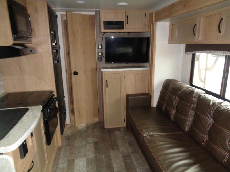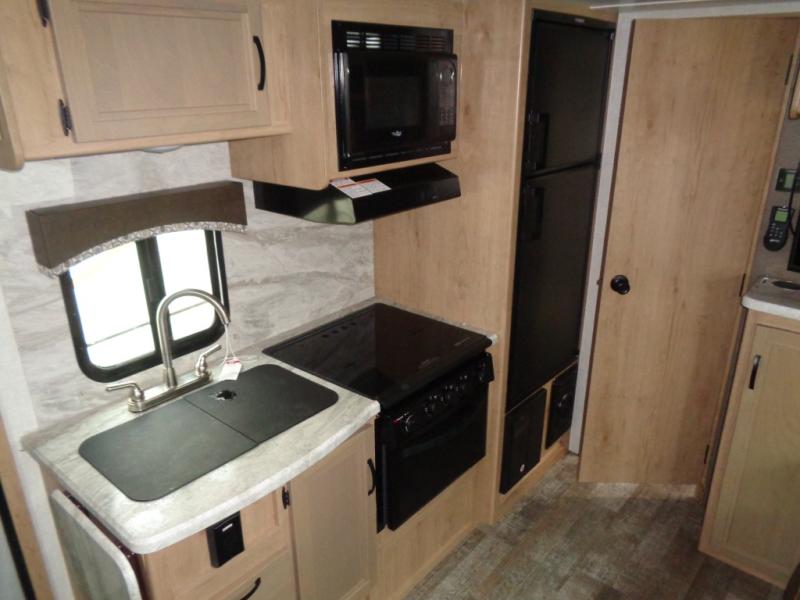Why stay in a tent when you can camp in this travel trailer! Draw back the privacy curtain after waking up from the front RV queen bed and head to the rear full bathroom to get cleaned up for the day in the shower with a skylight to let in some sunlight as you get ready. Grab the eggs and bacon from the 10.3 cu. ft. refrigerator to cook on the three burner cooktop then head to the sofa slide and use the folding table to set your meal on. If mother nature rains on your parade then you can either stay indoors and watch a movie on the LED TV or sit underneath the power awning with LED lights and patio speakers to take in the beauty!