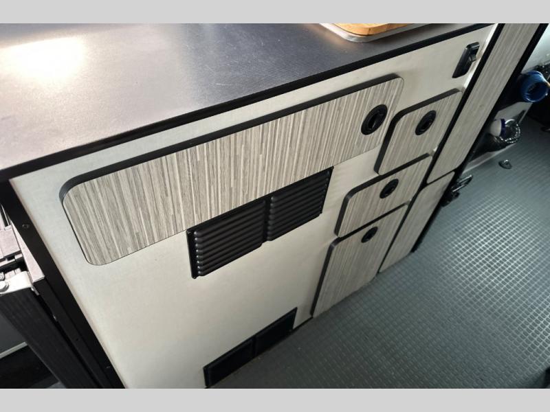 With the Revel class B diesel motorhome you will appreciate the On-Demand 4WD, 4-wheel ABS brakes, and a 3.0L 6-cylinder turbo-diesel engine, so you can travel anywhere you wish and the 200 watt solar power system allows you to go off-grid. You'll find many indoor conveniences you won't want to travel without, including a 3.0 cu. ft. compressor driven refrigerator/freezer, a single burner induction cooktop, under-bed gear garage storage with six removable cargo tie-downs anchors, and two removable shelves that convert the wet bath into a storage cabinet if you choose. These units also include rear mud guards, a movable ladder, a luggage rack, and a fold-down exterior table just to name a few outdoor features!