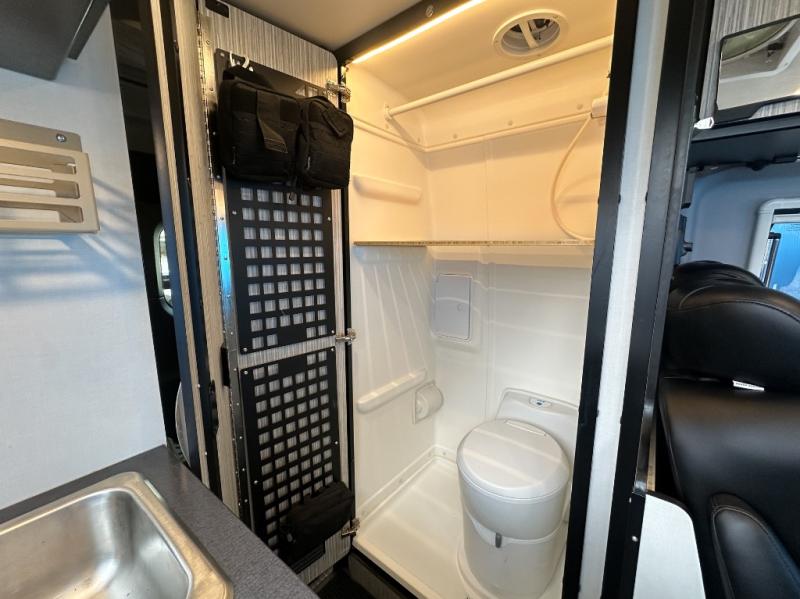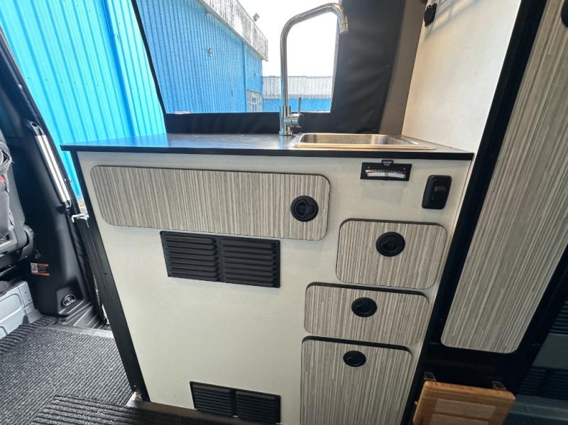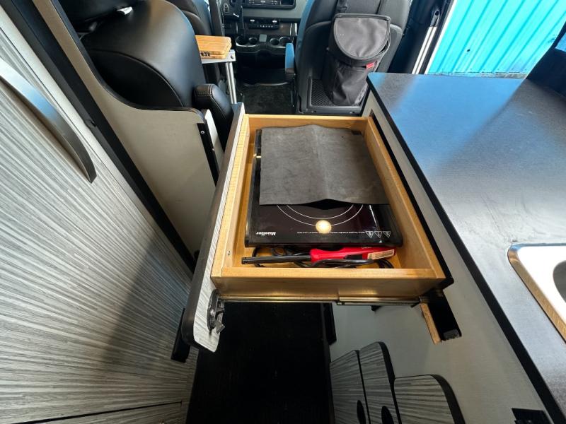 With the Revel class B diesel motorhome you will appreciate the On-Demand 4WD, 4-wheel ABS brakes, and a 3.0L 6-cylinder turbo-diesel engine, so you can travel anywhere you wish and the 200 watt solar power system allows you to go off-grid. You'll find many indoor conveniences you won't want to travel without, including a 3.0 cu. ft. compressor driven refrigerator/freezer, a single burner induction cooktop, under-bed gear garage storage with six removable cargo tie-downs anchors, and two removable shelves that convert the wet bath into a storage cabinet if you choose. These units also include rear mud guards, a movable ladder, a luggage rack, and a fold-down exterior table just to name a few outdoor features!