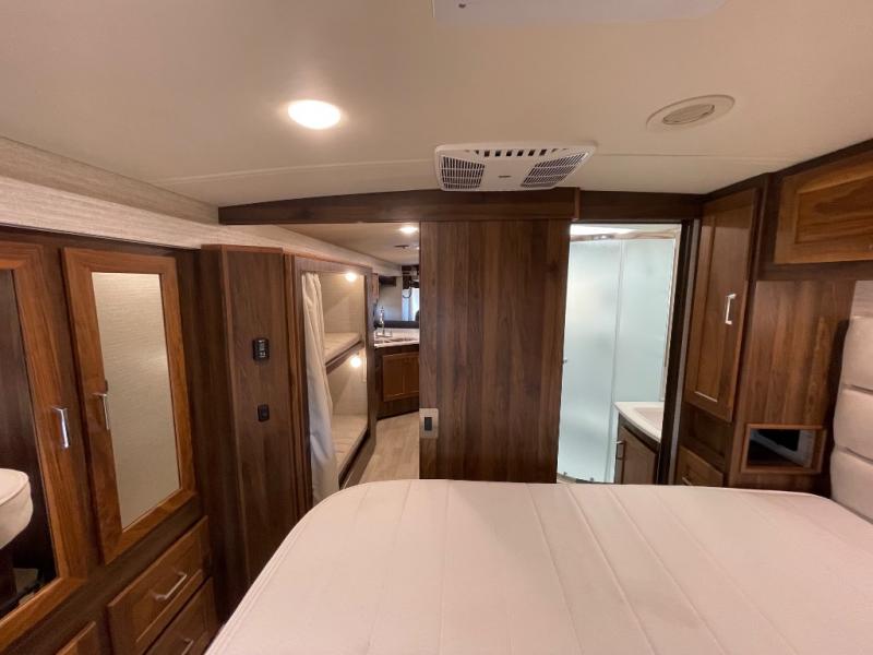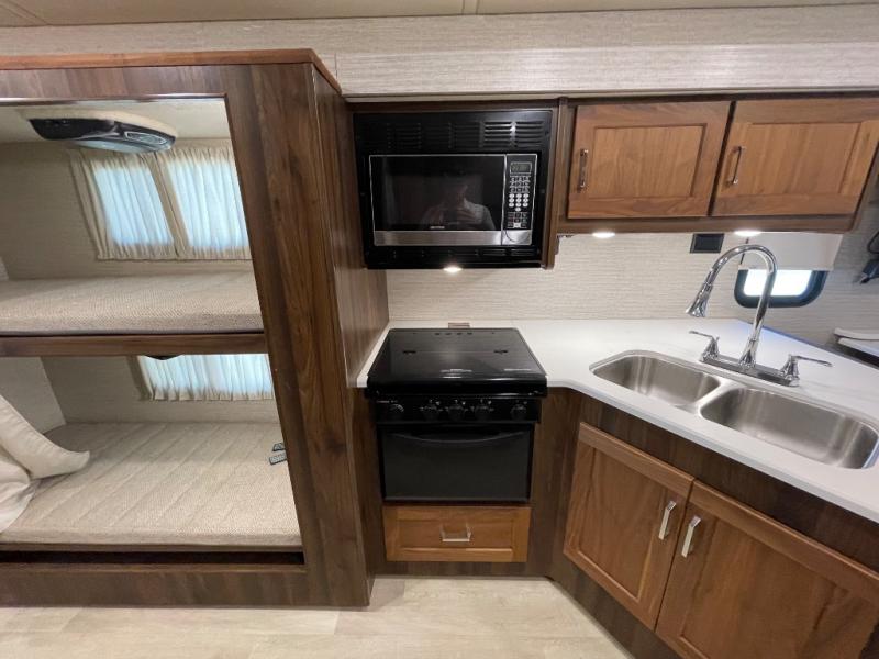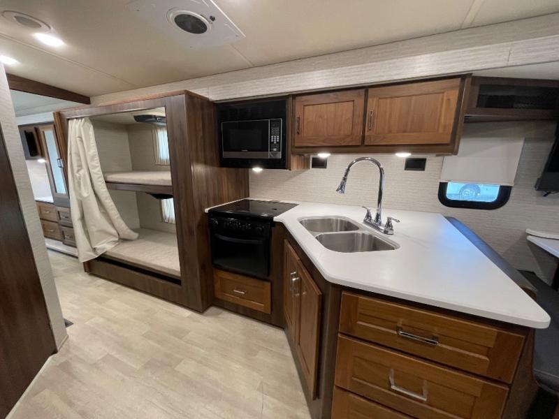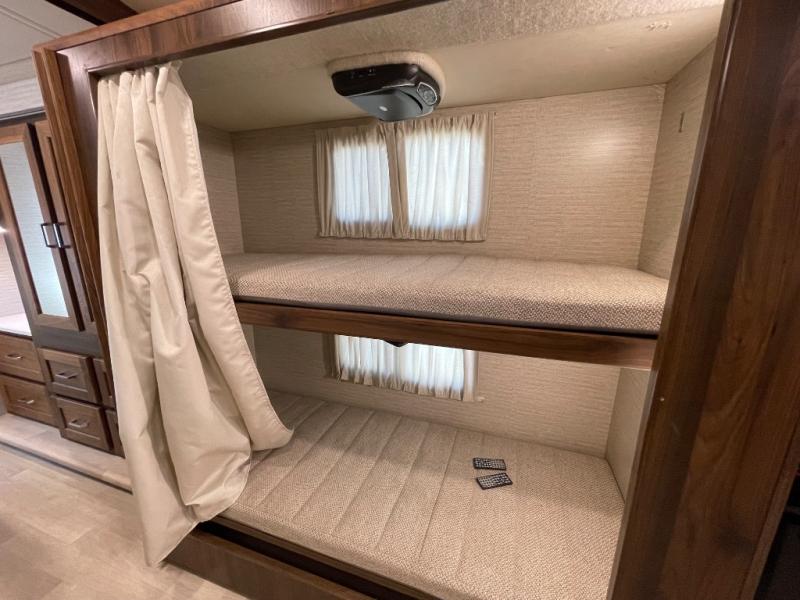 This family-friendly coach gives your kiddos bunk beds and furniture to sleep on as well as an optional StudioLoft bed if your family needs two more sleeping spaces. You and your spouse will have your own walk-around queen bed in the rear private bedroom with space savings sliding door, a wardrobe and more storage for all your things and maybe you add the optional TV. The full bathroom even has two entries making this another convenience especially at night. The kitchen provides everything needed to keep everyone fed, and the dinette with Hi-Lo table, the sofa/bed plus the swivel driver and passenger seat offer a place to gather after having fun outdoors.