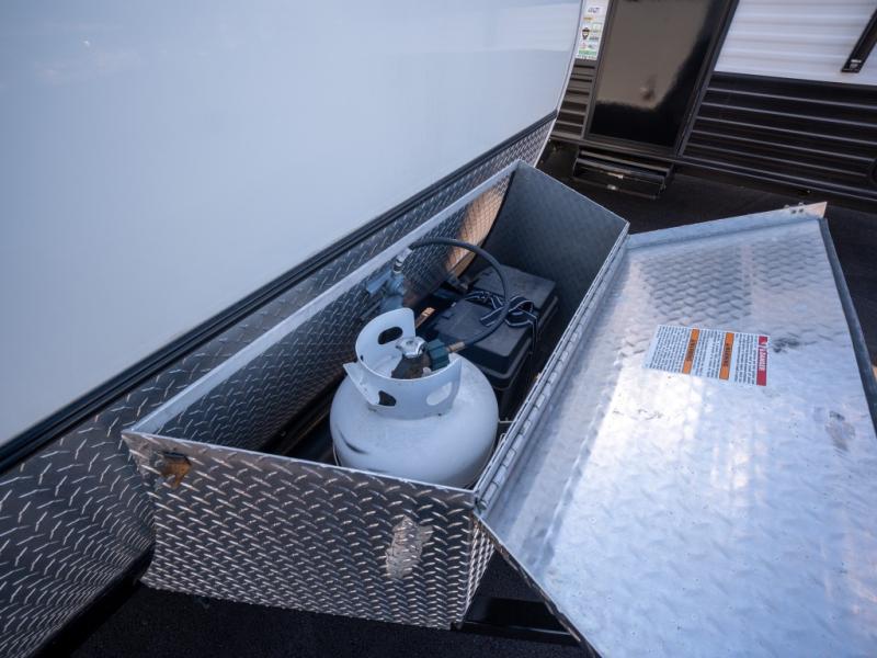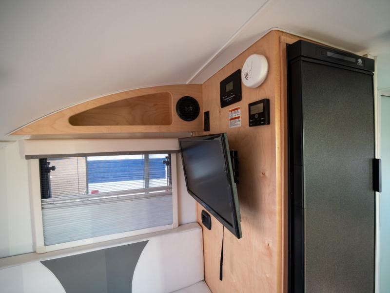 With the Xtreme Outdoors teardrop trailer your exterior is built with tubular steel chassis construction with automotive paint finish, aluminum-framed sidewalls and roof, and a one-piece seamless fiberglass roof. Inside, you will love the 100% hardwood cabinetry with dovetail construction, and the 13,500 BTU roof-mounted air conditioner to keep you cool in the summer, plus much more depending on the model you choose.. You will also find that there are plenty of upgrades to choose from, such as a flexible Zamp solar panel, a Jack-It bike carrier, the Rough Rider package and a Thule awning.