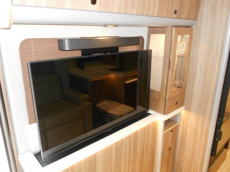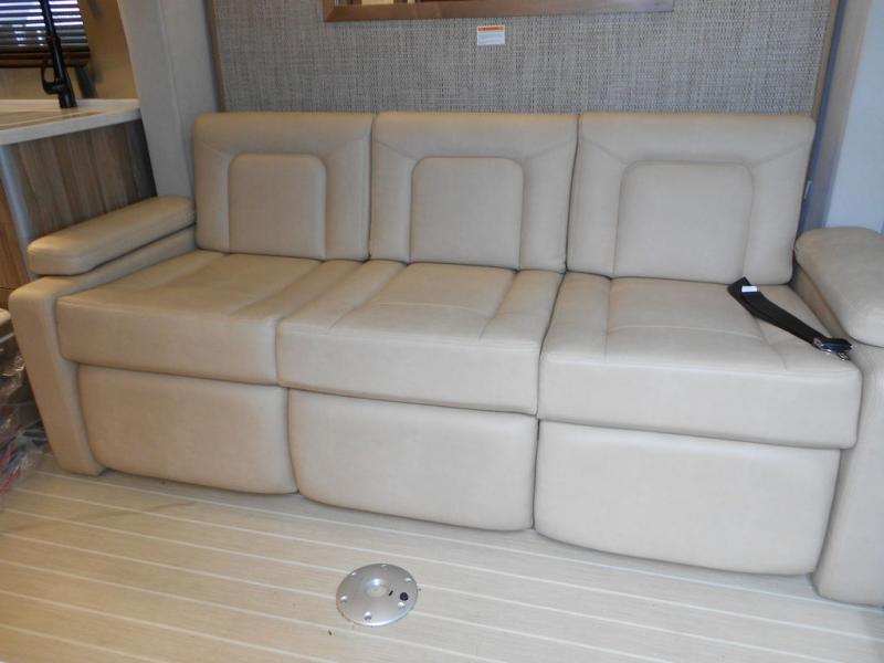 Get ready to explore, unwind and "glamp" where ever you decide! This coach brings you everything you will need, plus much much more! The power slide offers a Murphy suite that retracts and fits seamlessly with the luxury automotive body style. With a touch of a button on the multiplex control panel, you will have more floor space to relax on the reclining sofa that includes two seatbelts or pull down the Murphy bed at night. There is more seating on the captain's chairs that swivel around to face the interior, and there are two tables that adjust to different heights for your needs. The kitchen provides a two-burner gas stove and large stainless steel Kohler sink and faucet, and there is a convection microwave, a slide-out pantry and a refrigerator with freezer a few steps away.