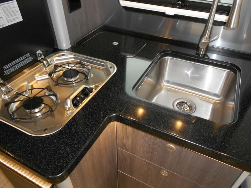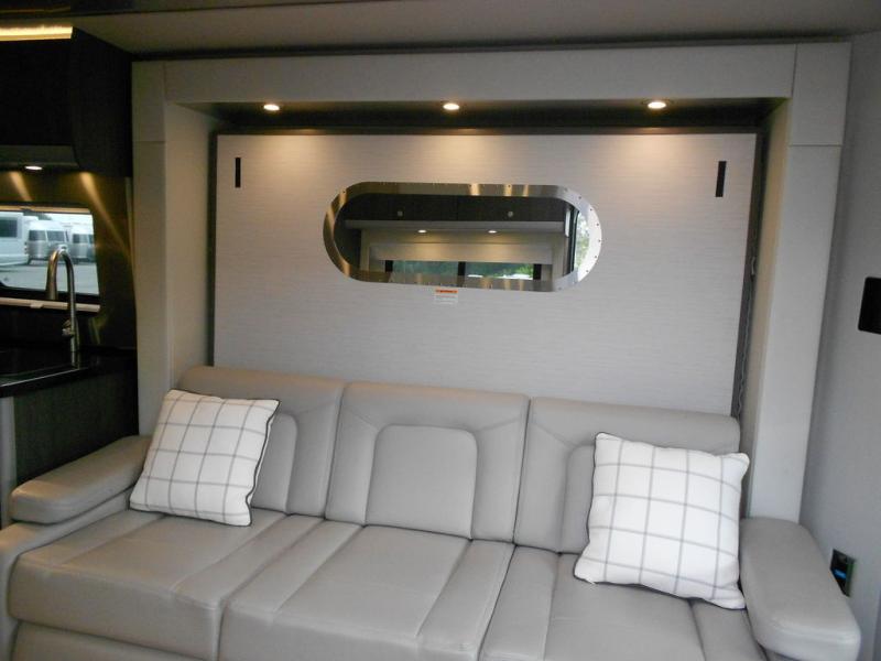 Get ready to explore, unwind and "glamp" where ever you decide! This coach brings you everything you will need, plus much much more! The power slide offers a Murphy suite that retracts and fits seamlessly with the luxury automotive body style. With a touch of a button on the multiplex control panel, you will have more floor space to relax on the reclining sofa that includes two seatbelts or pull down the Murphy bed at night. There is more seating on the captain's chairs that swivel around to face the interior, and there are two tables that adjust to different heights for your needs. The kitchen provides a two-burner gas stove and large stainless steel Kohler sink and faucet, and there is a convection microwave, a slide-out pantry and a refrigerator with freezer a few steps away.