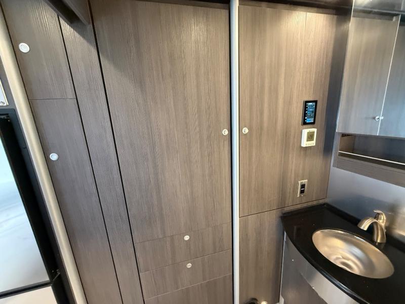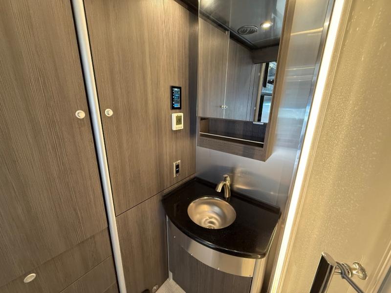 - Residential-Style Rear Bathroom: The bathroom spans the entire rear of the coach and features a large corner shower with a teak inlay, a Kohler® sink and faucet, and a cedar-lined wardrobe closet. A tankless water heater provides continuous hot water.