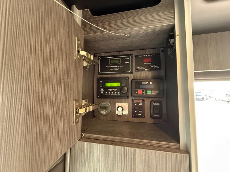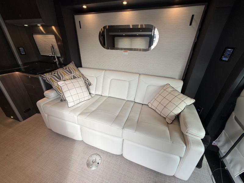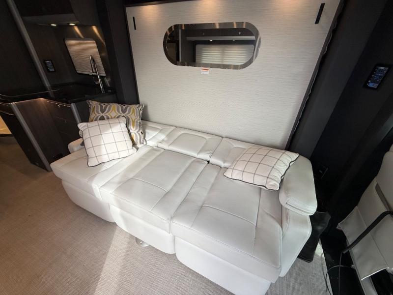 - Power Slide-Out Murphy Suite: A prominent feature, the slide-out expands the interior living space at the touch of a button when parked. It houses a power sofa that converts into a 73" x 73" Murphy bed with a Froli ergonomic bed support system for comfort.