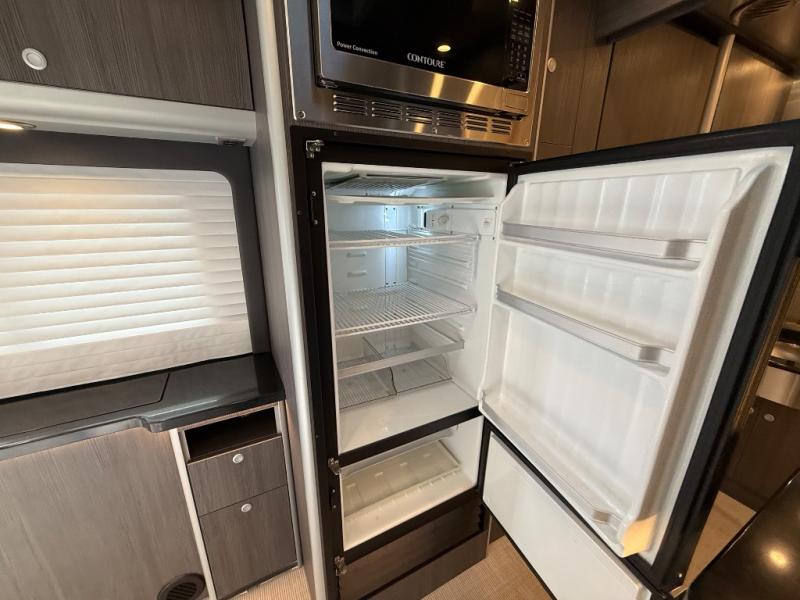 - High-End Galley: The kitchen is equipped with a 9.1 cu. ft. 12-volt refrigerator with freezer, a 1.1 cu. ft. convection microwave, a two-burner cooktop with an integrated cover, and a large stainless steel Kohler® sink.