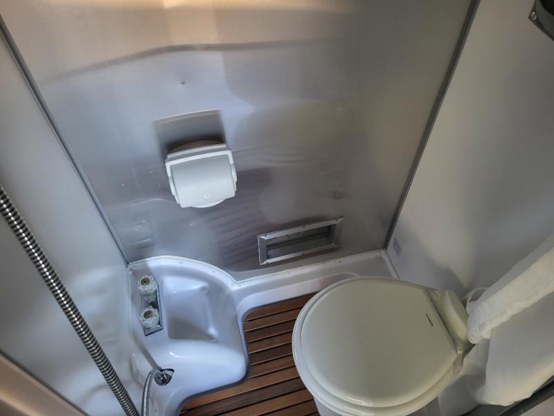 Looking for three extra inches of road clearance in an aerodynamic and easy to tow trailer? This 16X includes a black shadow window design, Goodyear all-terrain tires, solar front window protection, and stainless steel rock guards for protection against road debris. You can sleep two on the split benches or convert the half-bed on one side and the full bed that spans the back of the trailer. The two tables with benches allow you to dine with seating for five, surf the web, read a book and you can store the tables under the cushions. Get cleaned up in the wet bath complete with a shower, toilet and sink. And the cook will love the views while using the two-burner gas stove, sink and refrigerator. This Basecamp also offers front panoramic windows, storage above the propane tanks, solar panel input, and a rear hatch allowing you to take your snowboards, skis, paddleboards and/or kayaks, plus an exterior shower and optional solar panels, plus more!