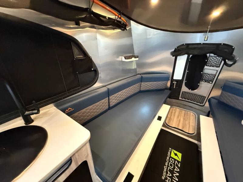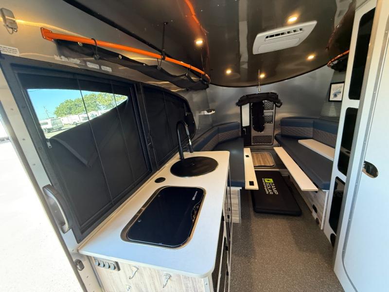 toilet so you can rinse off from a day outdoors, the galley kitchen gives the cook a place to make warm meals and store drinks and leftovers. This Basecamp also offers front panoramic windows, storage above the propane tanks, solar panel input, and a steel entry step. There is also a full-size spare tire, cast aluminum LED tail light and a rear hatch allowing you to take your snowboards, skis, paddleboards and/or kayaks, plus an exterior shower and optional solar panels.