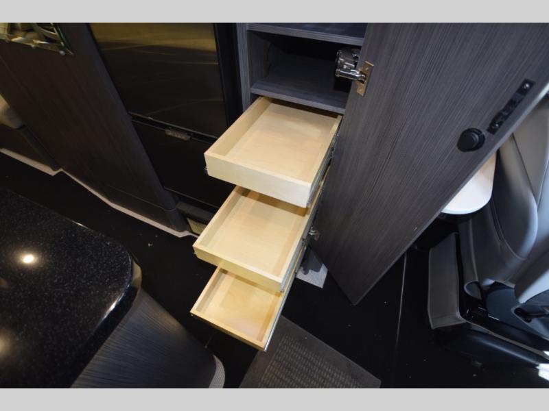 • Swiveling captain’s chairs that seamlessly convert the cab into a functional living space