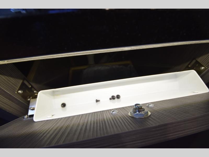 • Built-in workstation with Corian countertop—perfect for remote work, dining, or trip planning on the road