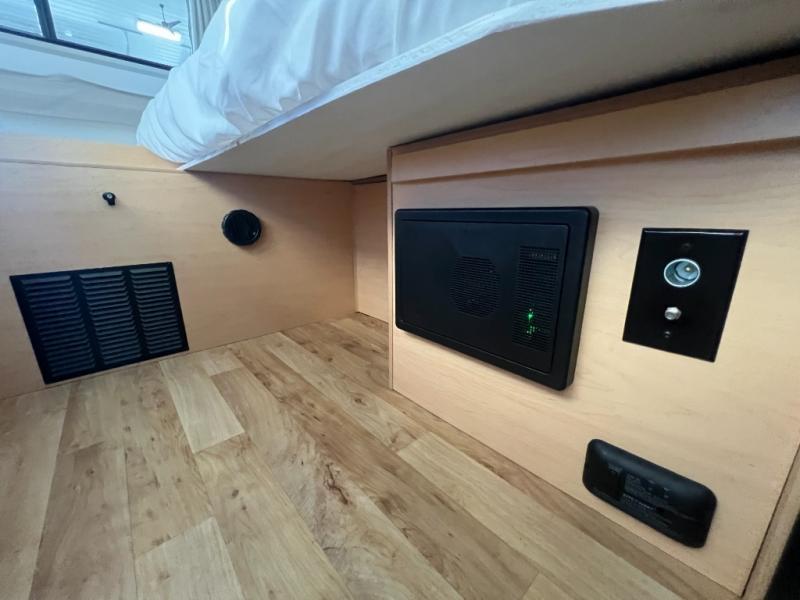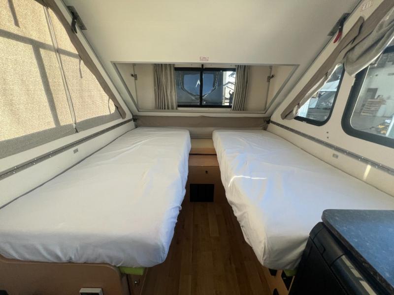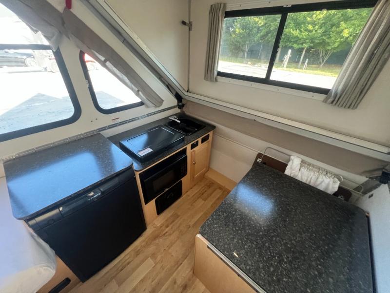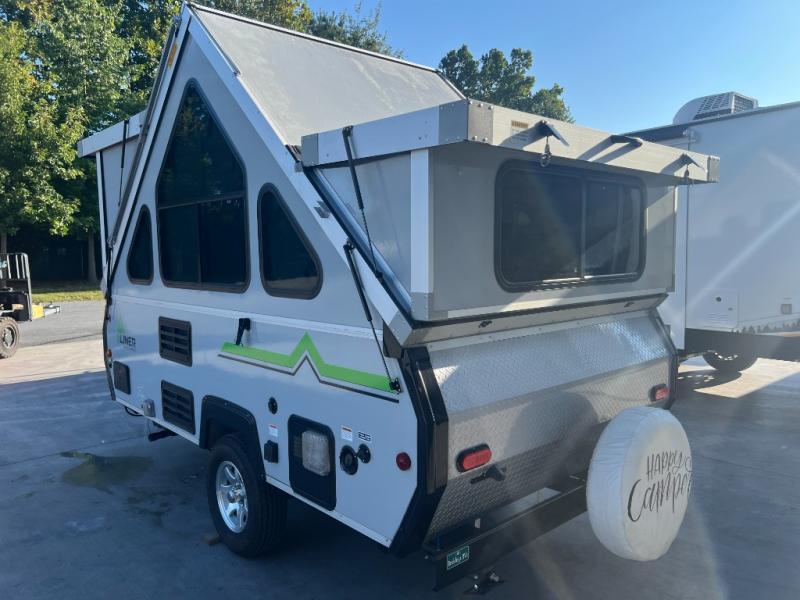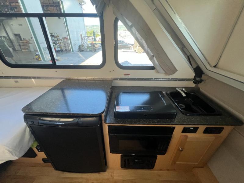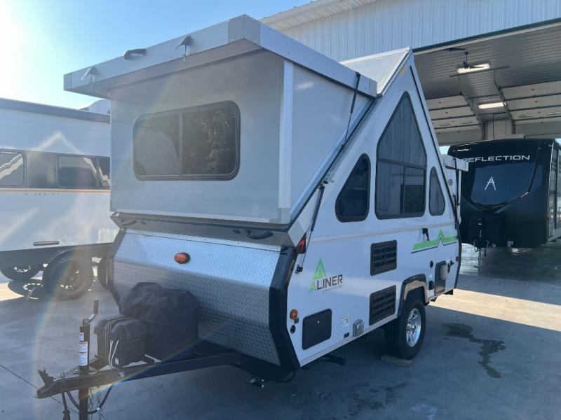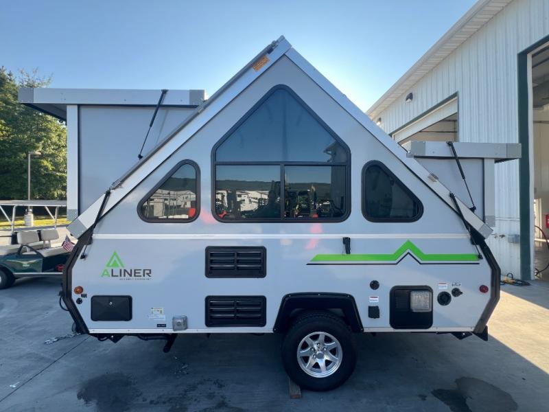 With the LXE A-frame camper by Aliner, the construction includes a tubular steel frame that is E-coated with a powder coating on the front tongue and bumper, an Azdel lightweight, thermoplastic composite interior wall and ceiling panels, and vacuum bonded fiberglass panels, plus Performax 500 premium marine grade flooring for durability. Some extra features include high wind lift assist, additional corner windows, and a command A/C heat pump. Inside, there are high density foam, hypoallergenic cushions, a two-way refrigerator with freezer, a shower and toilet combo, and a microwave, plus three interior electrical outlets to keep the electronics charged, and two skylights with night shades. And there are options to enhance your LXE such as adding a front or rear hard dormer, an outside grill and/or the Extreme Off Road package.