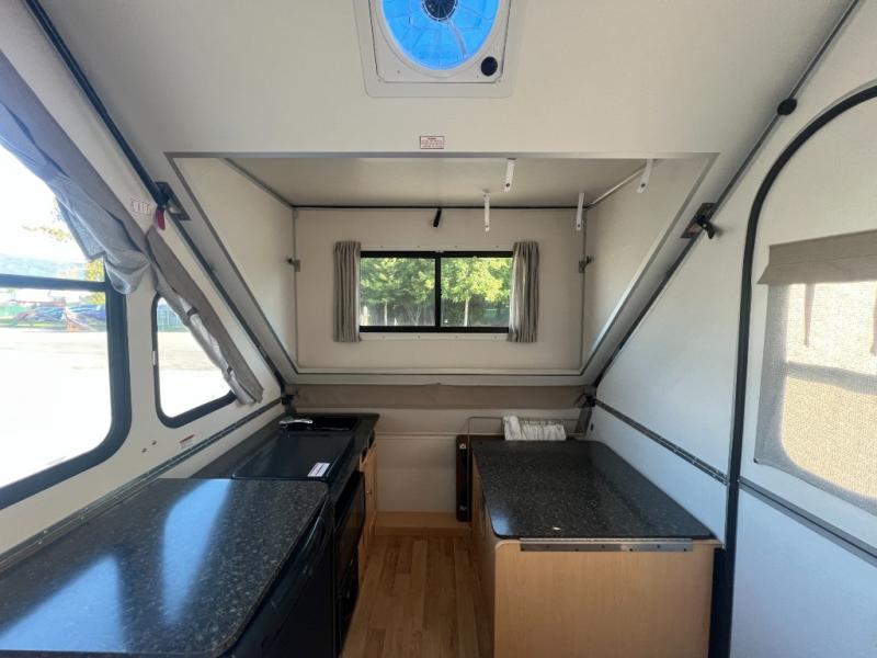 Versatile, comfortable, and convenient indoor living while camping can be found throughout this camper! The built-in shower with cassette toilet offers convenience and a place to clean up each morning, the 3.0 cu. ft. two-way refrigerator offers cold storage, and the microwave plus two burner stove allows you to make warm meals. Eat your meals while sitting on the sofa bed or at the dinette with two seats. And the sofa bed converts into an 80" x 76" bed for a great night's rest!