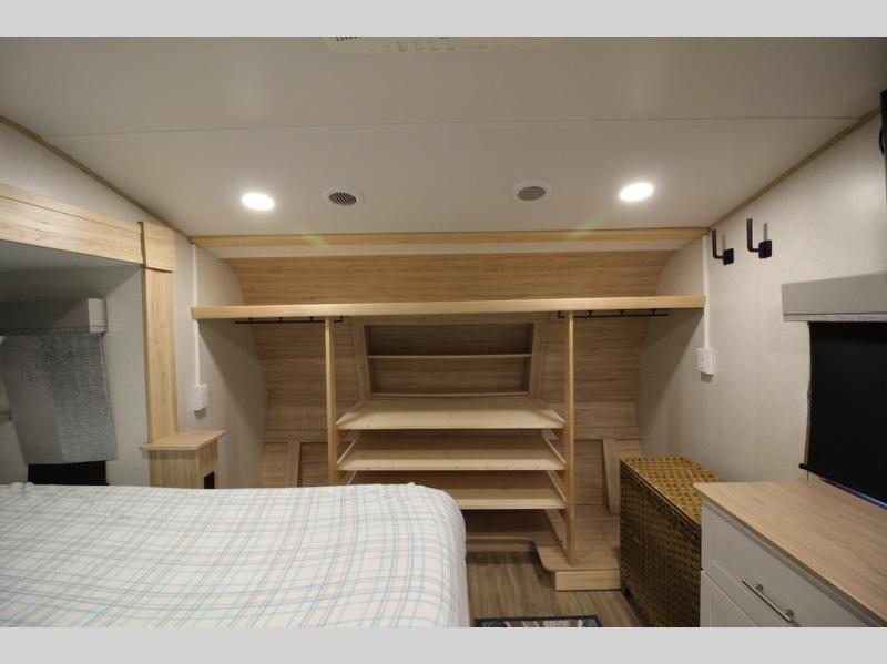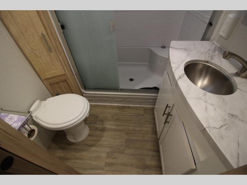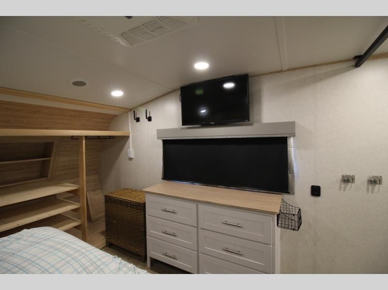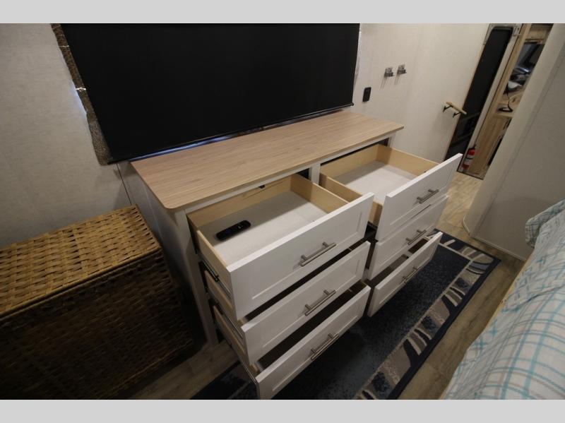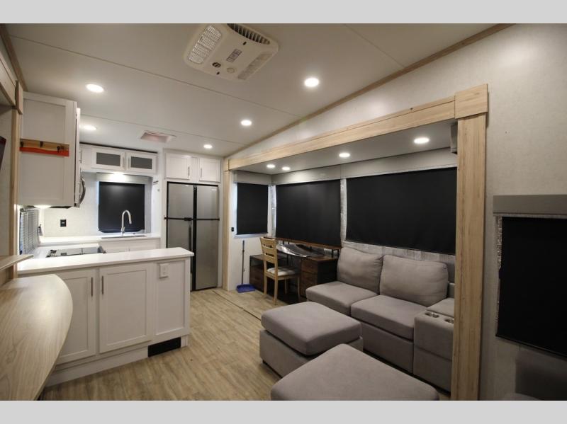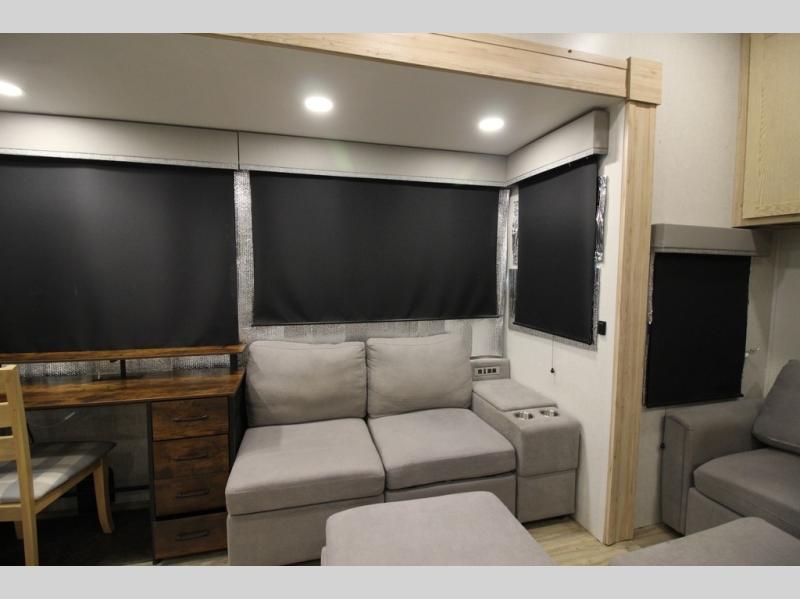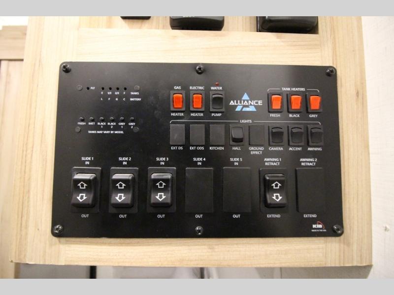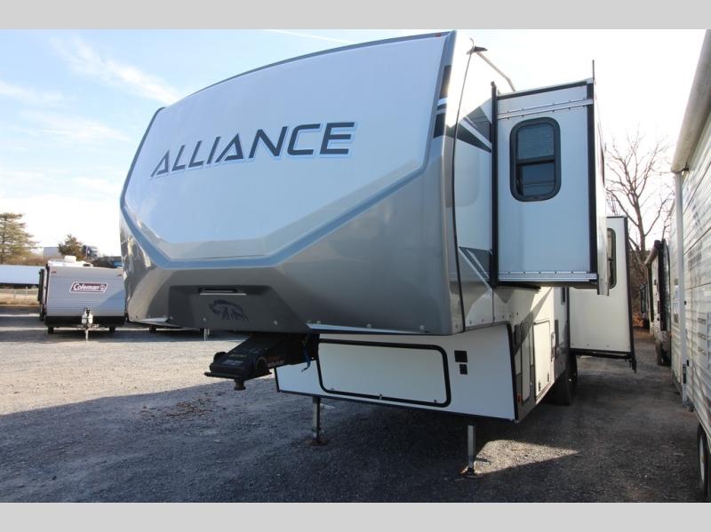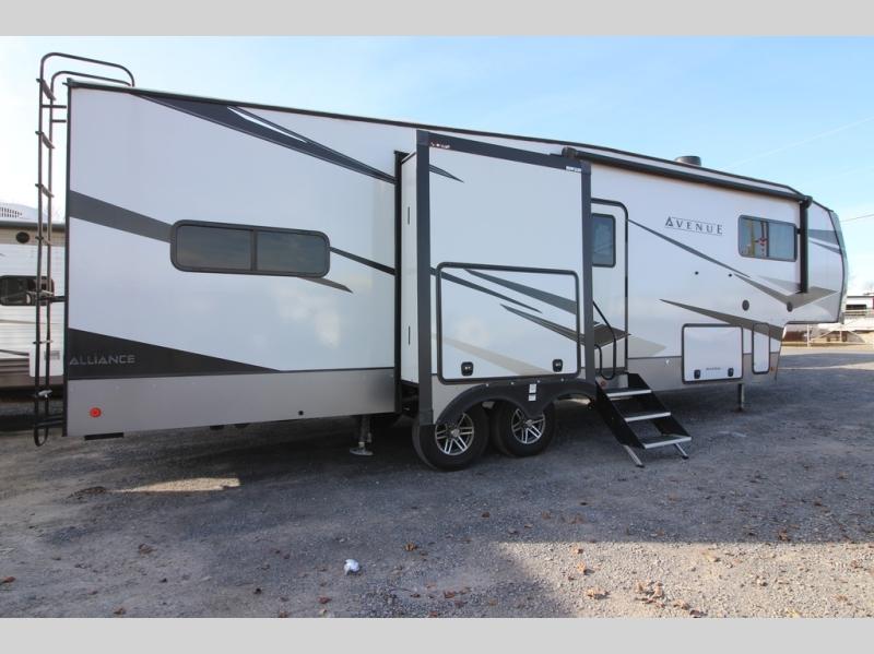 A benchmark chassis creates a space saver upper deck with each one of these Avenue fifth wheels by Alliance RV! The 101 in. wide-body construction gives you more room to walk around and the flush slide out floors throughout prevent any tripping. There are Azdel composite sidewalls inside and out, and a seamless fully walkable PVC roof for extreme durability, zero maintenance, and it is more solar reflective because of the bright white color. Twin 13,500 BTU A/C units provide 27,000 BTUs of cooling power which are ultra quiet and independently controlled keeping you comfortable during your entire trip. And, the fully enclosed and heated underbelly means that you can extend your camping season into the colder months if you like. You are sure to love the "no carpet zone" making each Avenue easy to clean and allergen free, not to mention pet friendly with vinyl flooring throughout. And, strategically placed Atrium windows in the bedroom and living area will not only provide more light, cross ventilation and fresh air, but bring a spectacular view of your surroundings right inside. You can maximize your space throughout with innovative storage solutions like the hidden storage behind the TV, inside the end tables, ottoman, and dinette chairs. Come choose your favorite model today!
