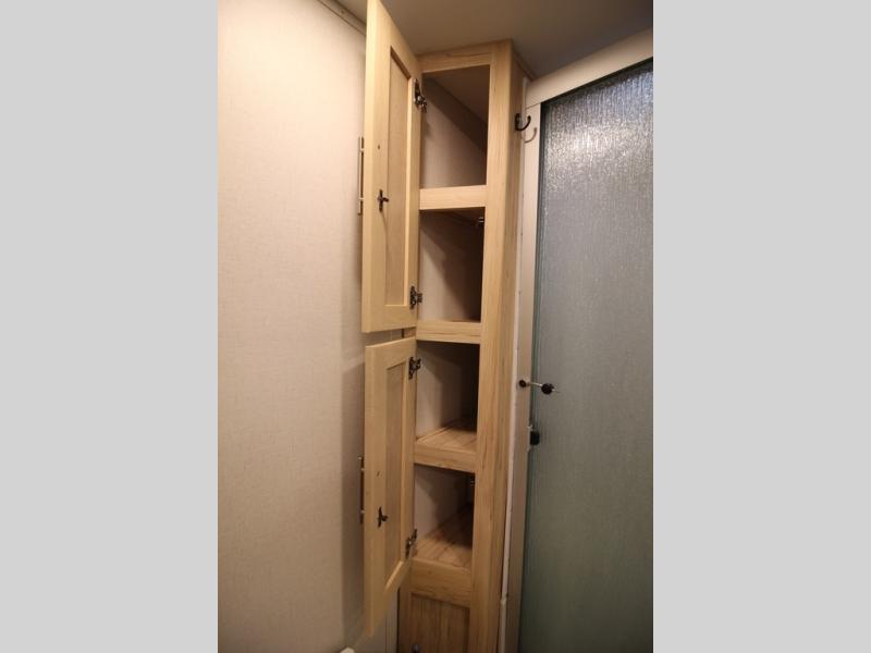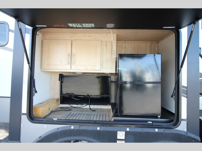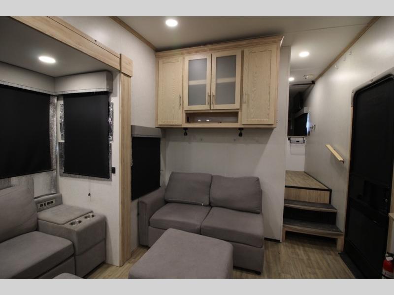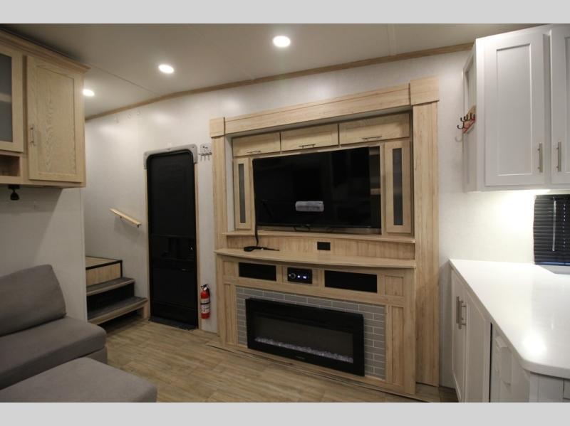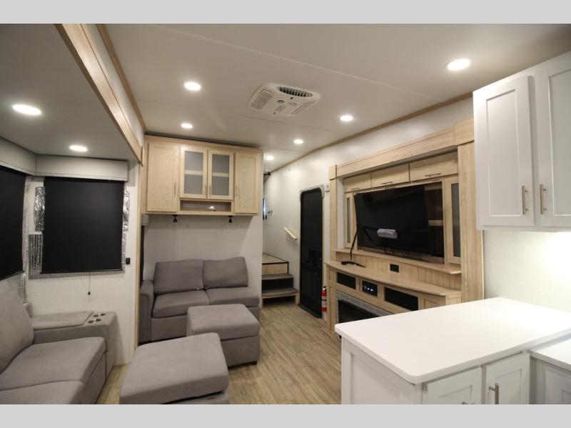 If you've been on the search for a luxury fifth wheel, this is the one! You'll love the rear kitchen with ample counter space, a 16 cu. ft. 12V refrigerator, plus a large sink to clean up. The swing-mount 50" HDTV will provide entertainment for your family while you relax on the dual recliner theater seat or tri-fold sofa. Freshening up each day will be a breeze in the full bath that includes a shower with a seat, and the front private bedroom is close by for convenience. You'll have the queen bed all to yourselves with an option to choose a king bed instead. And check out the large front closet with washer and dryer prep. Going full-time has never been easier!