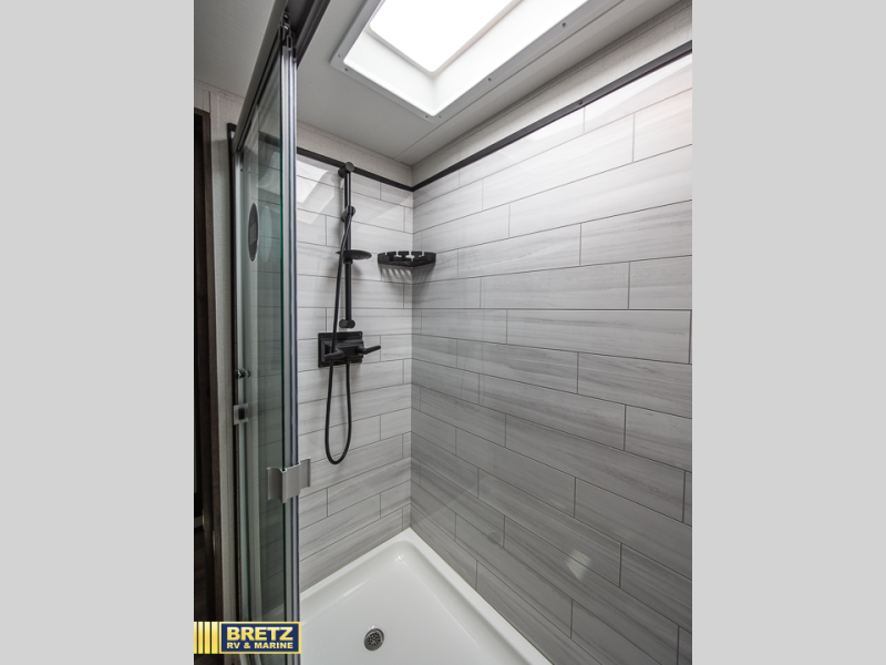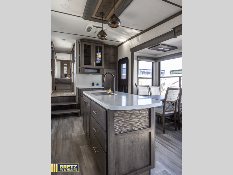 Travel to see family and friends while living in this RV or while on vacation with beautiful views out of the many atrium windows once at your destination. You will love the spacious rear living area thanks to the dual opposing slides which include the kitchen amenities and the 50" Smart TV with pull-out fireplace including storage below, plus the dual recliner love seat which is super comfortable and the floating dinette table with four chairs. The kitchen island includes a stainless steel farm sink and counter space to utilize many ways, plus you can add a dishwasher option if you like. The full bathroom is up the steps towards the front bedroom and includes a 61" x 30" shower. You even have more floor space in the hallway thanks to the slide out which includes shelf storage, plus more shelves and a king bed in the bedroom. You will find lots of useful storage in the bedroom as well. And don't forget about all the exterior features, take a look!
