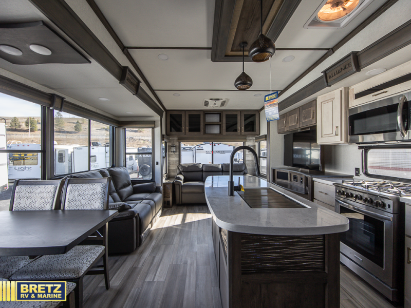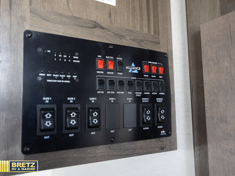 With any Paradigm fifth wheel by Alliance RV, you will experience the next generation advanced frame technology with heavy duty performance running gear. The Benchmark chassis features solid steel 10" l-beam main rails with a 2" torsion tube welded where the running gear attaches, drop frame storage area, flush upper deck design, reinforced goose neck area and a Rota-Flex pin box. The six-point hydraulic auto leveling is faster, stronger and quieter allowing you to enjoy more time away, and the PVC roof is more puncture resistant, ultra bright white and more solar reflective to help keep your fifth wheel cool. The triple 13,500 BTU A/Cs are ultra quiet, independently controlled direct flow A/C units that maximize cooling capacity, plus the 40,000 BTU furnace has flex ducts connected to formed ducts in the floor, and there are dedicated heat vents into the basement and underbelly to keep the tanks and your gear cozy warm during the cooler seasons. Choose luxury, choose convenience, choose to own the best, a Paradigm!
