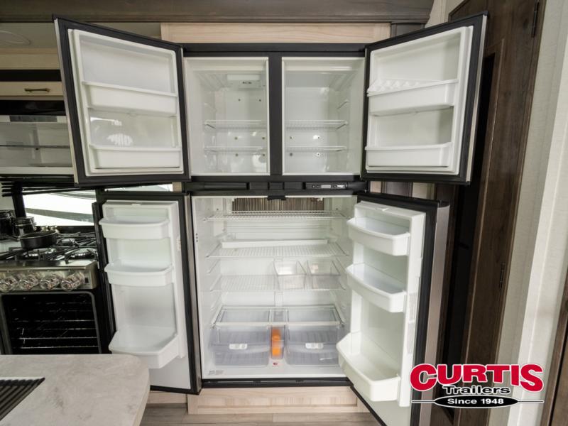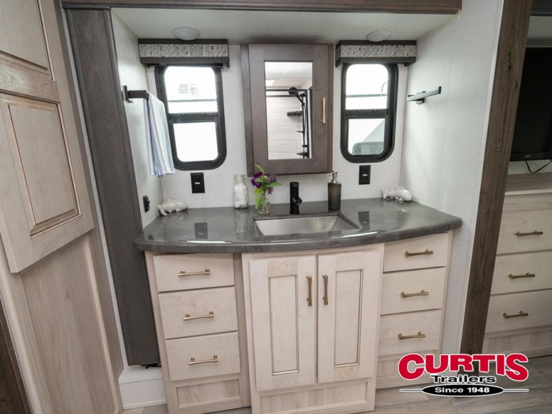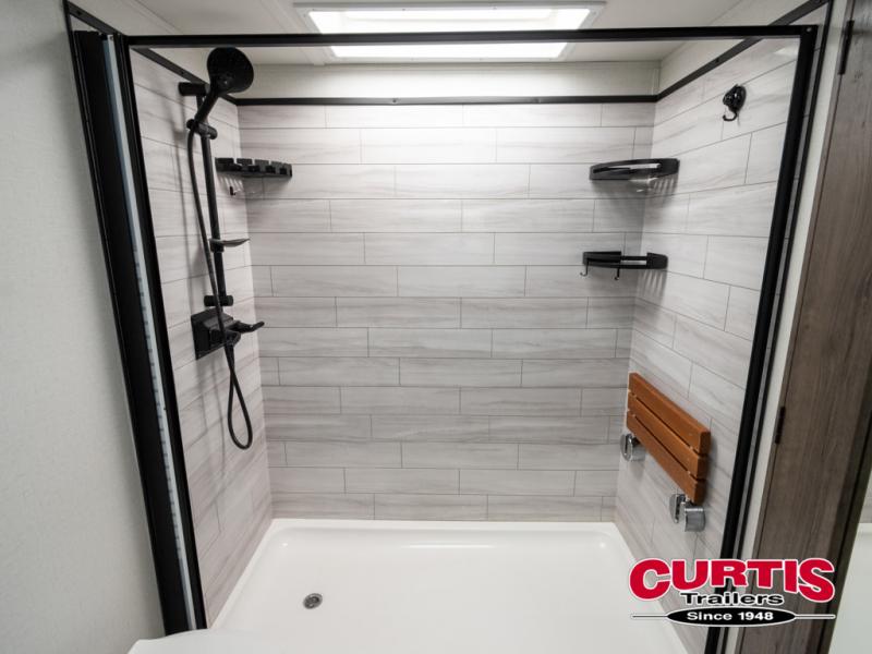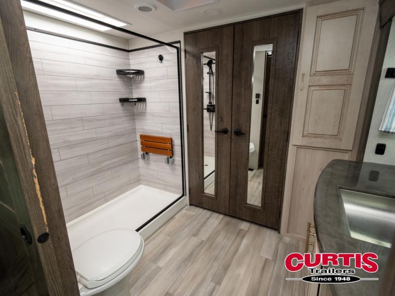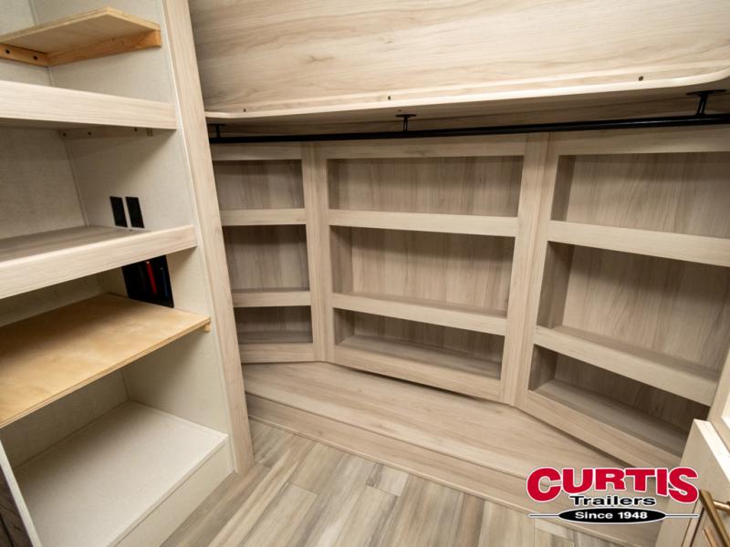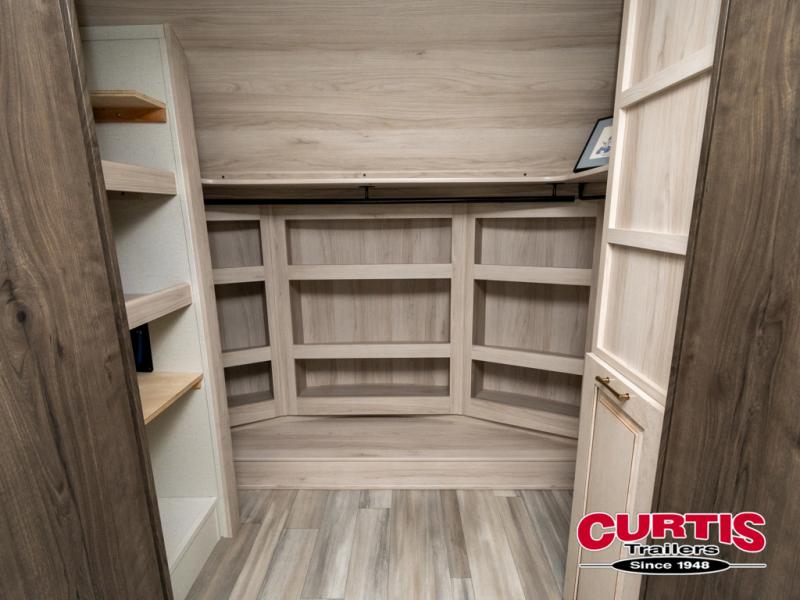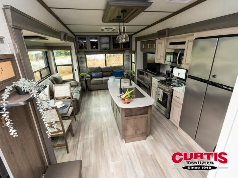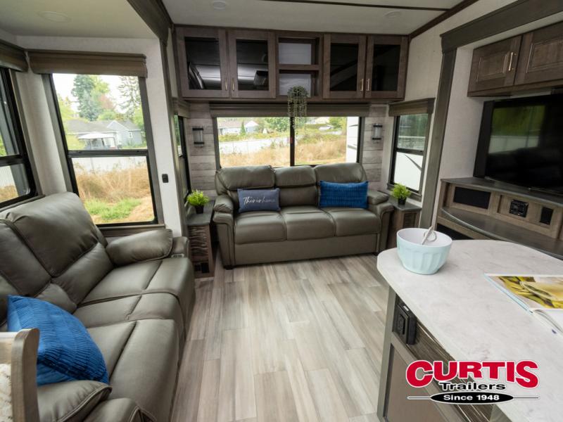 Whether you decide to be a full-timer or a long-trip traveler, this Paradigm offers so many comforts and conveniences you will love seeing nature while under the two awnings with only a few steps to get back inside to rest and relax in your own spacious fifth wheel! The large full bathroom might be the reason you decide to be a owner because you will have a large 61" x 30" shower to get cleaned up in, linen storage, and a walk-in closet with a hamper, shelves, and a space prepped for a washer/dryer option. The bedroom allows you to sleep like a king and gives you extra floor space with the two slides, and storage in the flip-top dresser and under the seat, plus you can watch the Smart TV. The space saving sliding doors offer style as well. The cook will love all the residential appliances, you can even choose the residential refrigerator option. The kitchen island gives you a stainless steel farm sink and a place to add a dishwasher option. The half bath is super convenient just like the entry sitting bench/coat rack and closet. And you can relax on the sleeper sofa or the dual recliner love seat. There is so much more to see!