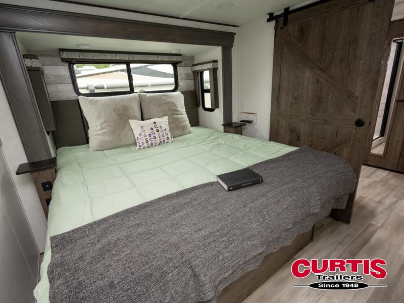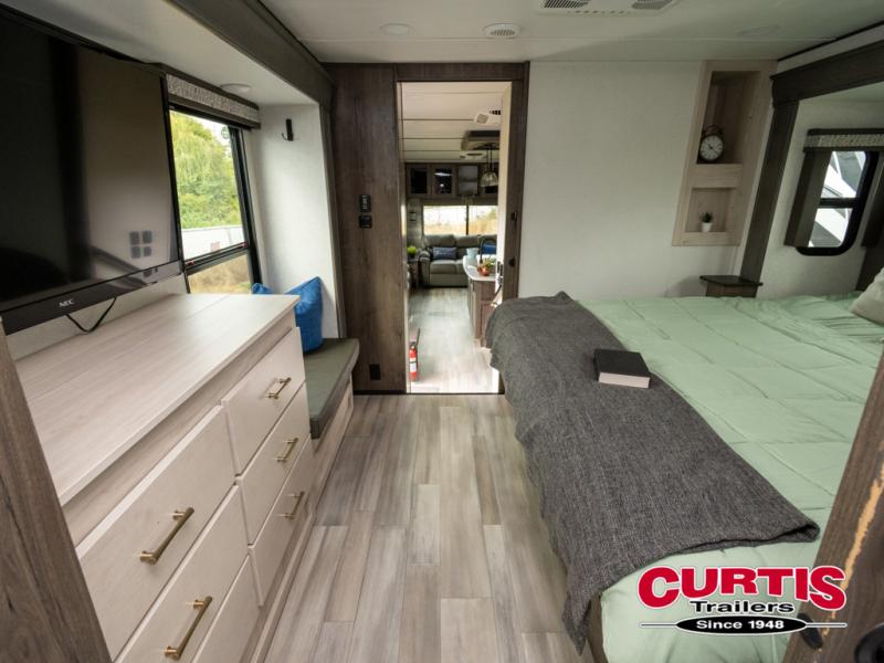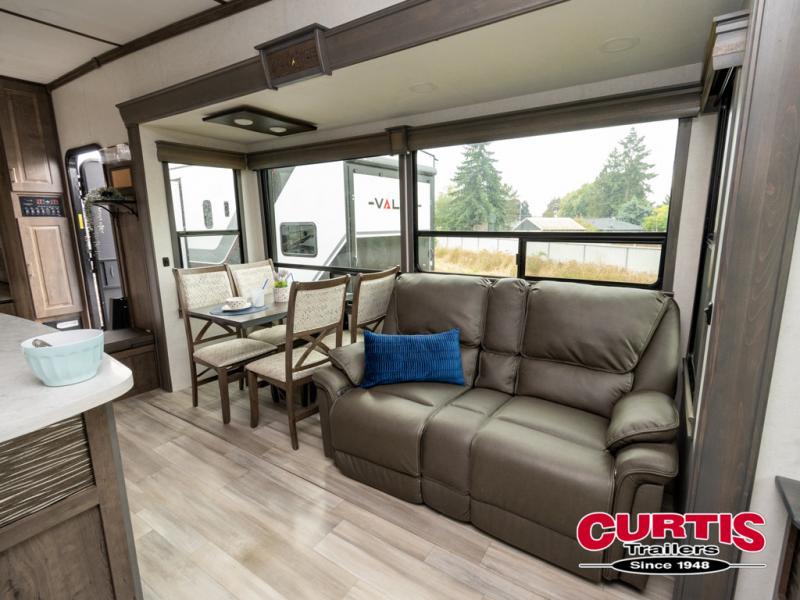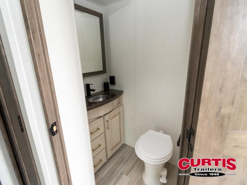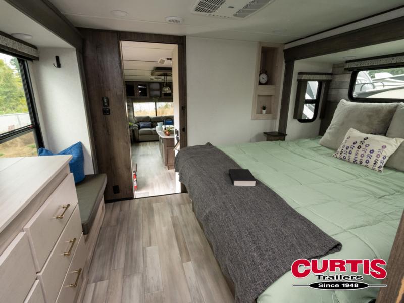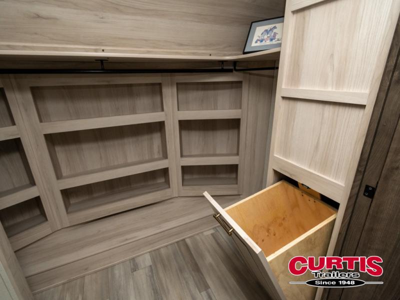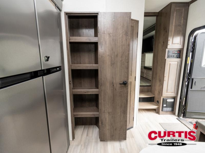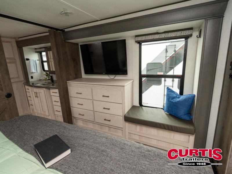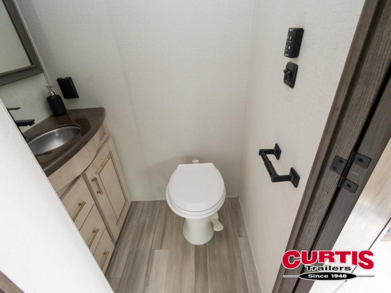 Whether you decide to be a full-timer or a long-trip traveler, this Paradigm offers so many comforts and conveniences you will love seeing nature while under the two awnings with only a few steps to get back inside to rest and relax in your own spacious fifth wheel! The large full bathroom might be the reason you decide to be a owner because you will have a large 61" x 30" shower to get cleaned up in, linen storage, and a walk-in closet with a hamper, shelves, and a space prepped for a washer/dryer option. The bedroom allows you to sleep like a king and gives you extra floor space with the two slides, and storage in the flip-top dresser and under the seat, plus you can watch the Smart TV. The space saving sliding doors offer style as well. The cook will love all the residential appliances, you can even choose the residential refrigerator option. The kitchen island gives you a stainless steel farm sink and a place to add a dishwasher option. The half bath is super convenient just like the entry sitting bench/coat rack and closet. And you can relax on the sleeper sofa or the dual recliner love seat. There is so much more to see!
