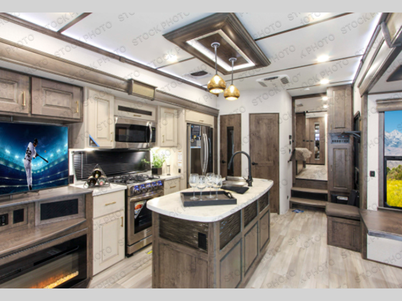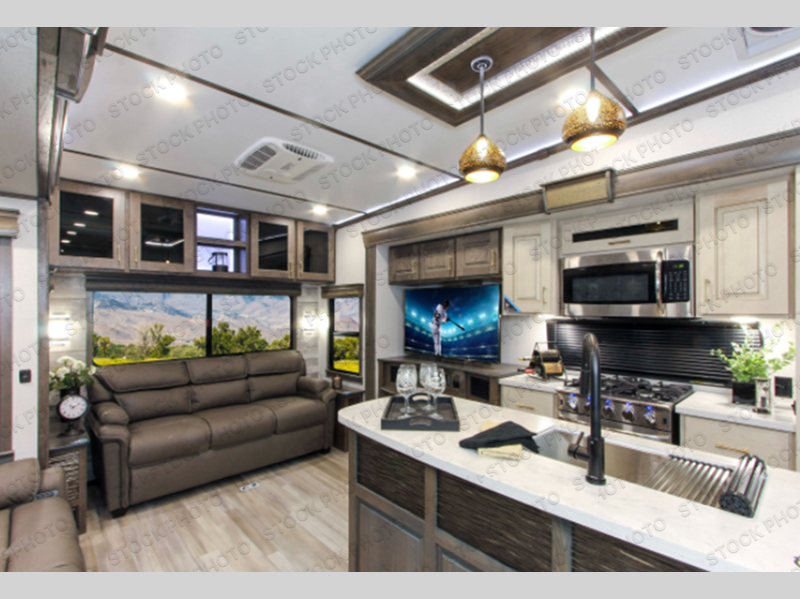 Whether you decide to be a full-timer or a long-trip traveler, this Paradigm offers so many comforts and conveniences you will love seeing nature while under the two awnings with only a few steps to get back inside to rest and relax in your own spacious fifth wheel! The large full bathroom might be the reason you decide to be a owner because you will have a large 61" x 30" shower to get cleaned up in, linen storage, and a walk-in closet with a hamper, shelves, and a space prepped for a washer/dryer option. The bedroom allows you to sleep like a king and gives you extra floor space with the two slides, and storage in the flip-top dresser and under the seat, plus you can watch the Smart TV. The space saving sliding doors offer style as well. The cook will love all the residential appliances, you can even choose the residential refrigerator option. The kitchen island gives you a stainless steel farm sink and a place to add a dishwasher option. The half bath is super convenient just like the entry sitting bench/coat rack and closet. And you can relax on the sleeper sofa or the dual recliner love seat. There is so much more to see!