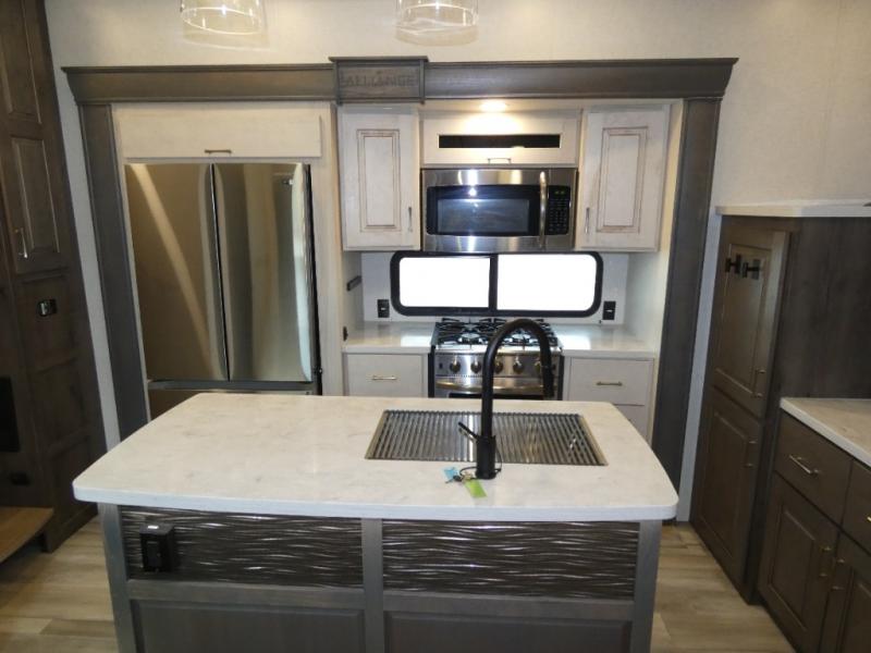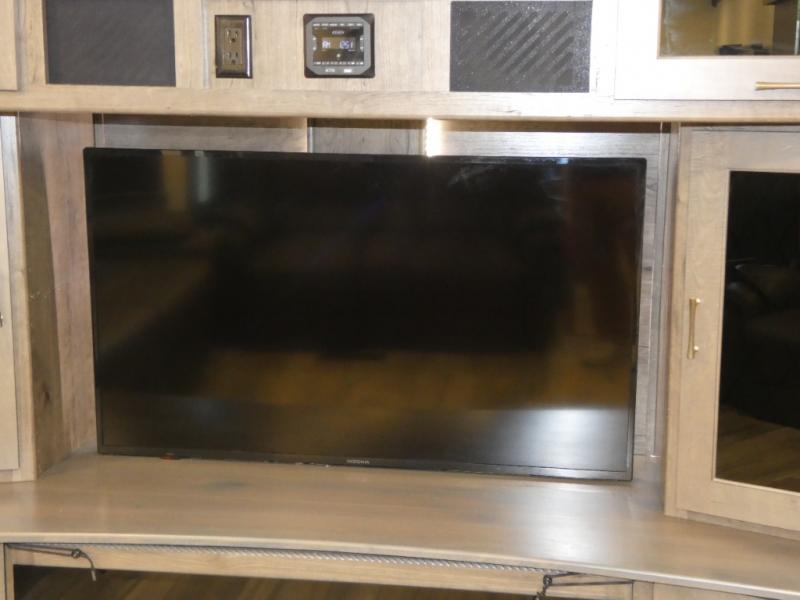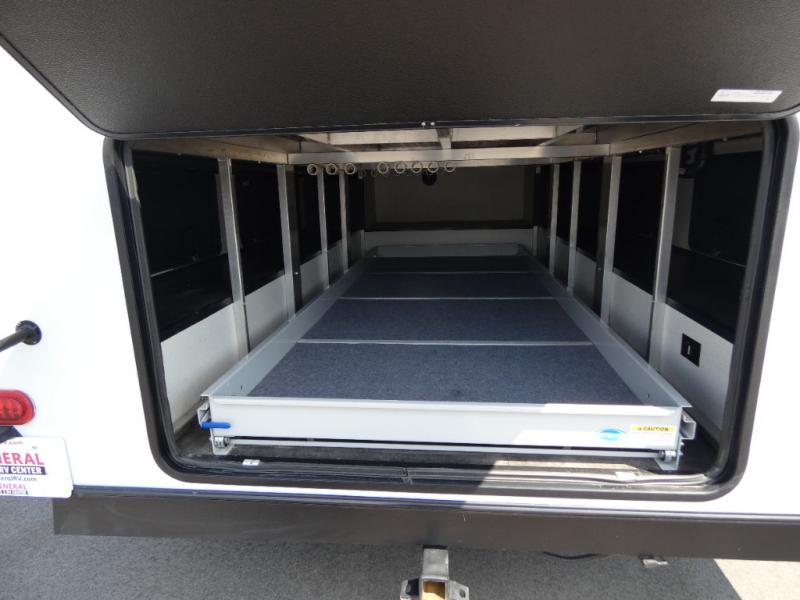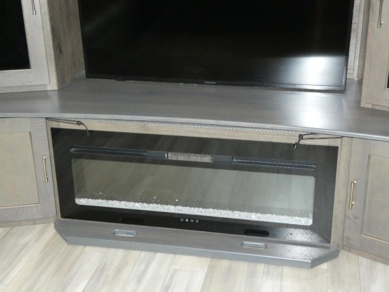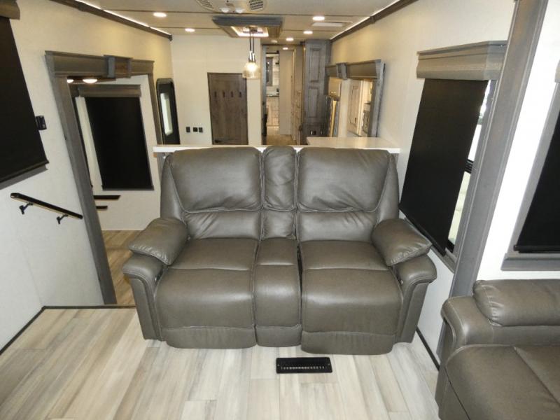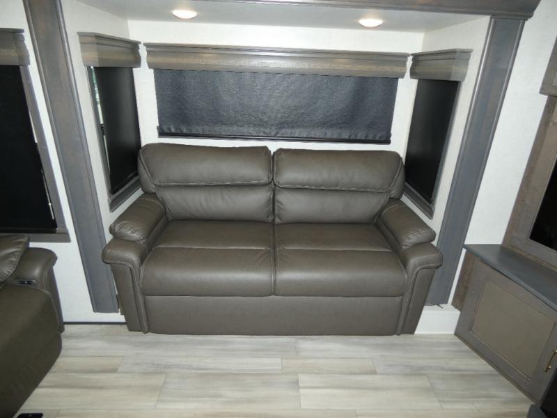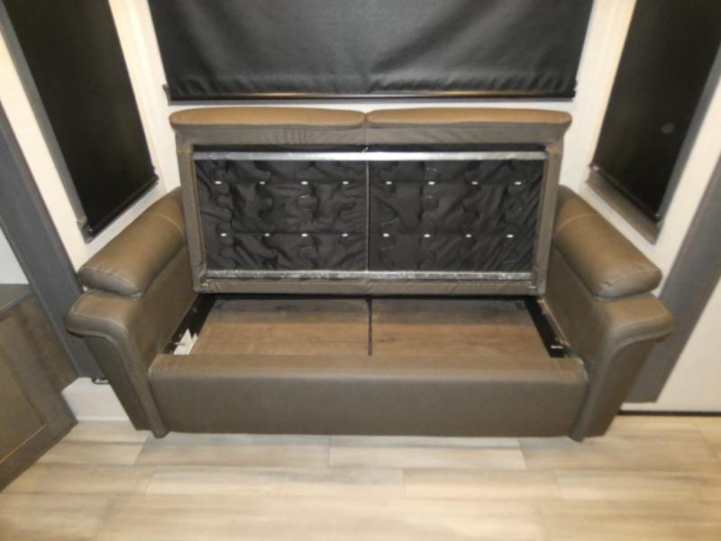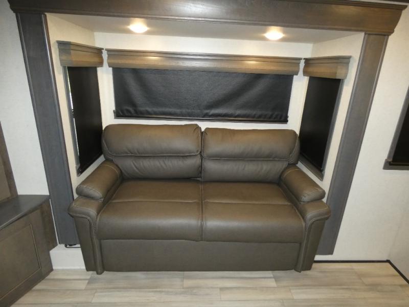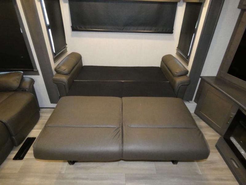 An active family will want this fifth wheel with its exterior basement pull-out tray that measures at 48" x 115" to load up your kayaks and such. Just above this area is the master suite with a rear bathroom that offers a residential shower, a porcelain toilet with soft close seat, plus a wardrobe and shelf storage. The king bed slide gives you more floor space, and you will have a seat, a flip-top dresser, and a Smart TV to watch. The half bath is next to the main entry which is super convenient, and the middle kitchen is separate from the front living area. The cook will love the residential microwave, range and oven, refrigerator, plus the pantry, and the extra counter space on the kitchen island with a stainless steel farm sink. And the views out of the atrium windows in the slide out which includes the floating dinette table are a must see. And when you need to watch the big game, the 55" Smart TV with pull-out fireplace below are up front with the dual recliner love seat and two sofas.