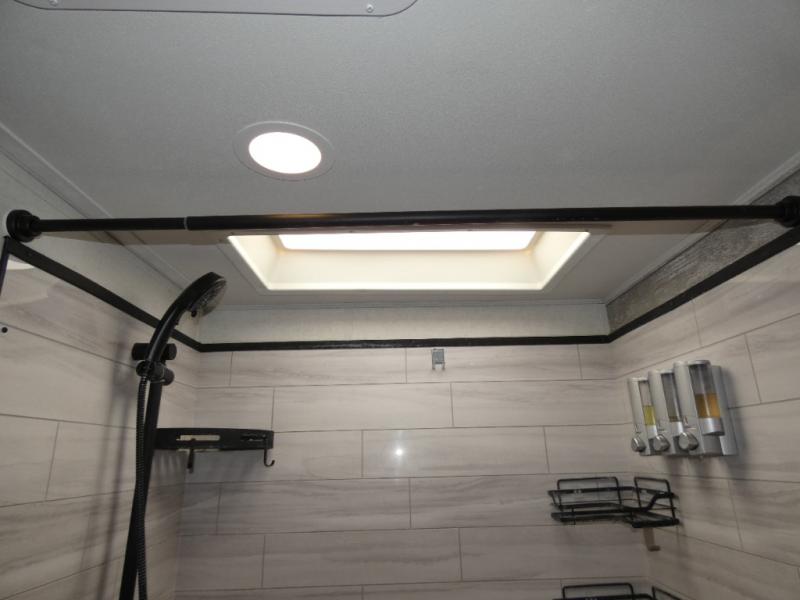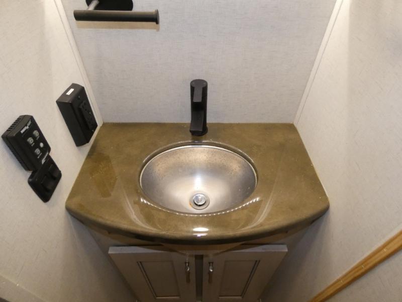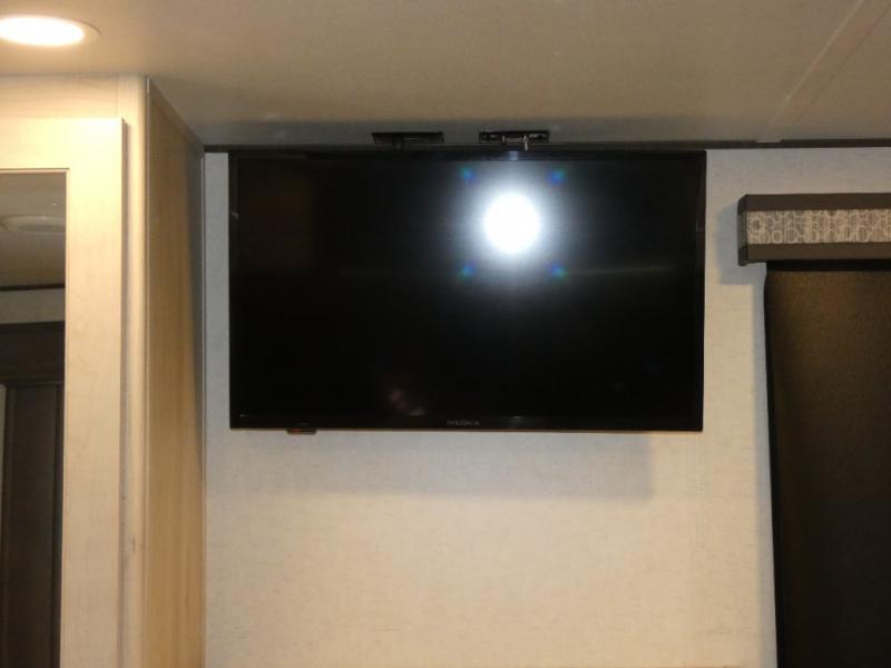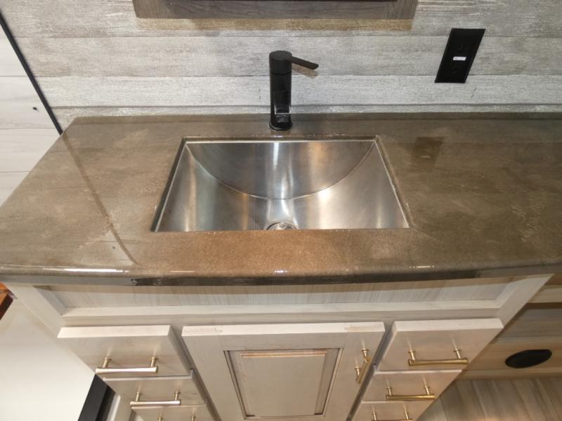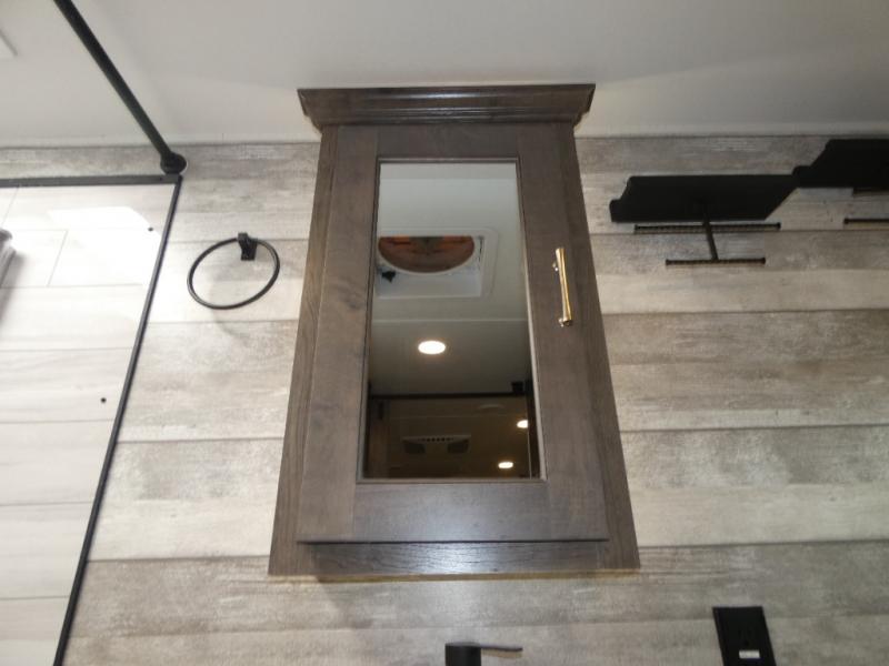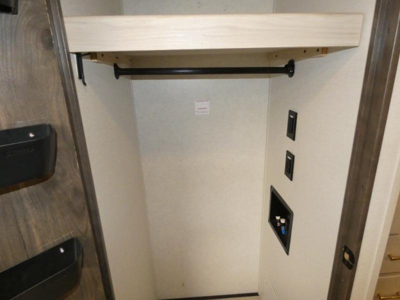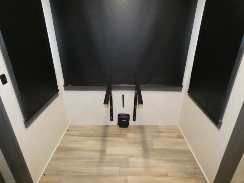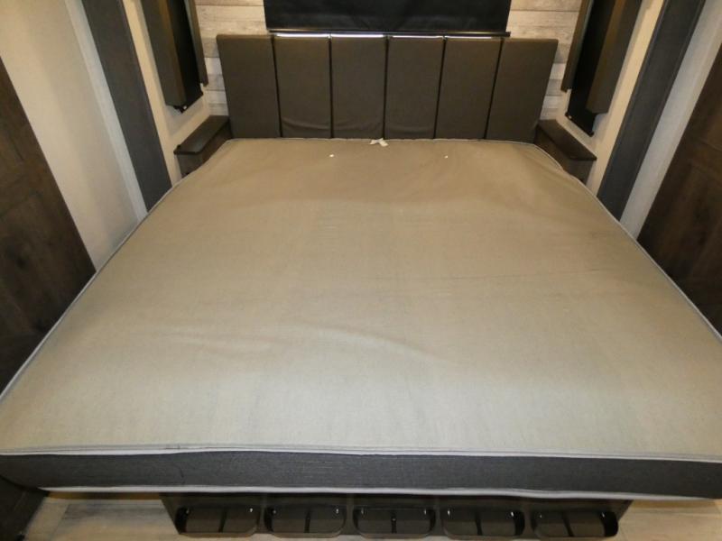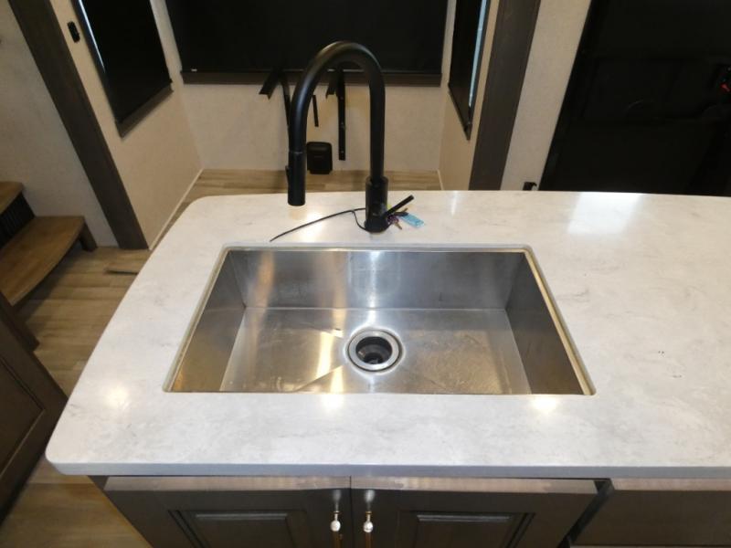 An active family will want this fifth wheel with its exterior basement pull-out tray that measures at 48" x 115" to load up your kayaks and such. Just above this area is the master suite with a rear bathroom that offers a residential shower, a porcelain toilet with soft close seat, plus a wardrobe and shelf storage. The king bed slide gives you more floor space, and you will have a seat, a flip-top dresser, and a Smart TV to watch. The half bath is next to the main entry which is super convenient, and the middle kitchen is separate from the front living area. The cook will love the residential microwave, range and oven, refrigerator, plus the pantry, and the extra counter space on the kitchen island with a stainless steel farm sink. And the views out of the atrium windows in the slide out which includes the floating dinette table are a must see. And when you need to watch the big game, the 55" Smart TV with pull-out fireplace below are up front with the dual recliner love seat and two sofas.