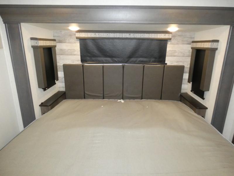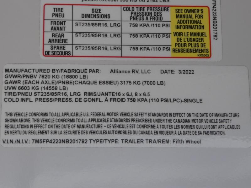 With any Paradigm fifth wheel by Alliance RV, you will experience the next generation advanced frame technology with heavy duty performance running gear. The Benchmark chassis features solid steel 10" l-beam main rails with a 2" torsion tube welded where the running gear attaches, drop frame storage area, flush upper deck design, reinforced goose neck area and a Rota-Flex pin box. The six-point hydraulic auto leveling is faster, stronger and quieter allowing you to enjoy more time away, and the PVC roof is more puncture resistant, ultra bright white and more solar reflective to help keep your fifth wheel cool. The triple 13,500 BTU A/Cs are ultra quiet, independently controlled direct flow A/C units that maximize cooling capacity, plus the 40,000 BTU furnace has flex ducts connected to formed ducts in the floor, and there are dedicated heat vents into the basement and underbelly to keep the tanks and your gear cozy warm during the cooler seasons. Choose luxury, choose convenience, choose to own the best, a Paradigm!