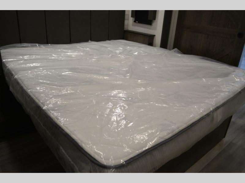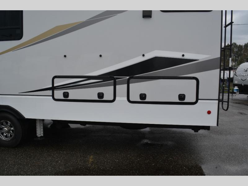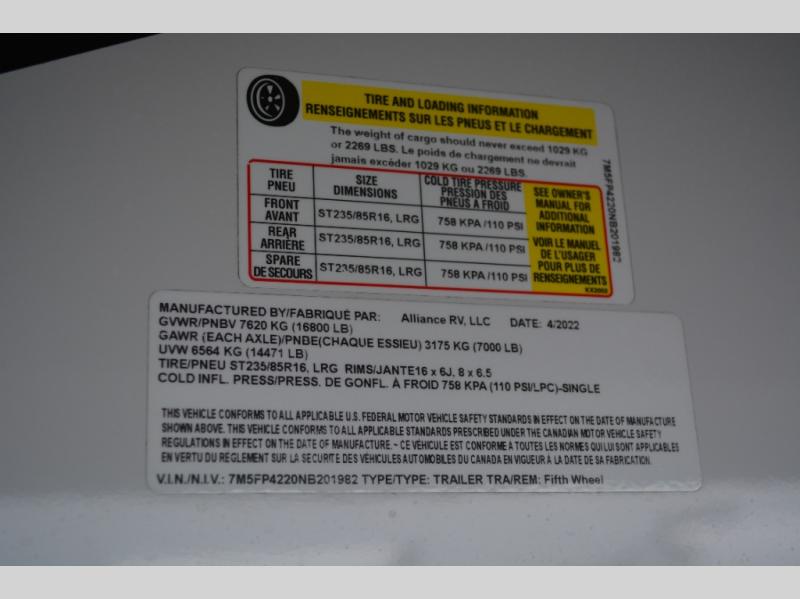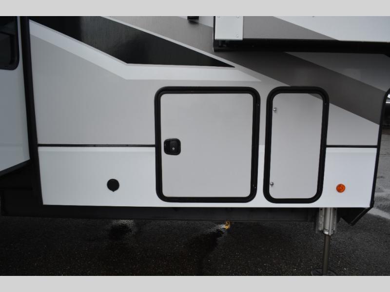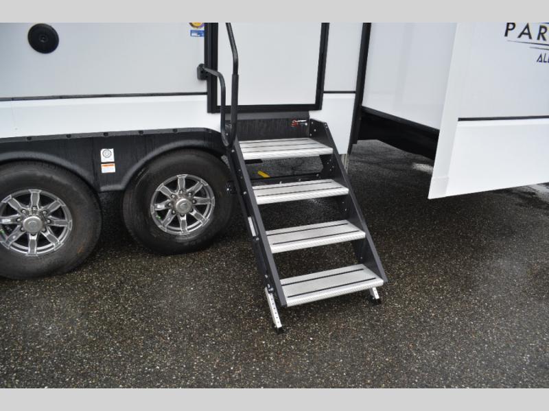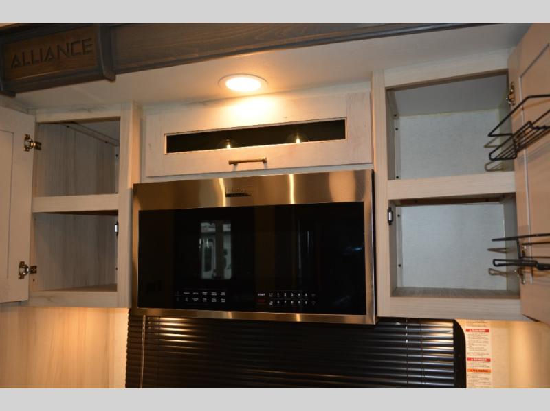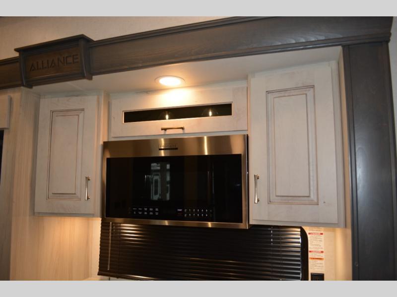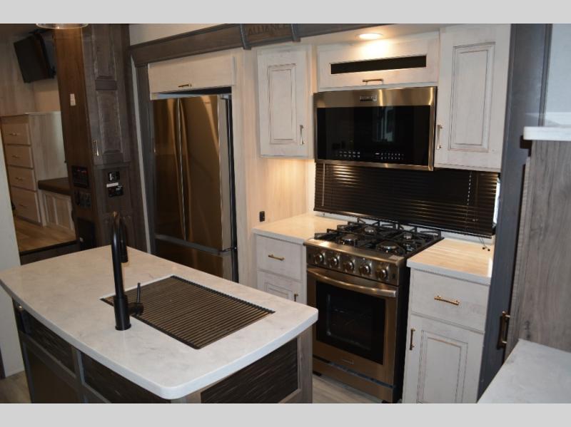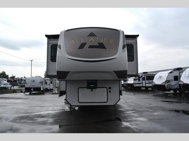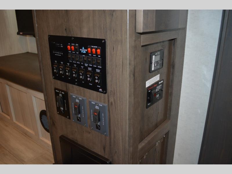 With any Paradigm fifth wheel by Alliance RV, you will experience the next generation advanced frame technology with heavy duty performance running gear. The Benchmark chassis features solid steel 10" l-beam main rails with a 2" torsion tube welded where the running gear attaches, drop frame storage area, flush upper deck design, reinforced goose neck area and a Rota-Flex pin box. The six-point hydraulic auto leveling is faster, stronger and quieter allowing you to enjoy more time away, and the PVC roof is more puncture resistant, ultra bright white and more solar reflective to help keep your fifth wheel cool. The triple 13,500 BTU A/Cs are ultra quiet, independently controlled direct flow A/C units that maximize cooling capacity, plus the 40,000 BTU furnace has flex ducts connected to formed ducts in the floor, and there are dedicated heat vents into the basement and underbelly to keep the tanks and your gear cozy warm during the cooler seasons. Choose luxury, choose convenience, choose to own the best, a Paradigm!