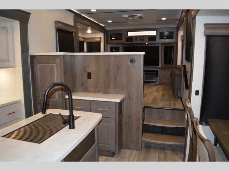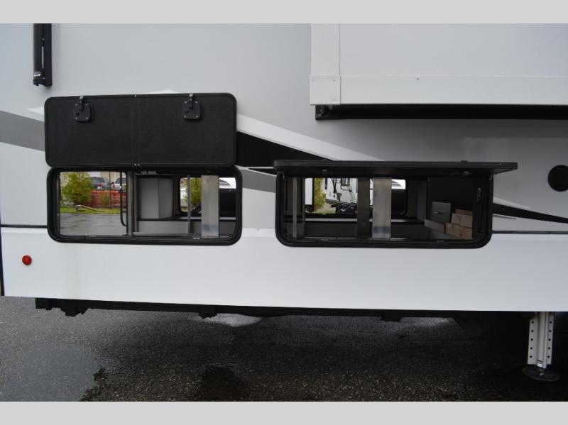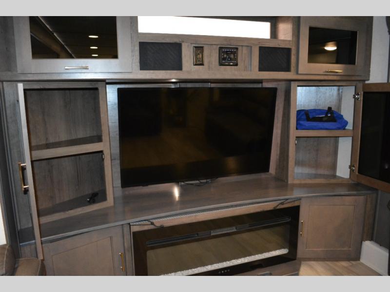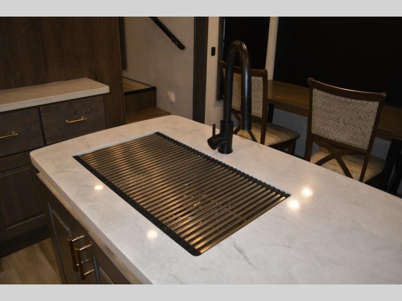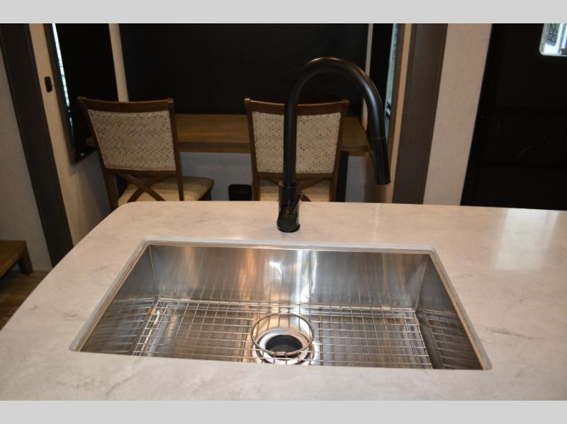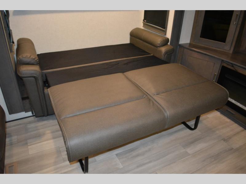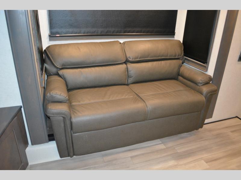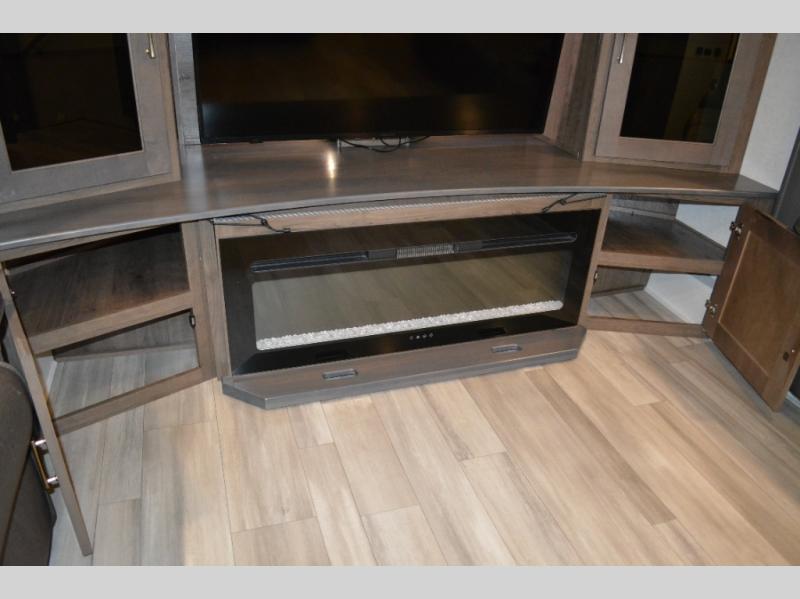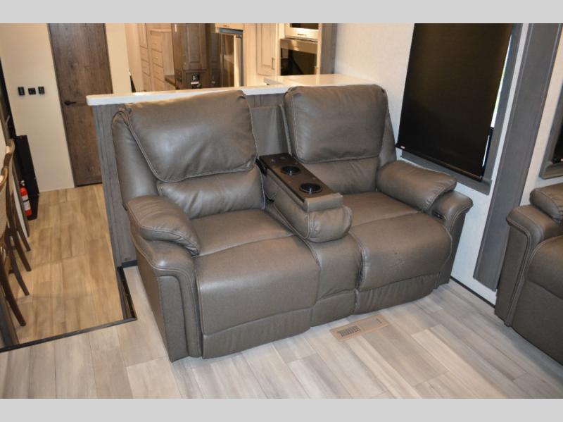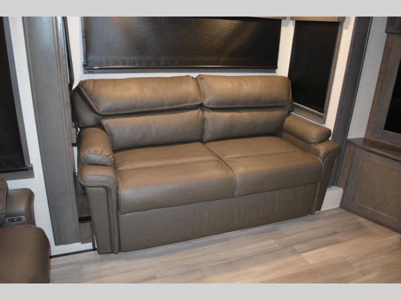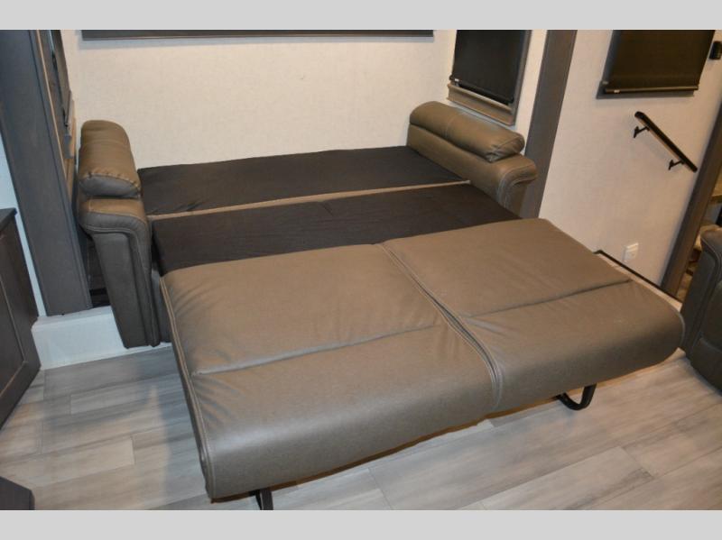 An active family will want this fifth wheel with its exterior basement pull-out tray that measures at 48" x 115" to load up your kayaks and such. Just above this area is the master suite with a rear bathroom that offers a residential shower, a porcelain toilet with soft close seat, plus a wardrobe and shelf storage. The king bed slide gives you more floor space, and you will have a seat, a flip-top dresser, and a Smart TV to watch. The half bath is next to the main entry which is super convenient, and the middle kitchen is separate from the front living area. The cook will love the residential microwave, range and oven, plus the option to add a residential refrigerator, plus the pantry, and the extra counter space on the kitchen island with a stainless steel farm sink. And the views out of the atrium windows in the slide out which includes the floating dinette table are a must see. And when you need to watch the big game, the 55" Smart TV with pull-out fireplace below are up front with the dual recliner love seat and two sleeper sofas.