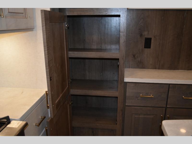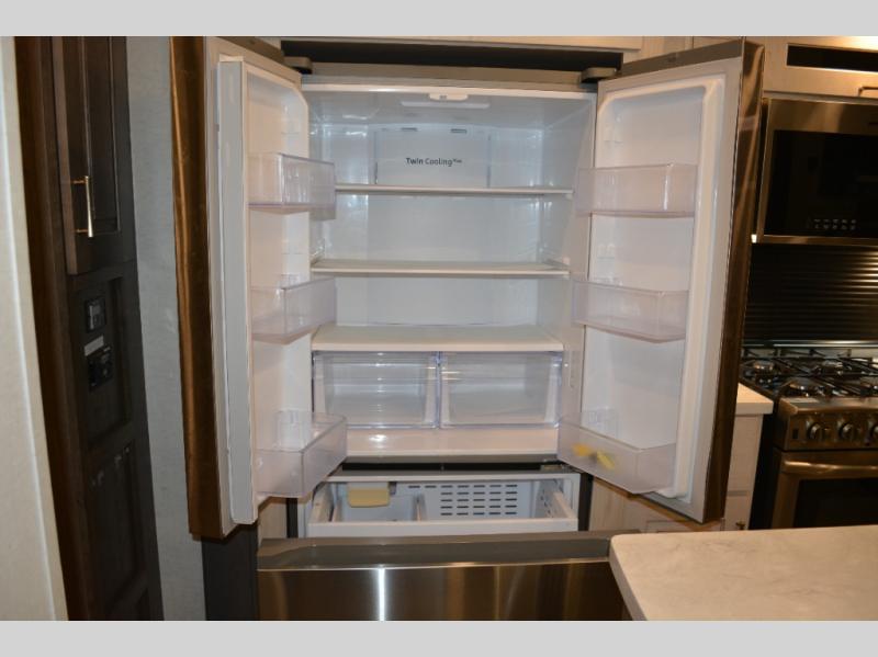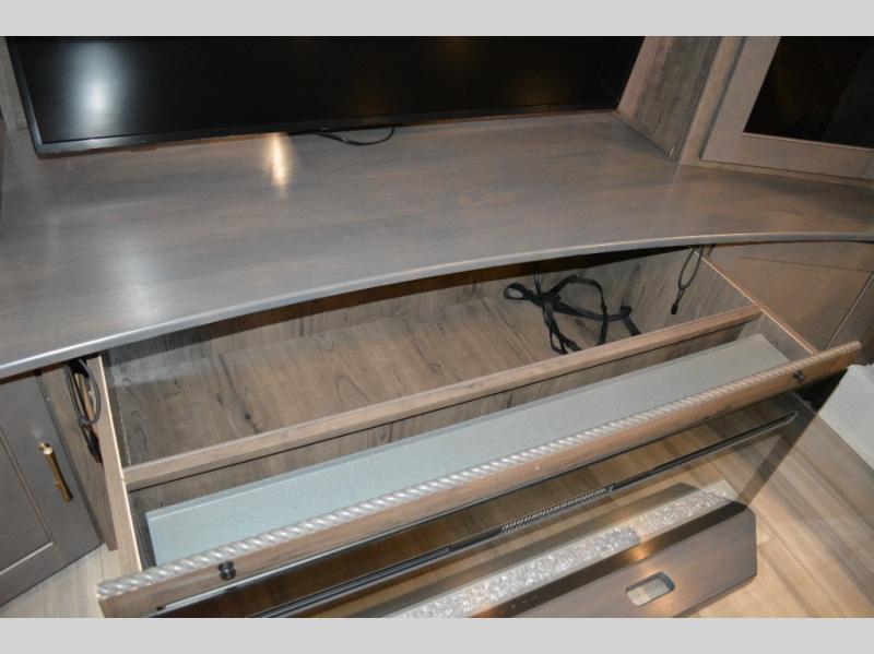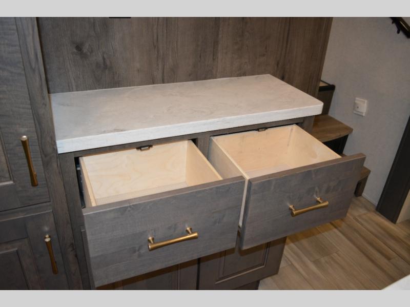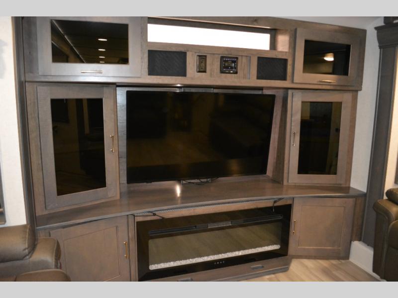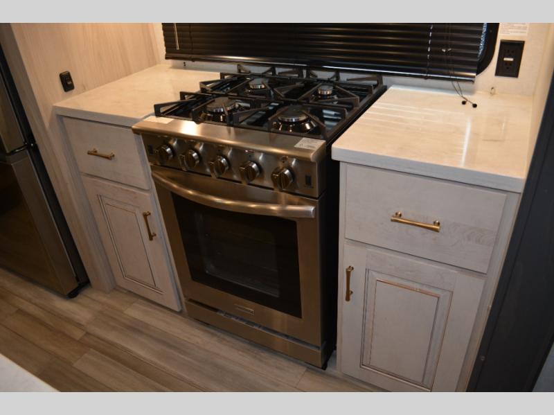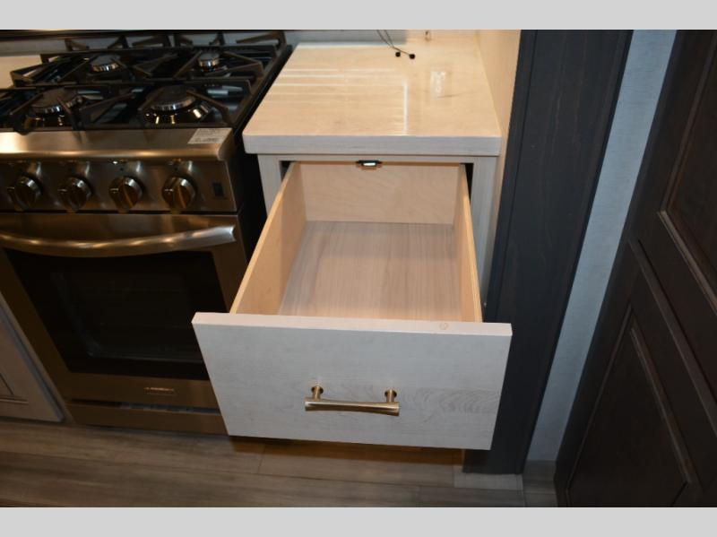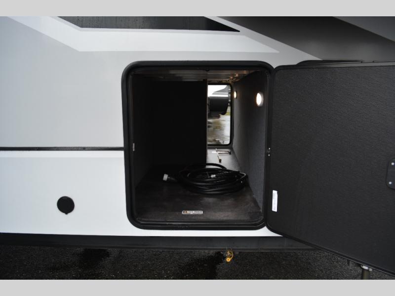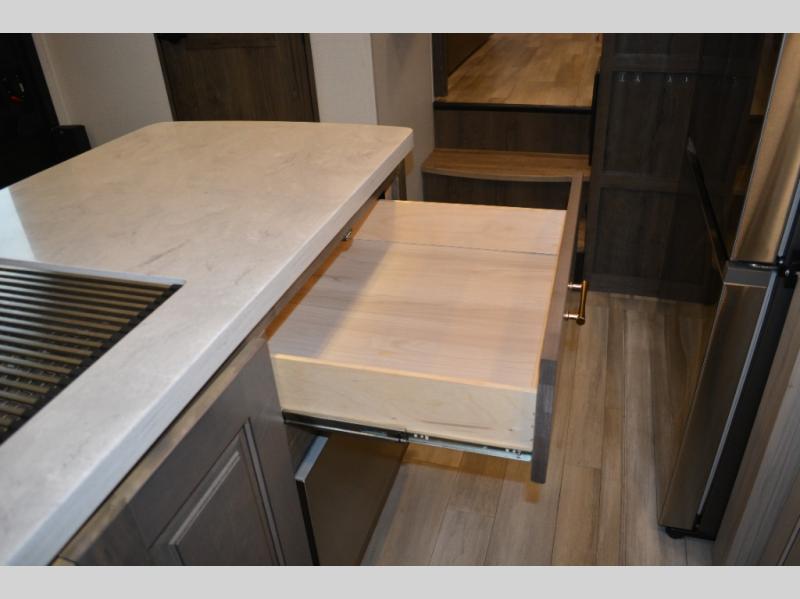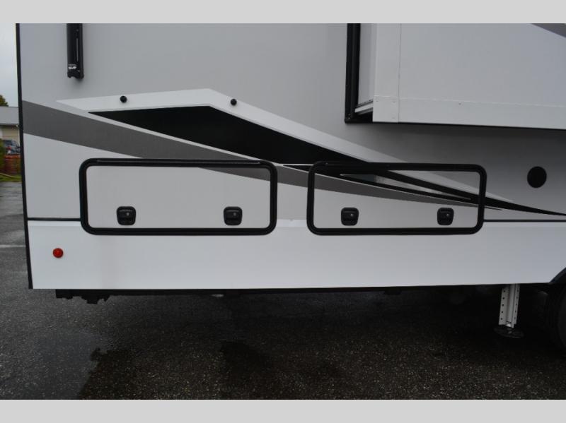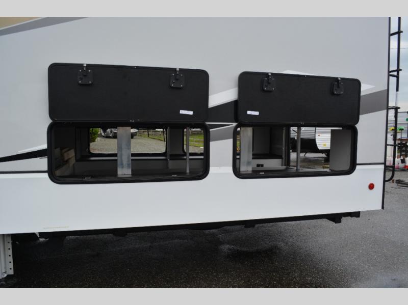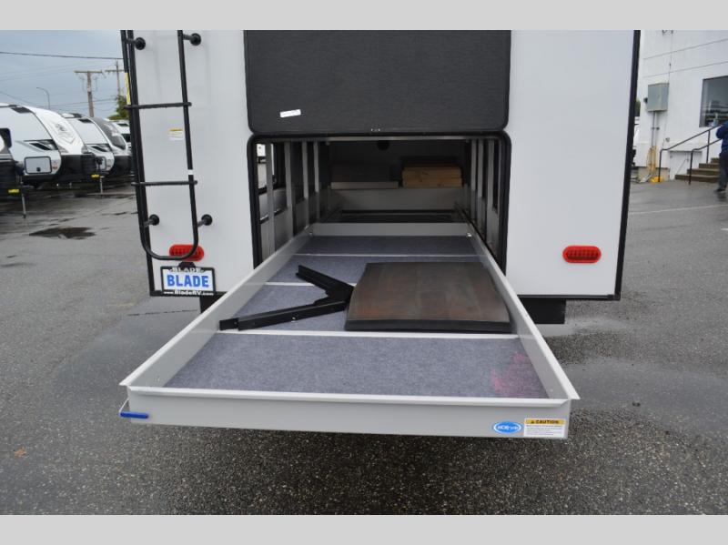 An active family will want this fifth wheel with its exterior basement pull-out tray that measures at 48" x 115" to load up your kayaks and such. Just above this area is the master suite with a rear bathroom that offers a residential shower, a porcelain toilet with soft close seat, plus a wardrobe and shelf storage. The king bed slide gives you more floor space, and you will have a seat, a flip-top dresser, and a Smart TV to watch. The half bath is next to the main entry which is super convenient, and the middle kitchen is separate from the front living area. The cook will love the residential microwave, range and oven, plus the option to add a residential refrigerator, plus the pantry, and the extra counter space on the kitchen island with a stainless steel farm sink. And the views out of the atrium windows in the slide out which includes the floating dinette table are a must see. And when you need to watch the big game, the 55" Smart TV with pull-out fireplace below are up front with the dual recliner love seat and two sleeper sofas.