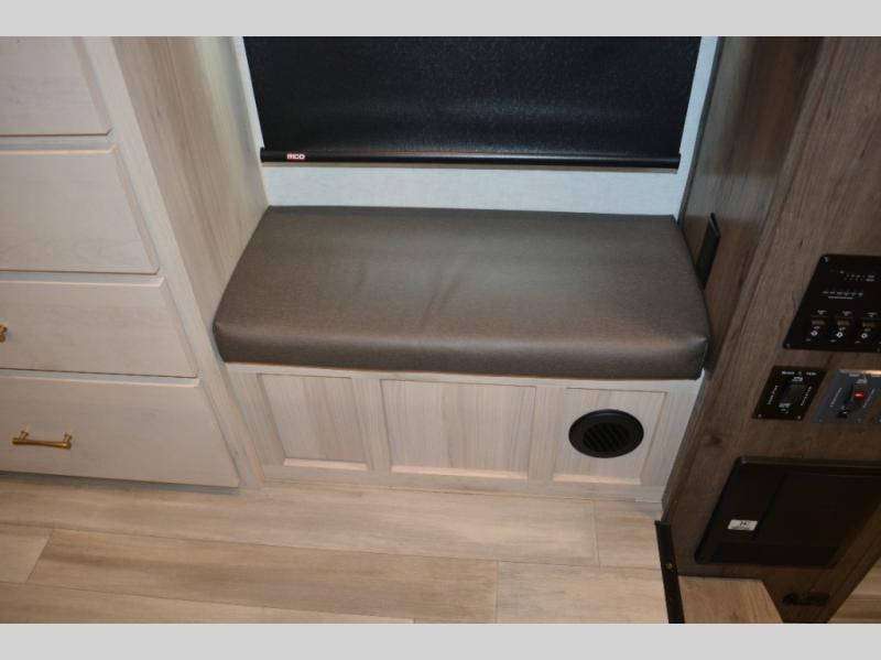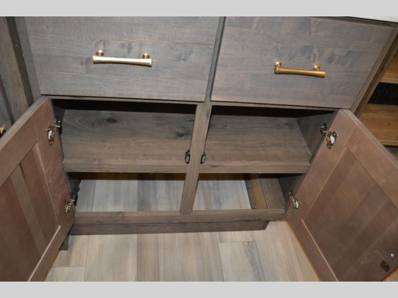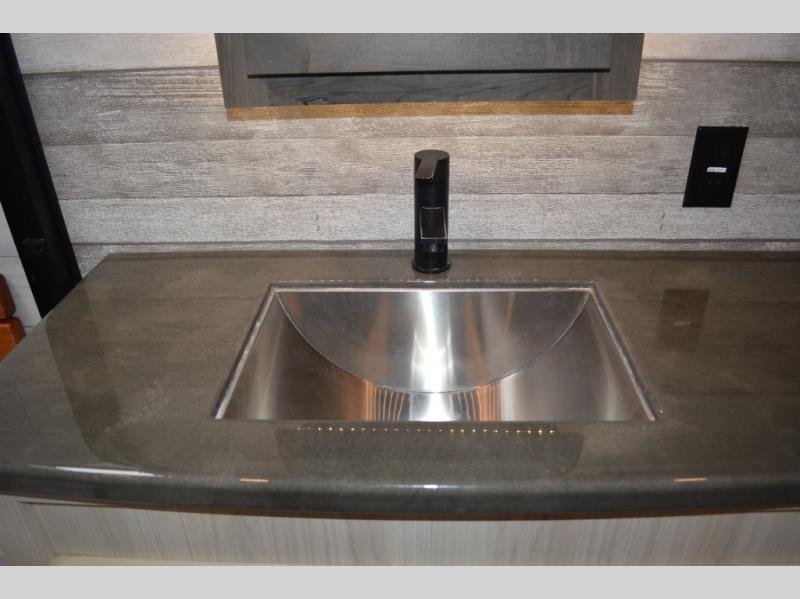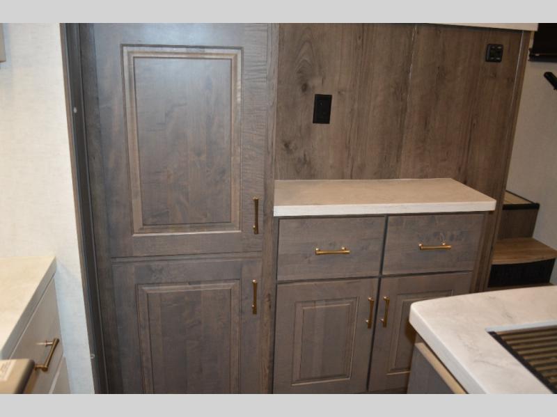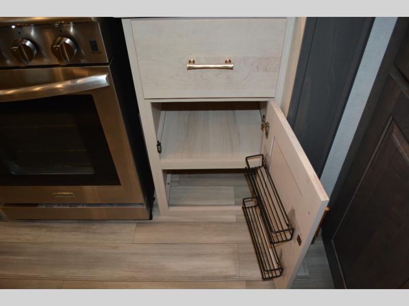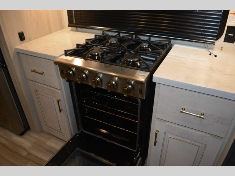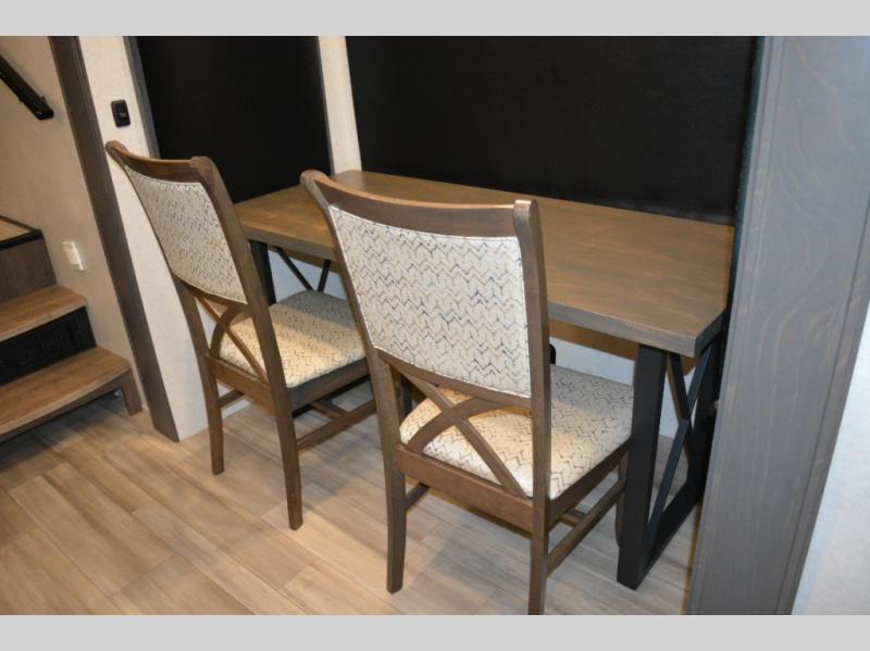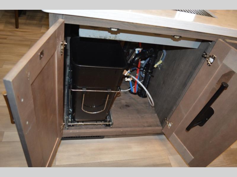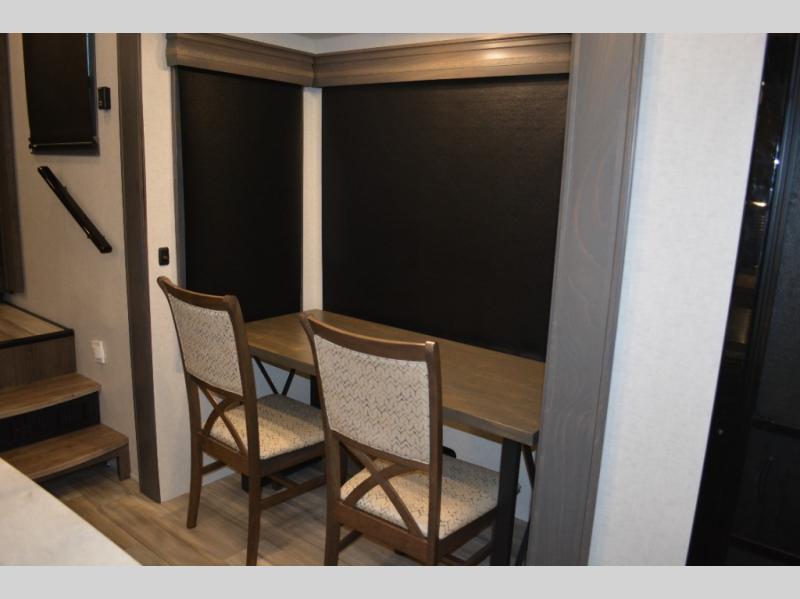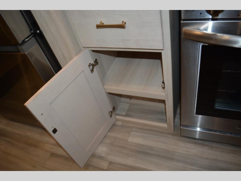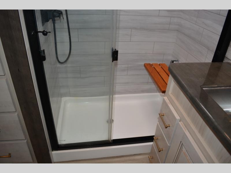 An active family will want this fifth wheel with its exterior basement pull-out tray that measures at 48" x 115" to load up your kayaks and such. Just above this area is the master suite with a rear bathroom that offers a residential shower, a porcelain toilet with soft close seat, plus a wardrobe and shelf storage. The king bed slide gives you more floor space, and you will have a seat, a flip-top dresser, and a Smart TV to watch. The half bath is next to the main entry which is super convenient, and the middle kitchen is separate from the front living area. The cook will love the residential microwave, range and oven, plus the option to add a residential refrigerator, plus the pantry, and the extra counter space on the kitchen island with a stainless steel farm sink. And the views out of the atrium windows in the slide out which includes the floating dinette table are a must see. And when you need to watch the big game, the 55" Smart TV with pull-out fireplace below are up front with the dual recliner love seat and two sleeper sofas.