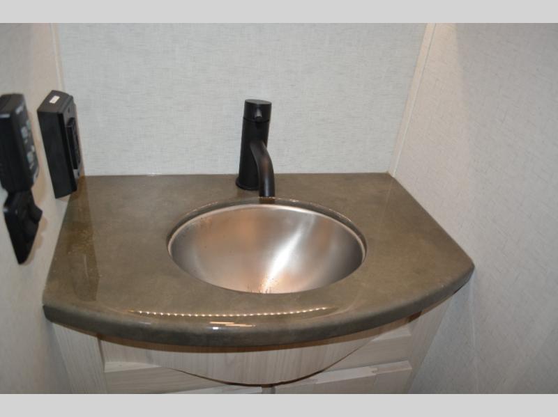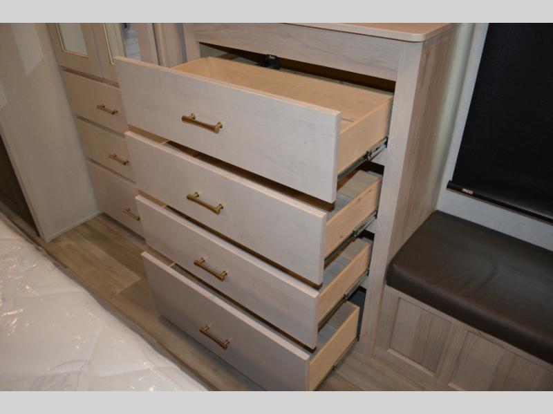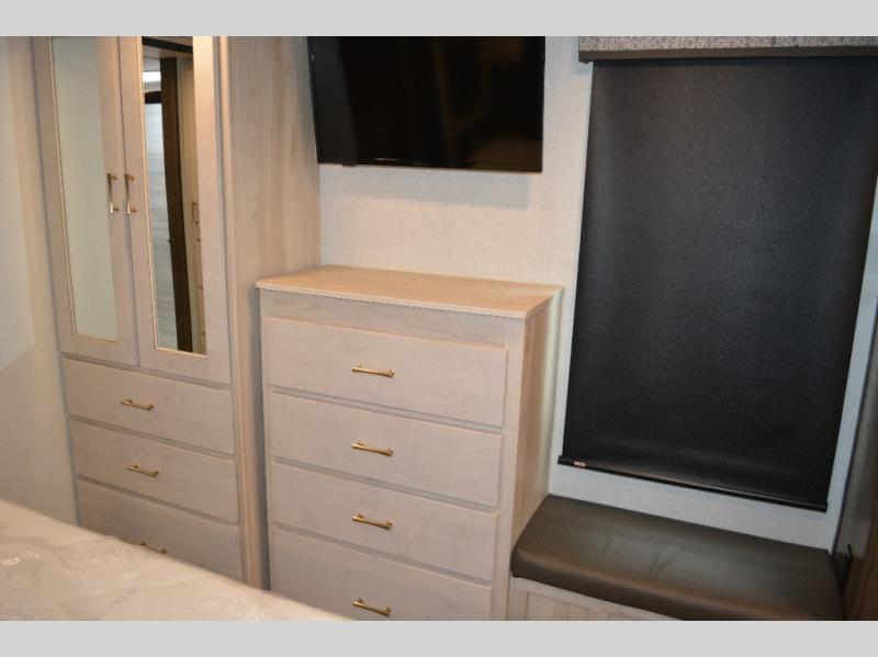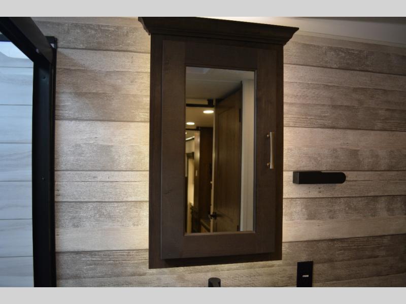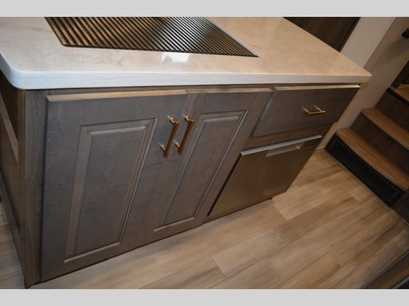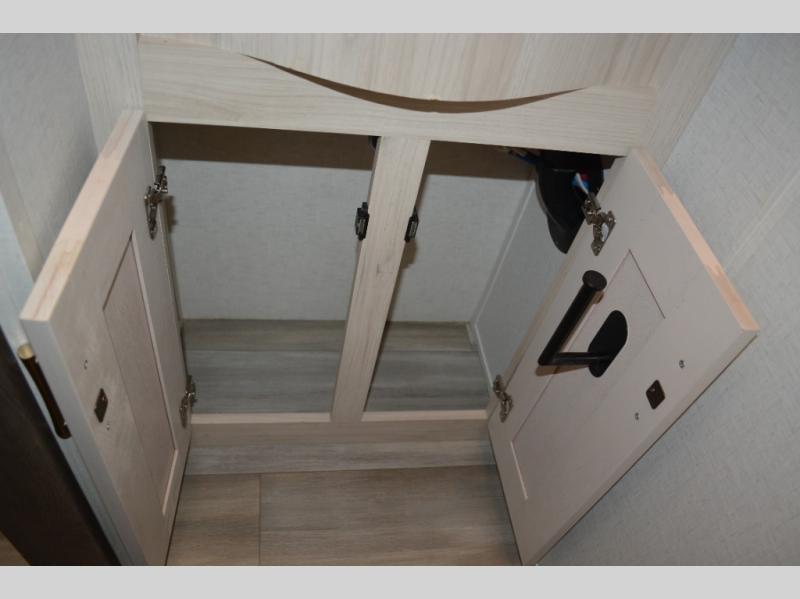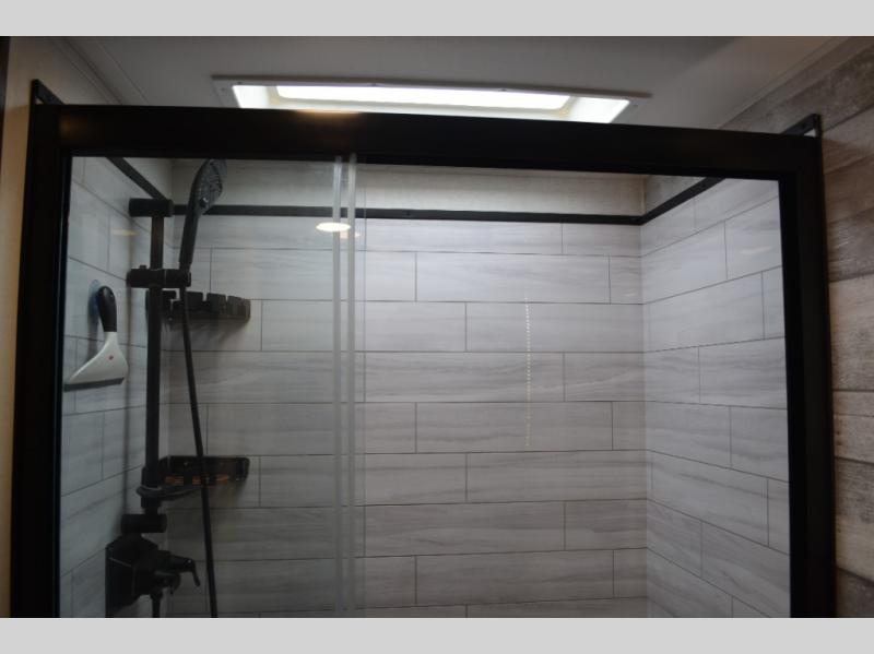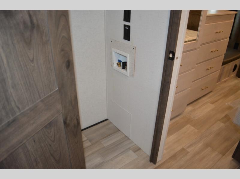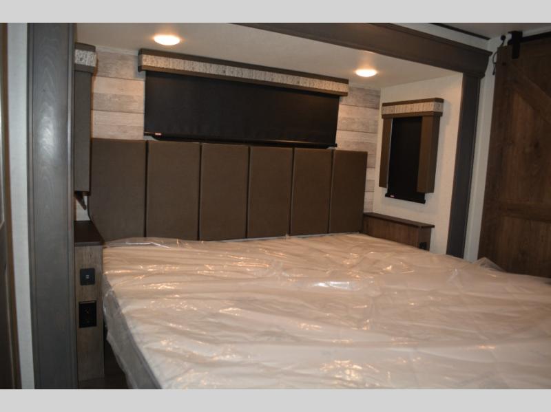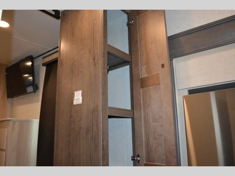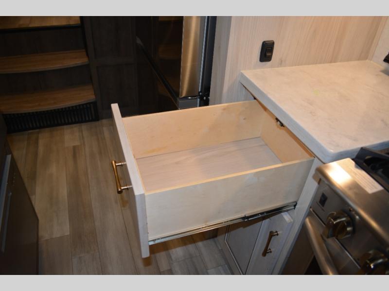 An active family will want this fifth wheel with its exterior basement pull-out tray that measures at 48" x 115" to load up your kayaks and such. Just above this area is the master suite with a rear bathroom that offers a residential shower, a porcelain toilet with soft close seat, plus a wardrobe and shelf storage. The king bed slide gives you more floor space, and you will have a seat, a flip-top dresser, and a Smart TV to watch. The half bath is next to the main entry which is super convenient, and the middle kitchen is separate from the front living area. The cook will love the residential microwave, range and oven, plus the option to add a residential refrigerator, plus the pantry, and the extra counter space on the kitchen island with a stainless steel farm sink. And the views out of the atrium windows in the slide out which includes the floating dinette table are a must see. And when you need to watch the big game, the 55" Smart TV with pull-out fireplace below are up front with the dual recliner love seat and two sleeper sofas.