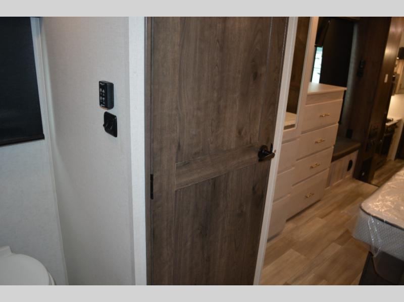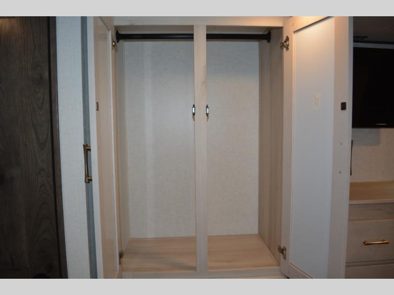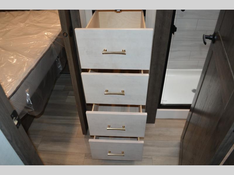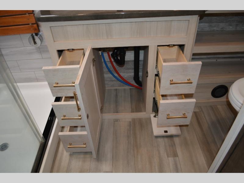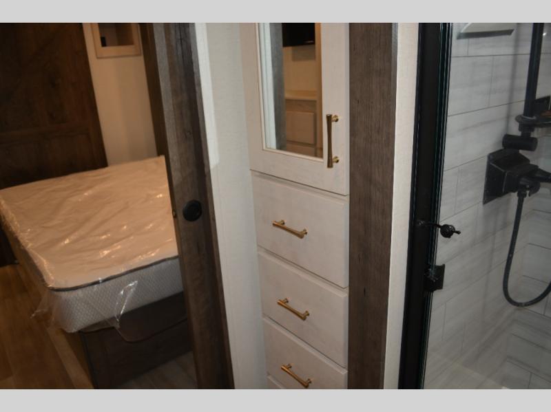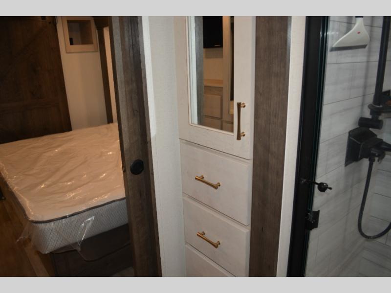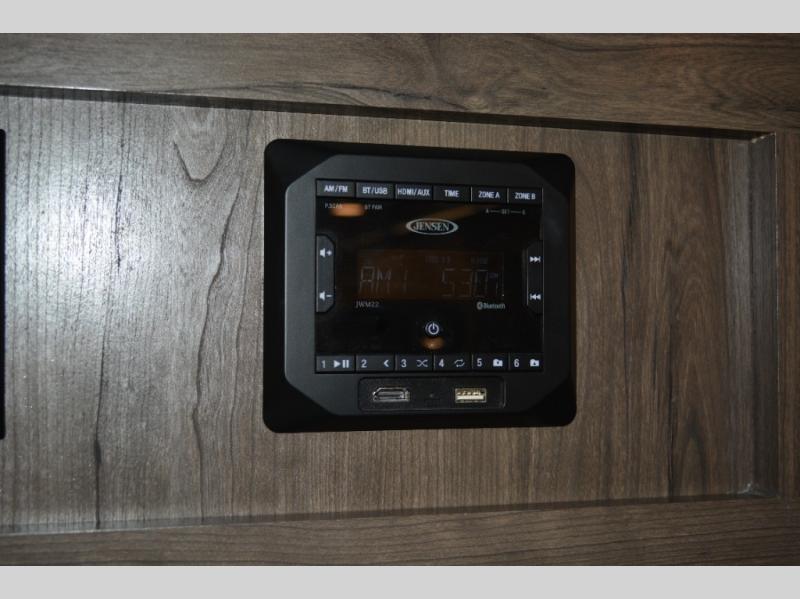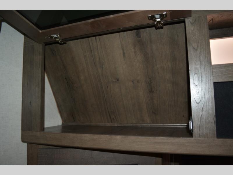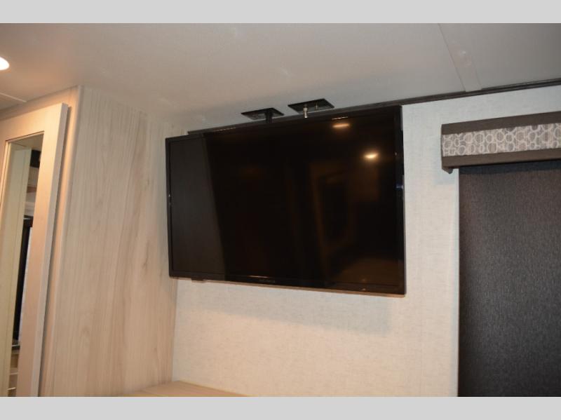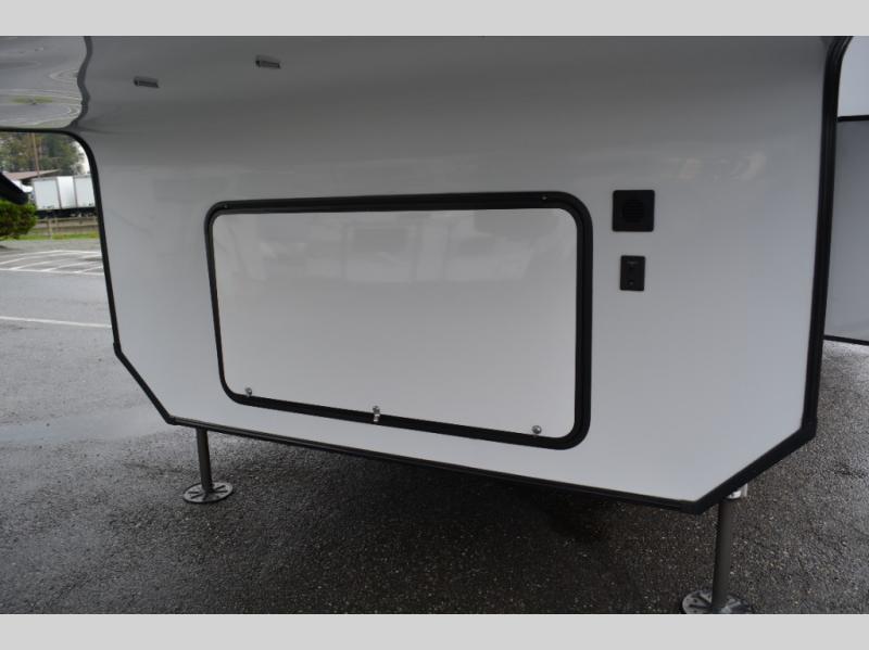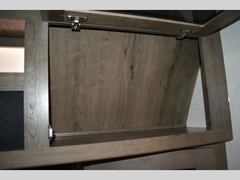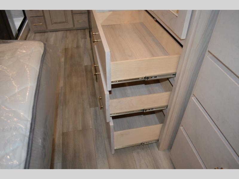 An active family will want this fifth wheel with its exterior basement pull-out tray that measures at 48" x 115" to load up your kayaks and such. Just above this area is the master suite with a rear bathroom that offers a residential shower, a porcelain toilet with soft close seat, plus a wardrobe and shelf storage. The king bed slide gives you more floor space, and you will have a seat, a flip-top dresser, and a Smart TV to watch. The half bath is next to the main entry which is super convenient, and the middle kitchen is separate from the front living area. The cook will love the residential microwave, range and oven, plus the option to add a residential refrigerator, plus the pantry, and the extra counter space on the kitchen island with a stainless steel farm sink. And the views out of the atrium windows in the slide out which includes the floating dinette table are a must see. And when you need to watch the big game, the 55" Smart TV with pull-out fireplace below are up front with the dual recliner love seat and two sleeper sofas.