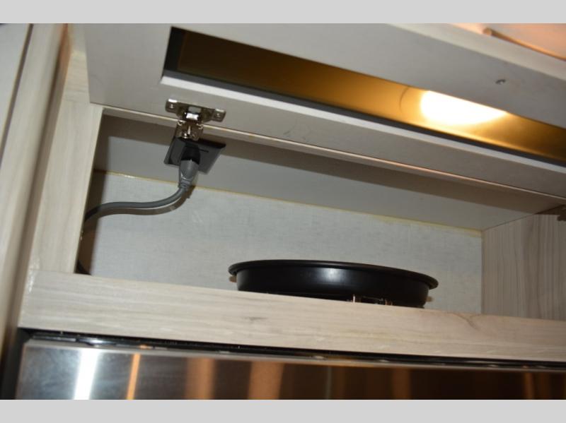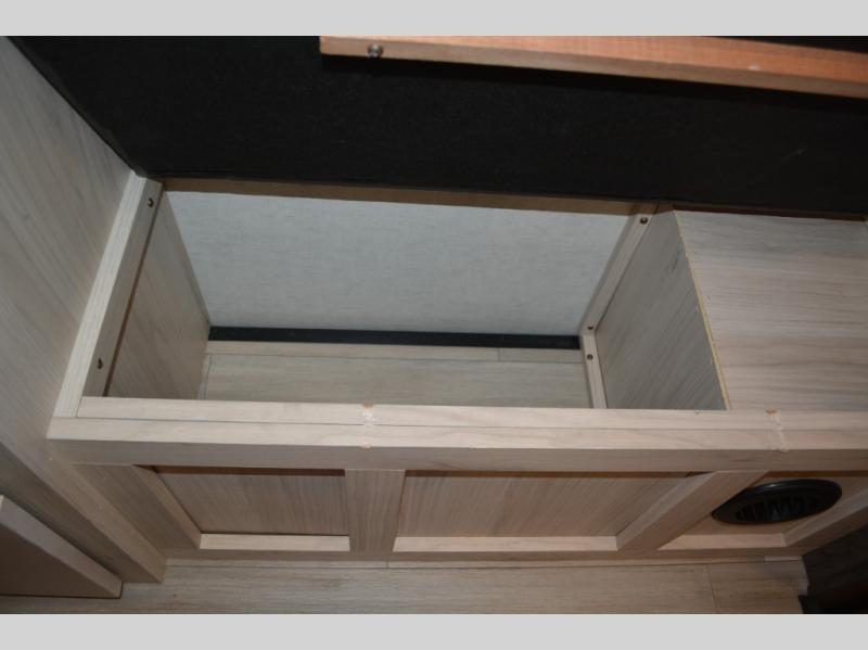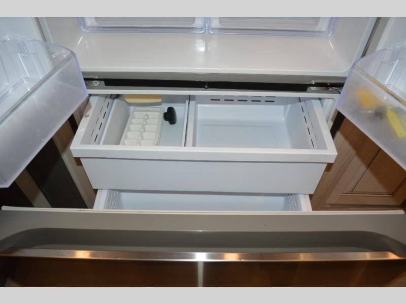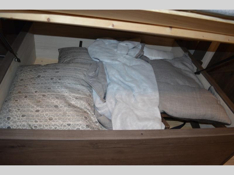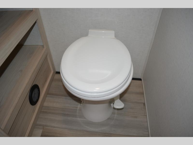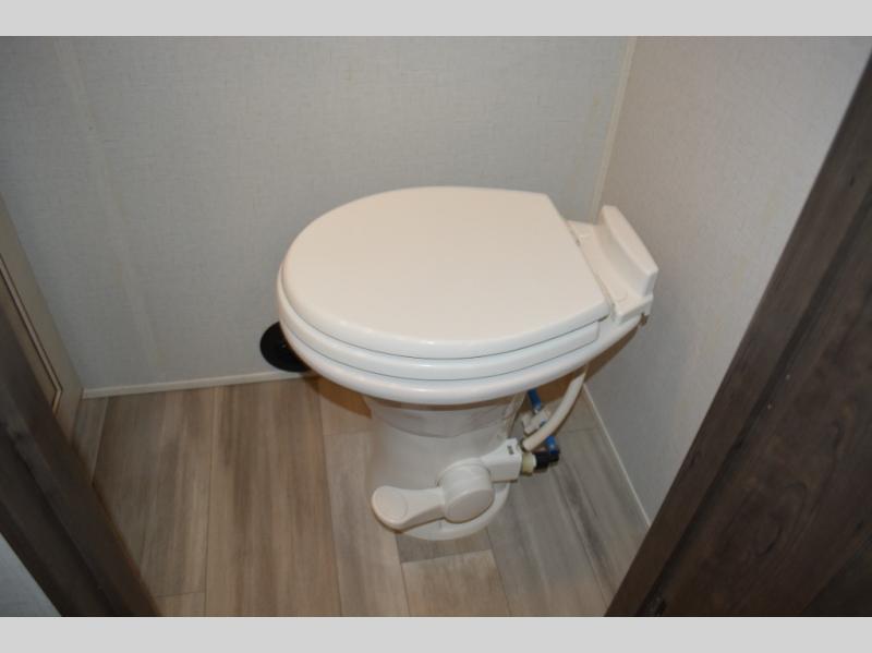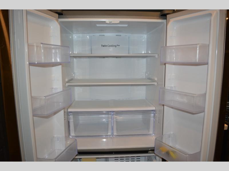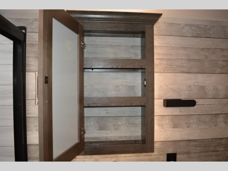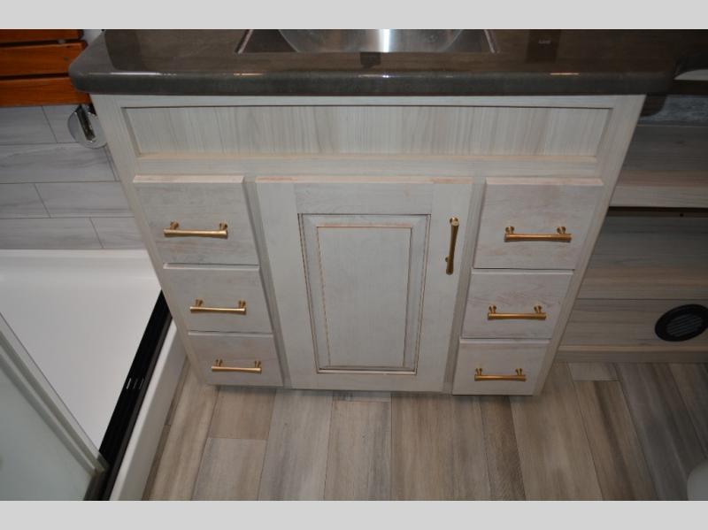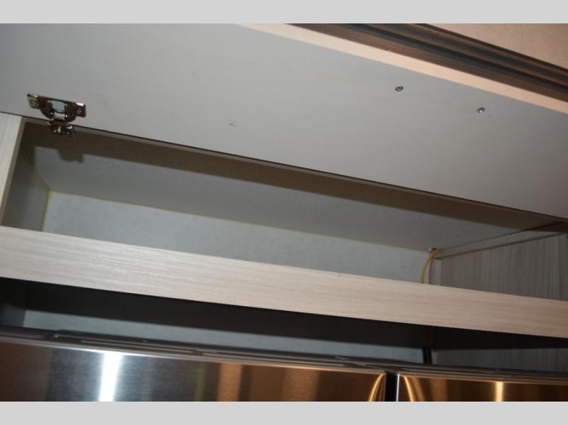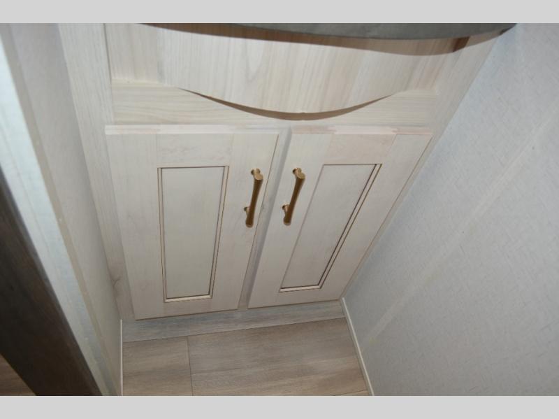 An active family will want this fifth wheel with its exterior basement pull-out tray that measures at 48" x 115" to load up your kayaks and such. Just above this area is the master suite with a rear bathroom that offers a residential shower, a porcelain toilet with soft close seat, plus a wardrobe and shelf storage. The king bed slide gives you more floor space, and you will have a seat, a flip-top dresser, and a Smart TV to watch. The half bath is next to the main entry which is super convenient, and the middle kitchen is separate from the front living area. The cook will love the residential microwave, range and oven, plus the option to add a residential refrigerator, plus the pantry, and the extra counter space on the kitchen island with a stainless steel farm sink. And the views out of the atrium windows in the slide out which includes the floating dinette table are a must see. And when you need to watch the big game, the 55" Smart TV with pull-out fireplace below are up front with the dual recliner love seat and two sleeper sofas.