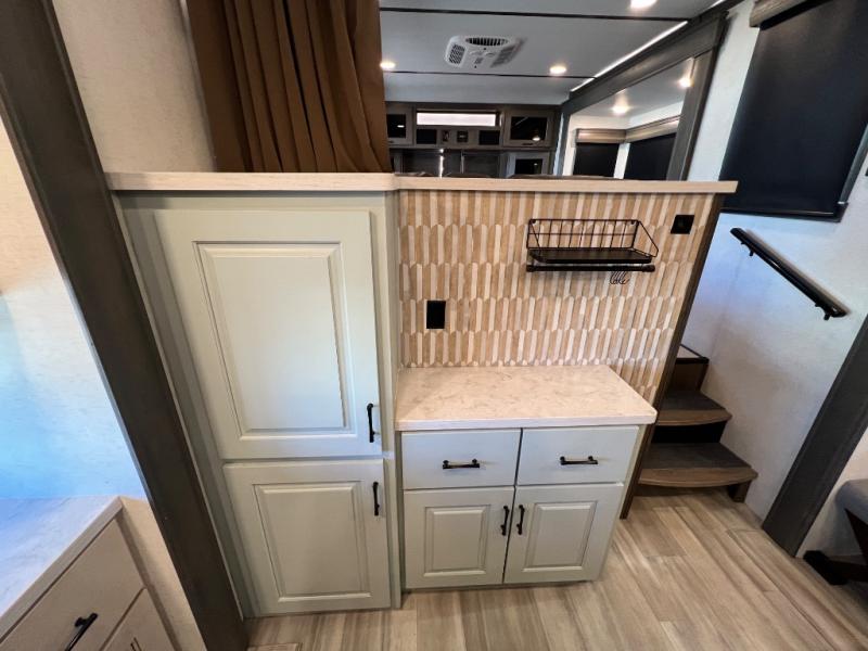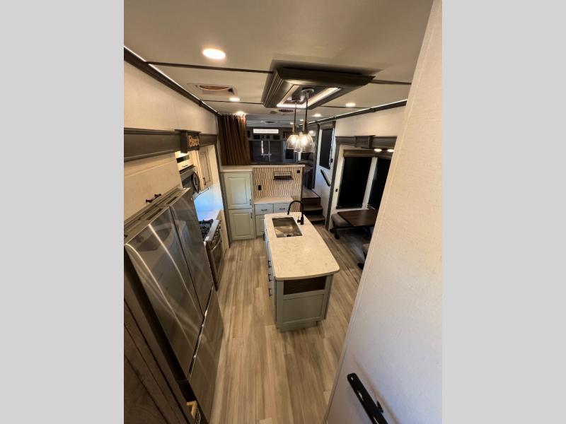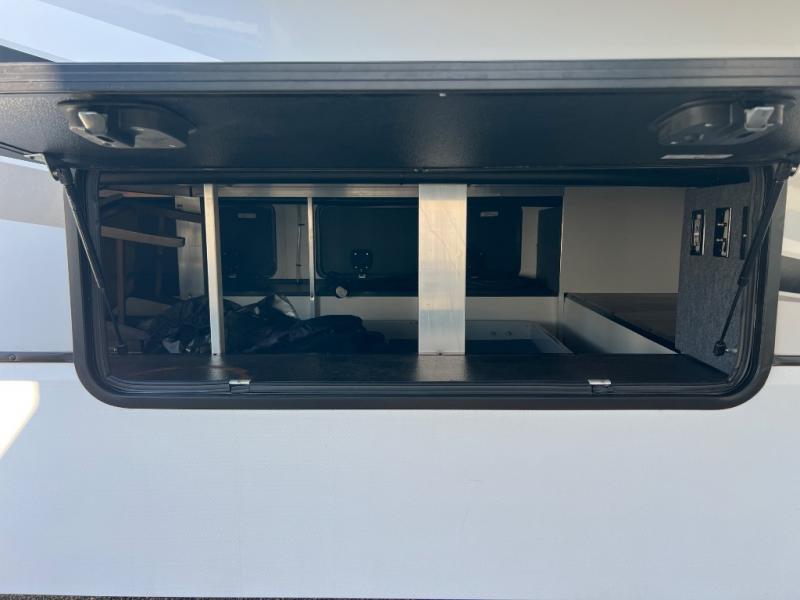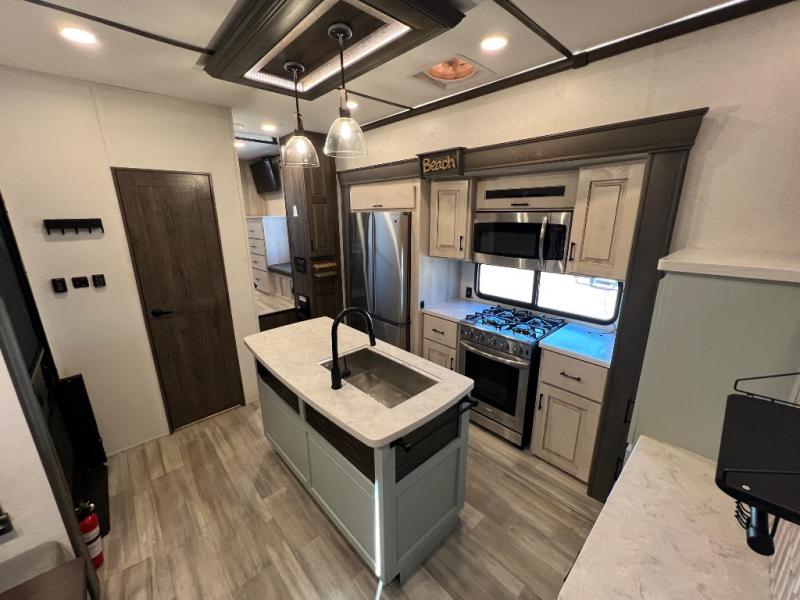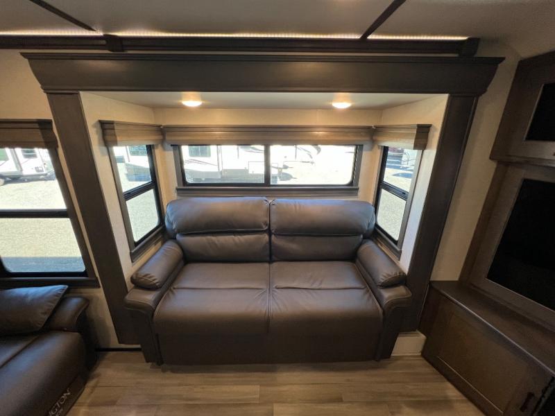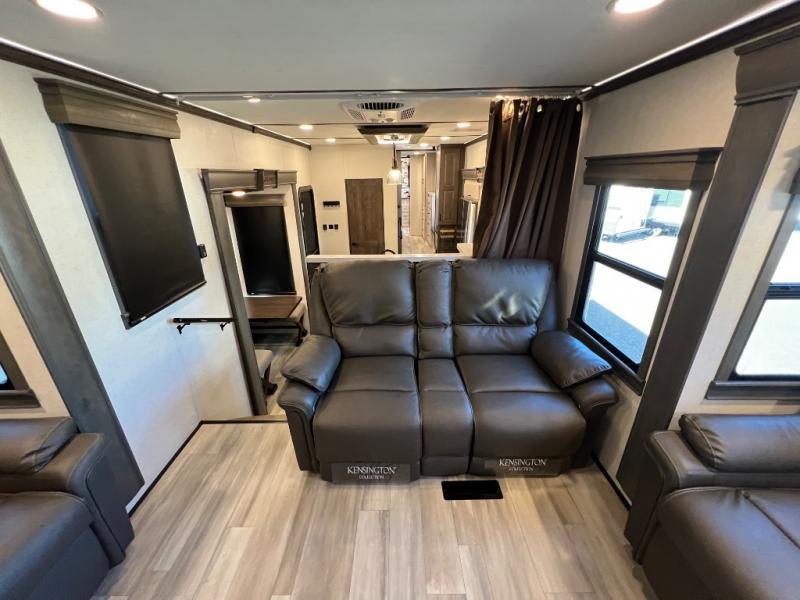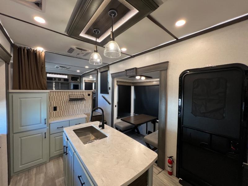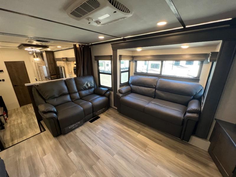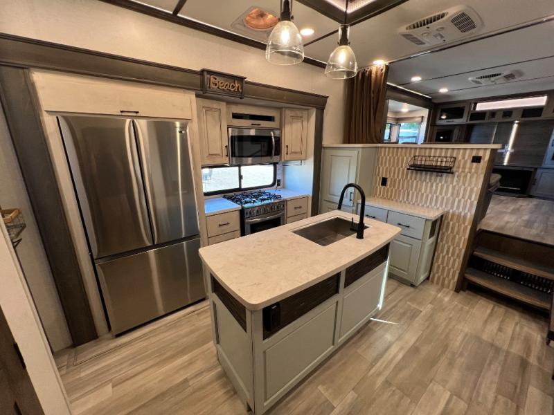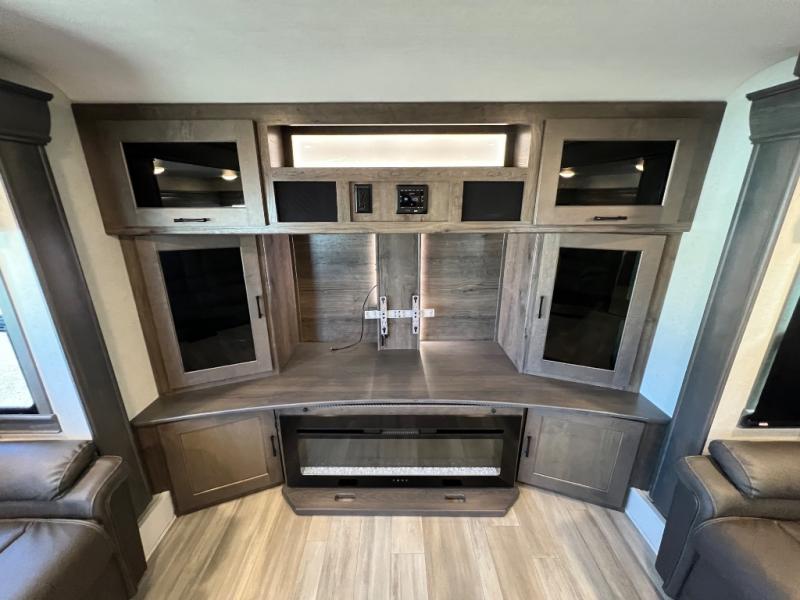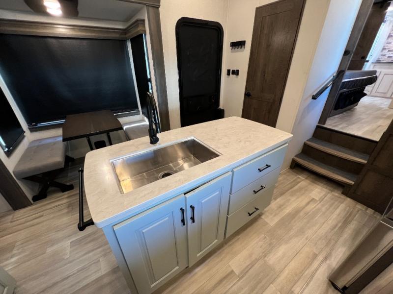 An active family will want this fifth wheel with its exterior basement pull-out tray that measures at 48" x 115" to load up your kayaks and such. Just above this area is the master suite with a rear bathroom that offers a residential shower, a porcelain toilet with soft close seat, plus a wardrobe and shelf storage. The king bed slide gives you more floor space, and you will have a seat, a flip-top dresser, and a Smart TV to watch. The half bath is next to the main entry which is super convenient, and the middle kitchen is separate from the front living area. The cook will love the residential microwave, range and oven, plus the option to add a residential refrigerator, plus the pantry, and the extra counter space on the kitchen island with a stainless steel farm sink. And the views out of the atrium windows in the slide out which includes the floating dinette table are a must see. And when you need to watch the big game, the 55" Smart TV with pull-out fireplace below are up front with the dual recliner love seat and two sleeper sofas.