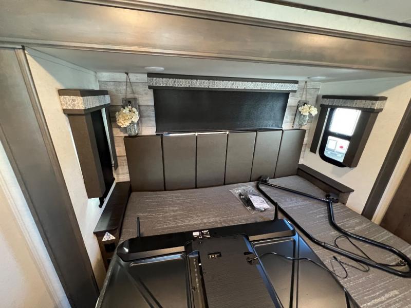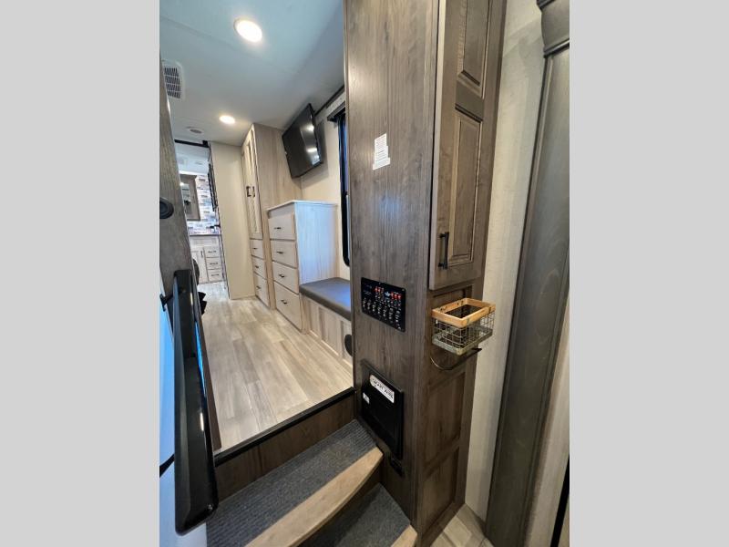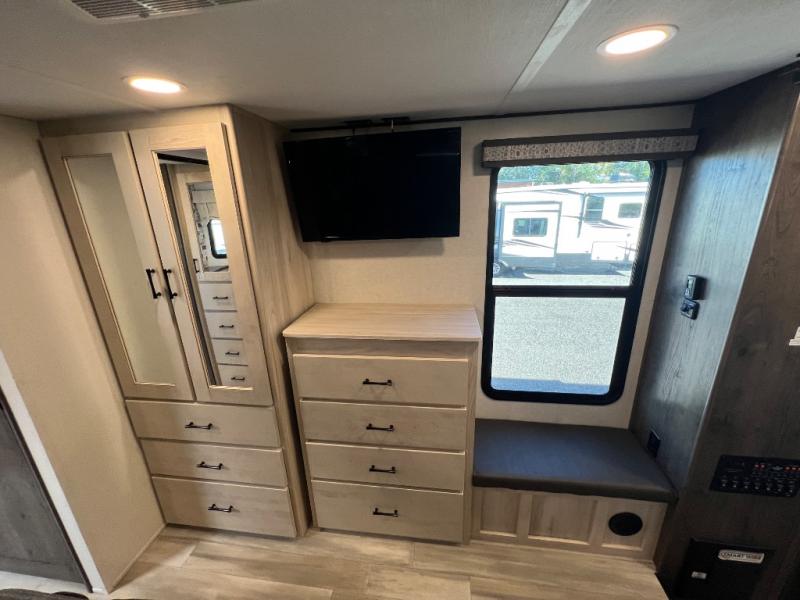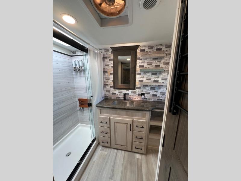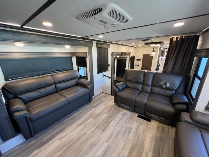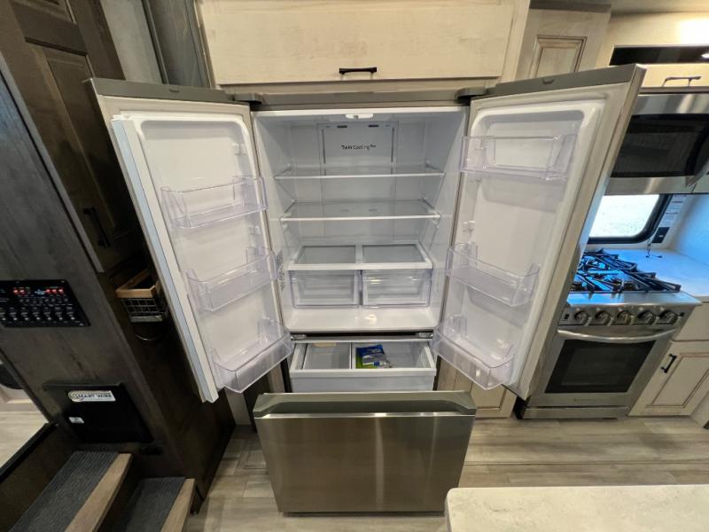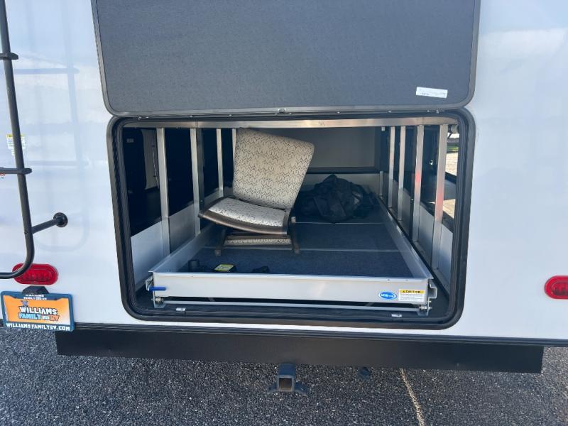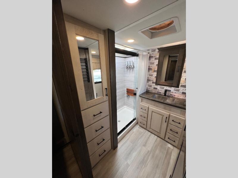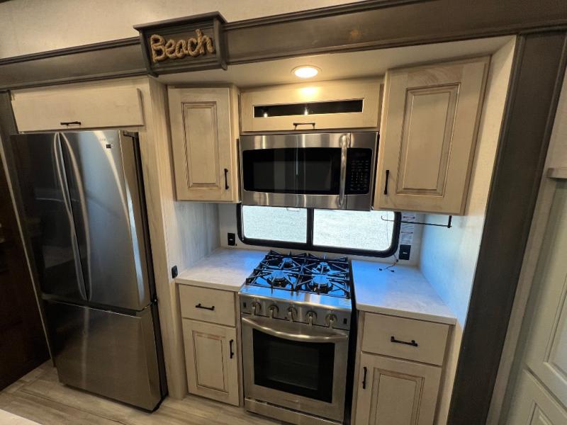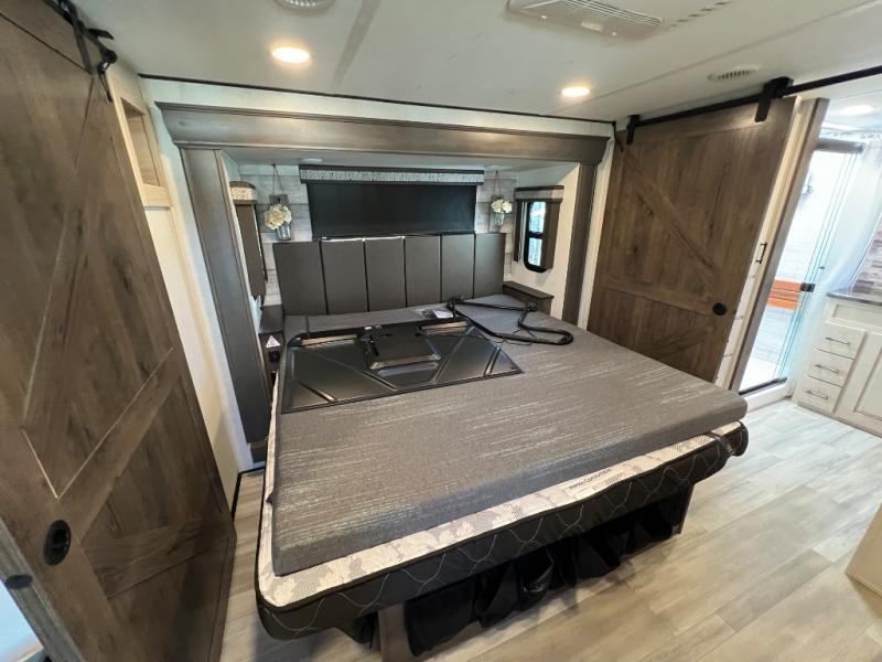 An active family will want this fifth wheel with its exterior basement pull-out tray that measures at 48" x 115" to load up your kayaks and such. Just above this area is the master suite with a rear bathroom that offers a residential shower, a porcelain toilet with soft close seat, plus a wardrobe and shelf storage. The king bed slide gives you more floor space, and you will have a seat, a flip-top dresser, and a Smart TV to watch. The half bath is next to the main entry which is super convenient, and the middle kitchen is separate from the front living area. The cook will love the residential microwave, range and oven, plus the option to add a residential refrigerator, plus the pantry, and the extra counter space on the kitchen island with a stainless steel farm sink. And the views out of the atrium windows in the slide out which includes the floating dinette table are a must see. And when you need to watch the big game, the 55" Smart TV with pull-out fireplace below are up front with the dual recliner love seat and two sleeper sofas.