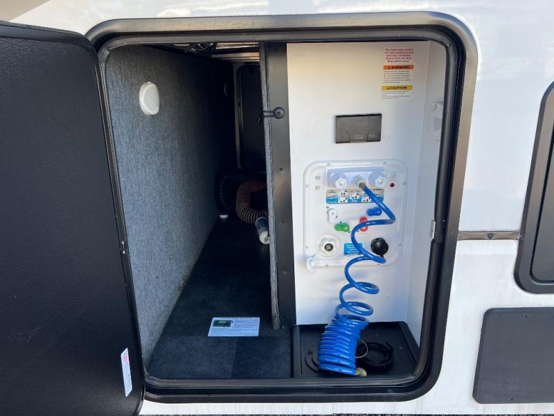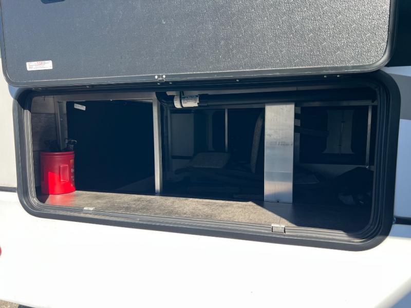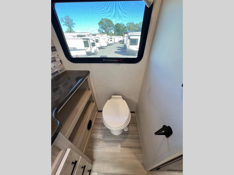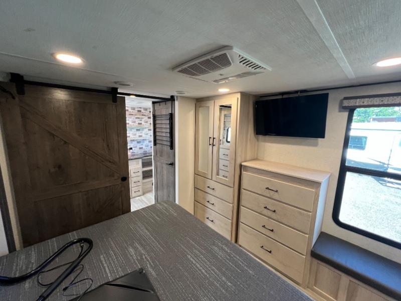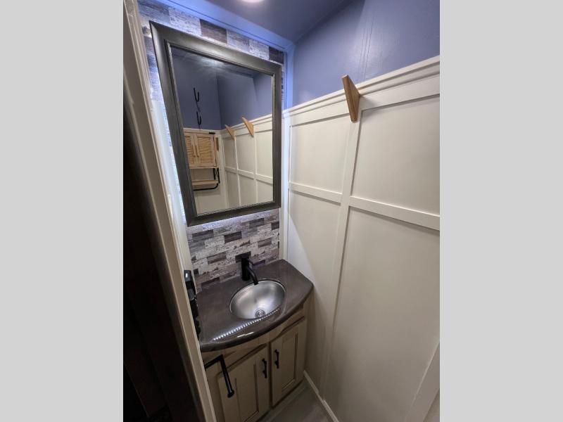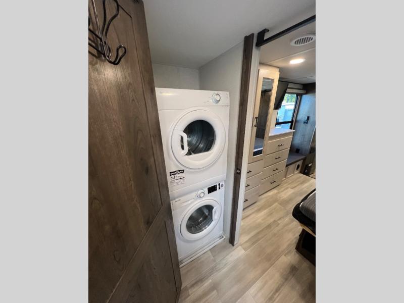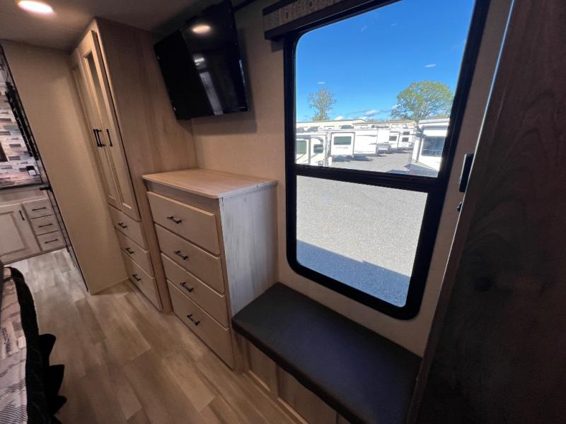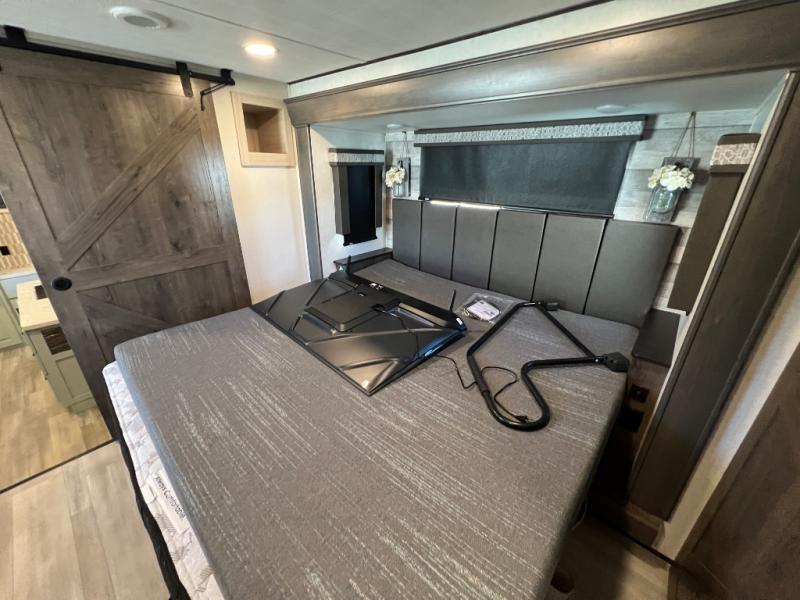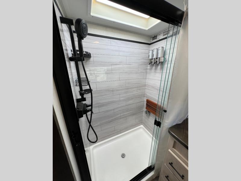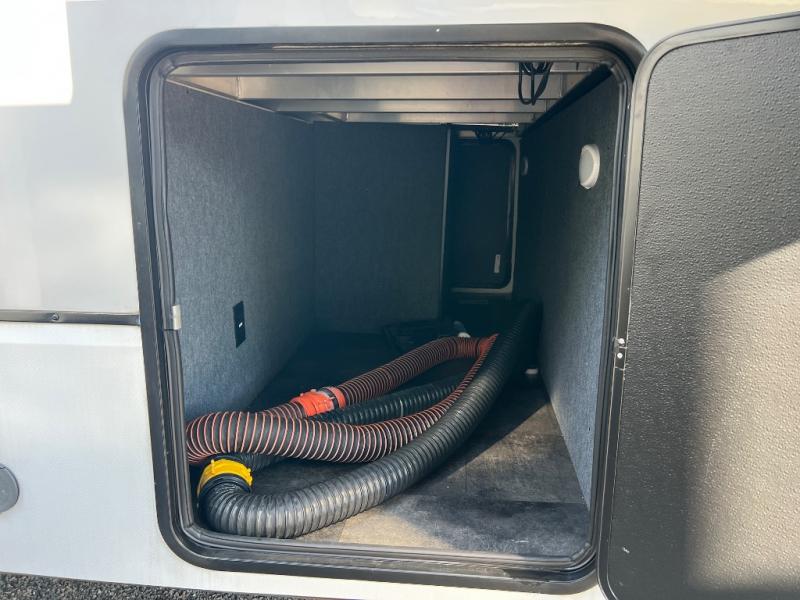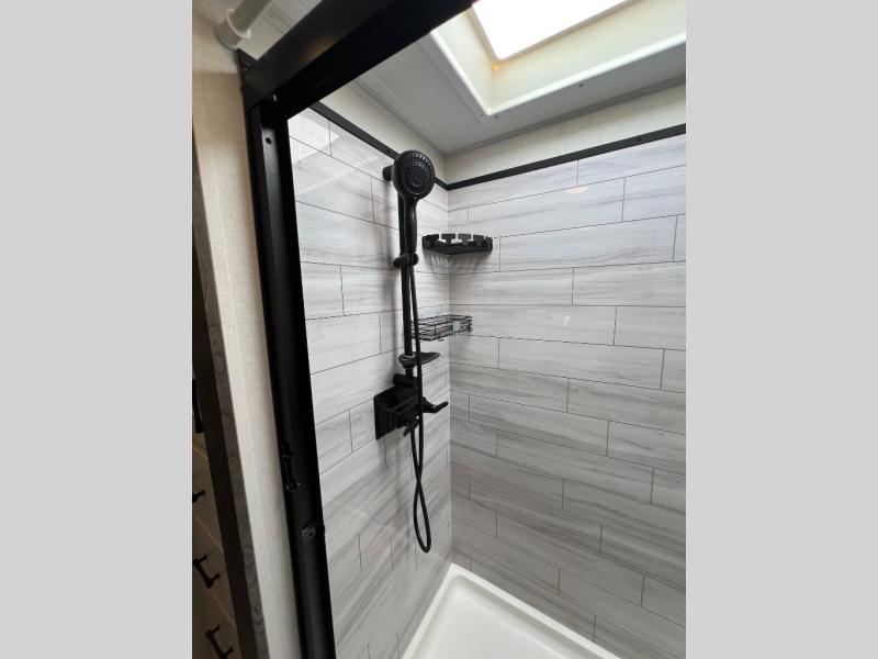 An active family will want this fifth wheel with its exterior basement pull-out tray that measures at 48" x 115" to load up your kayaks and such. Just above this area is the master suite with a rear bathroom that offers a residential shower, a porcelain toilet with soft close seat, plus a wardrobe and shelf storage. The king bed slide gives you more floor space, and you will have a seat, a flip-top dresser, and a Smart TV to watch. The half bath is next to the main entry which is super convenient, and the middle kitchen is separate from the front living area. The cook will love the residential microwave, range and oven, plus the option to add a residential refrigerator, plus the pantry, and the extra counter space on the kitchen island with a stainless steel farm sink. And the views out of the atrium windows in the slide out which includes the floating dinette table are a must see. And when you need to watch the big game, the 55" Smart TV with pull-out fireplace below are up front with the dual recliner love seat and two sleeper sofas.