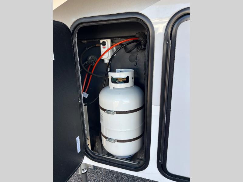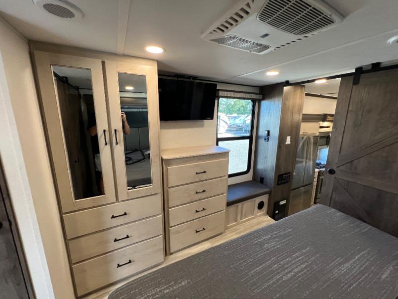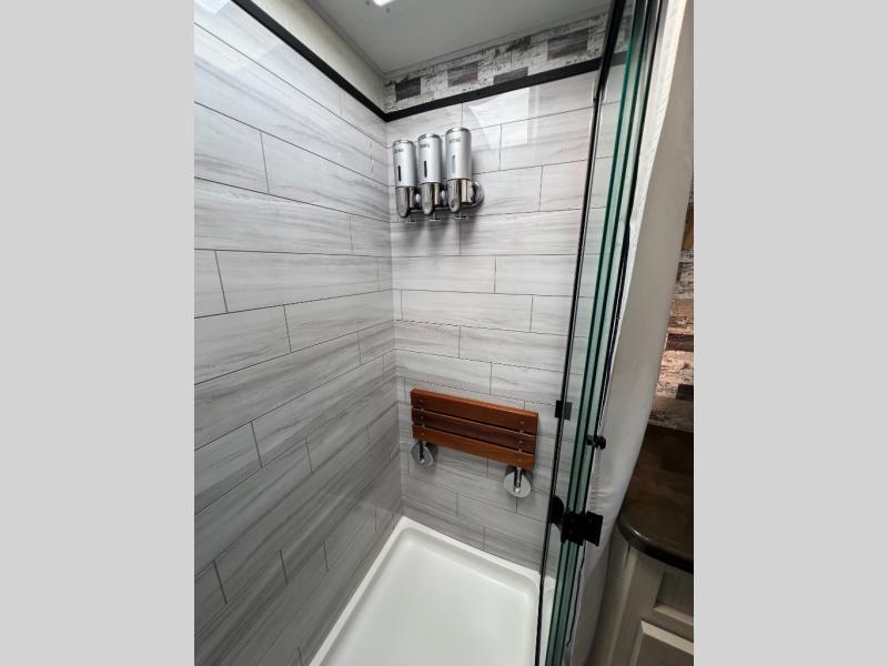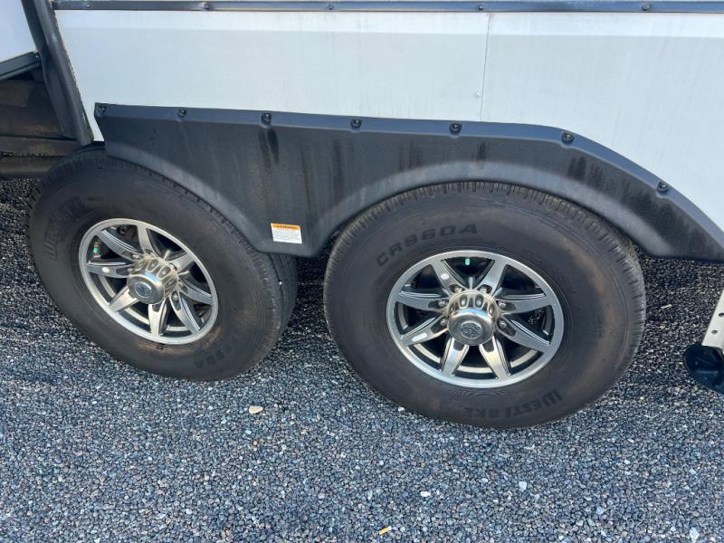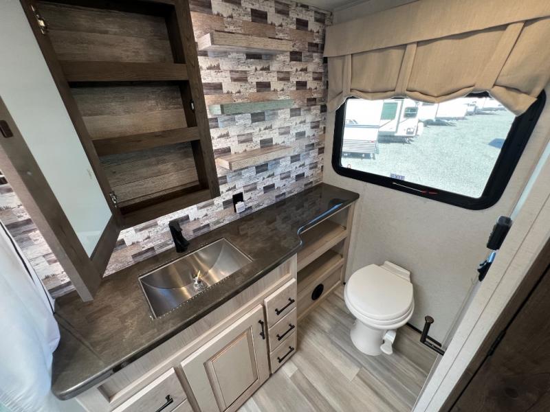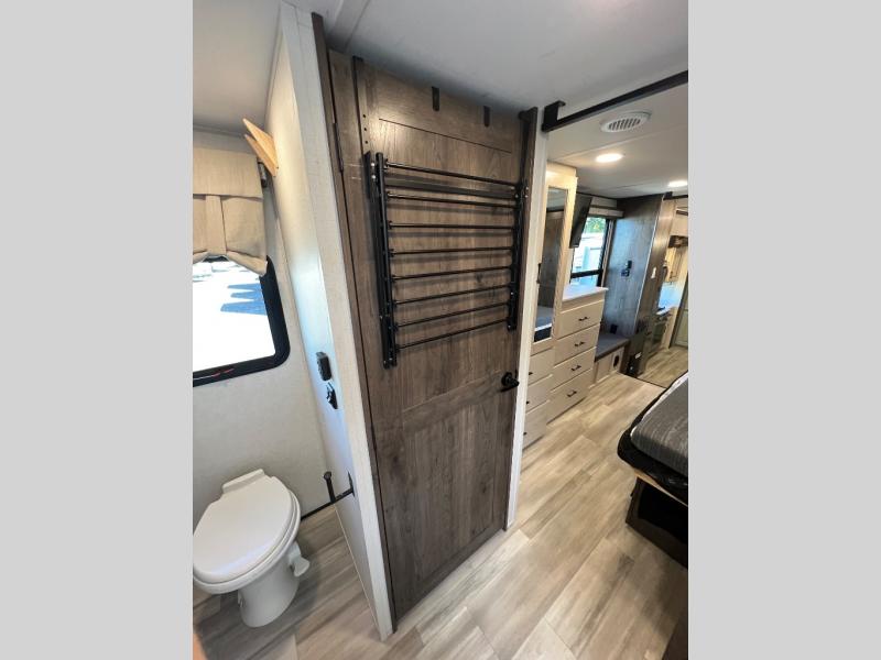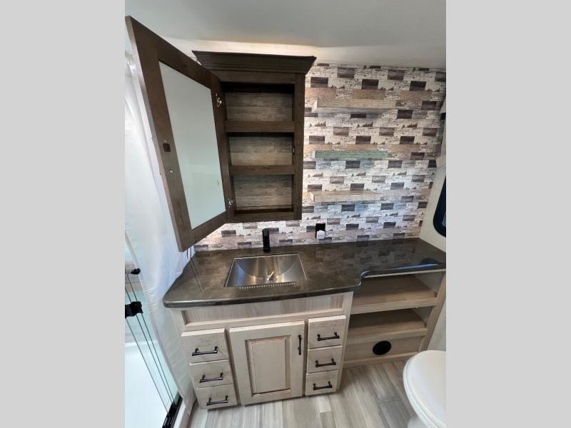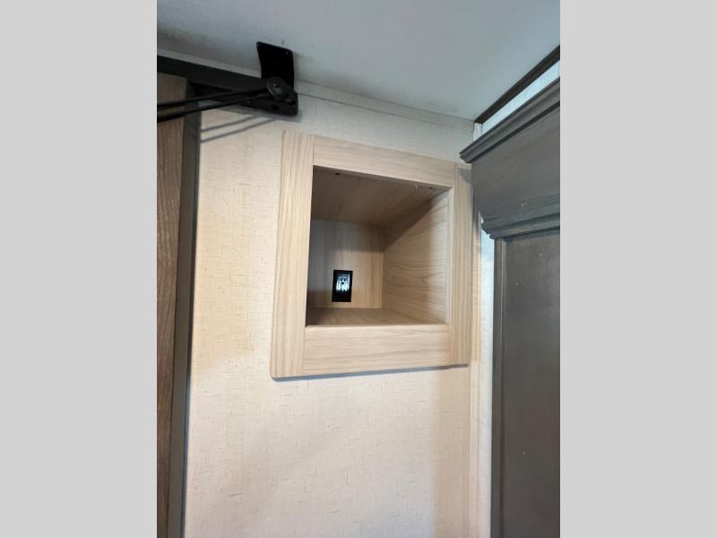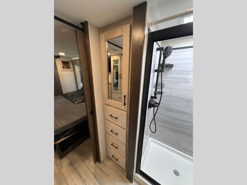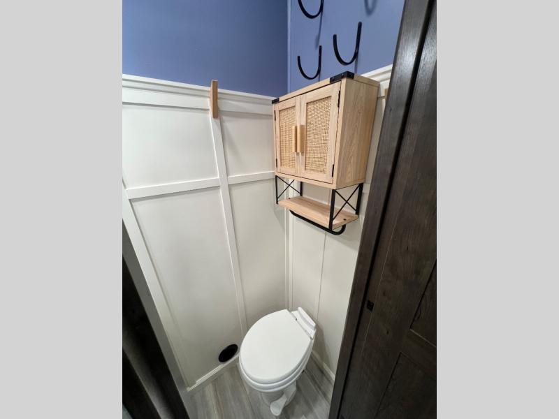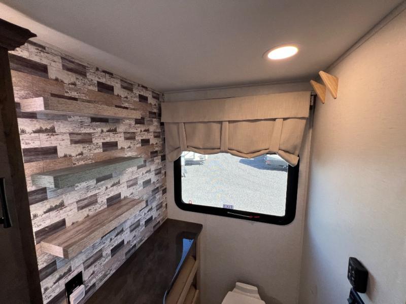 An active family will want this fifth wheel with its exterior basement pull-out tray that measures at 48" x 115" to load up your kayaks and such. Just above this area is the master suite with a rear bathroom that offers a residential shower, a porcelain toilet with soft close seat, plus a wardrobe and shelf storage. The king bed slide gives you more floor space, and you will have a seat, a flip-top dresser, and a Smart TV to watch. The half bath is next to the main entry which is super convenient, and the middle kitchen is separate from the front living area. The cook will love the residential microwave, range and oven, plus the option to add a residential refrigerator, plus the pantry, and the extra counter space on the kitchen island with a stainless steel farm sink. And the views out of the atrium windows in the slide out which includes the floating dinette table are a must see. And when you need to watch the big game, the 55" Smart TV with pull-out fireplace below are up front with the dual recliner love seat and two sleeper sofas.