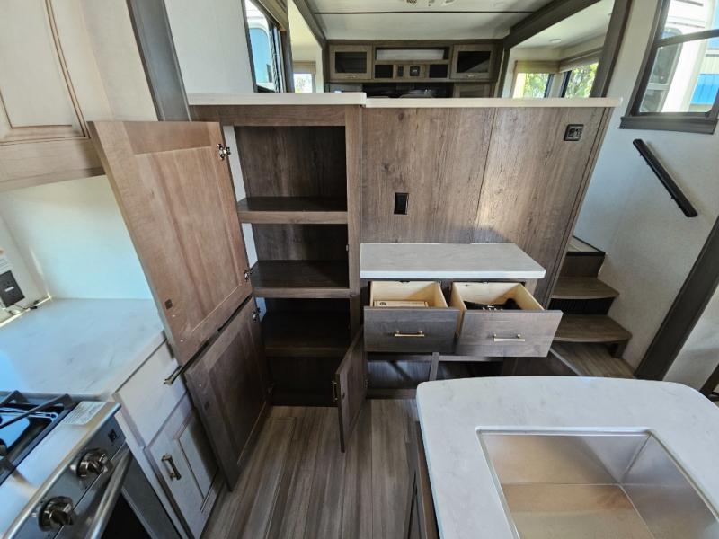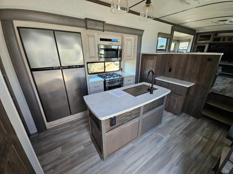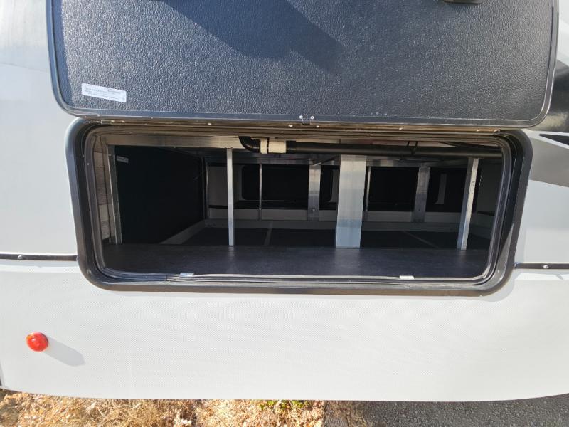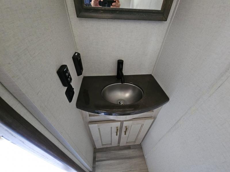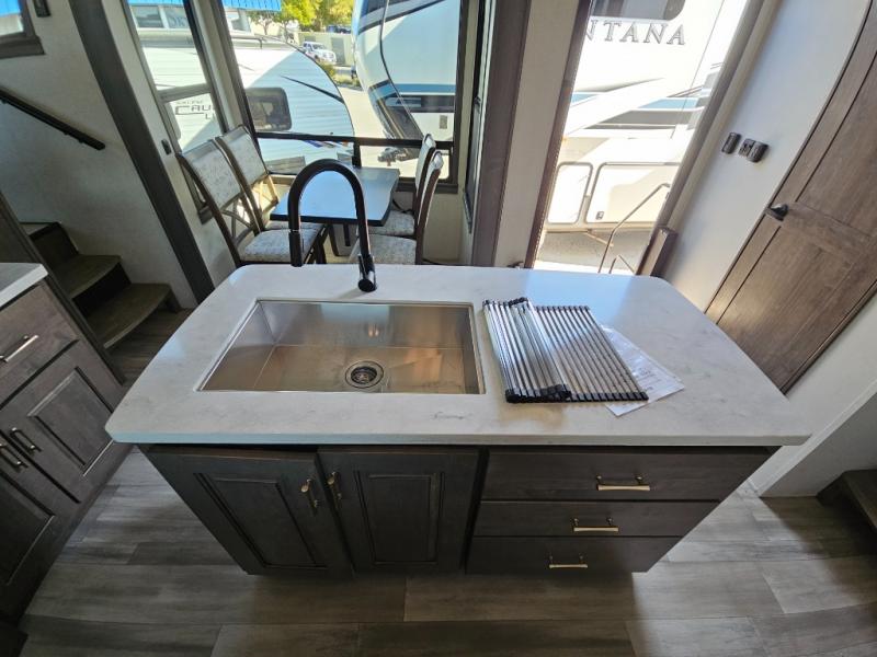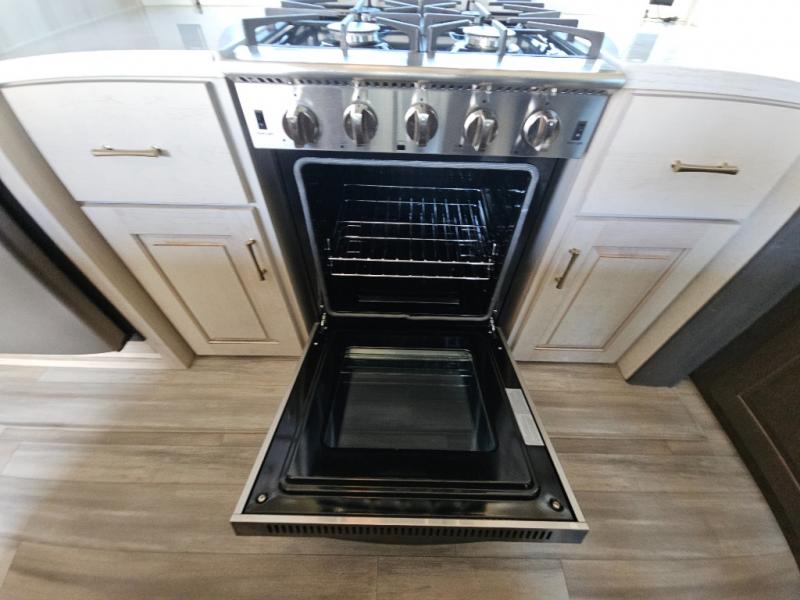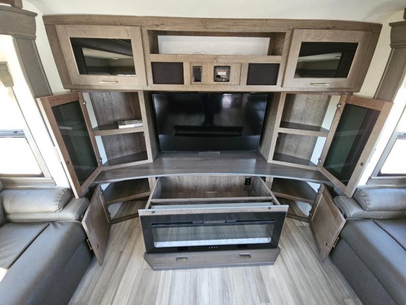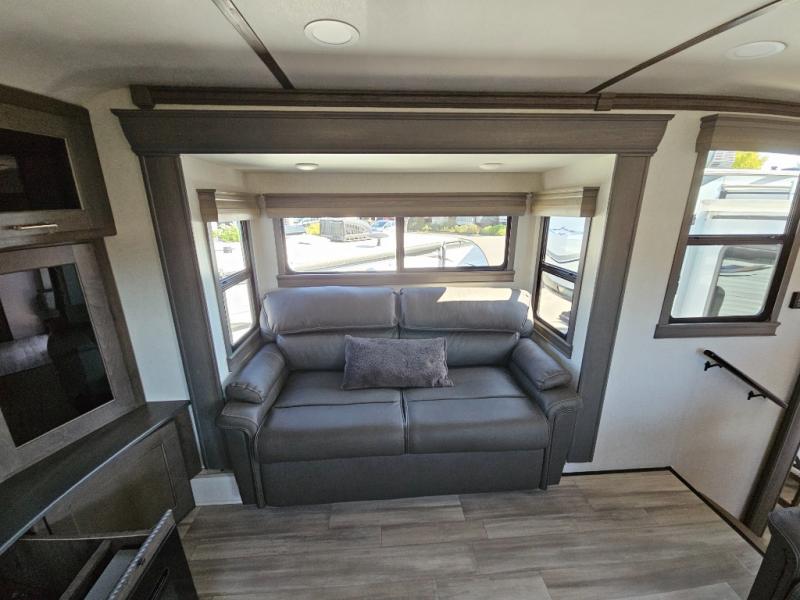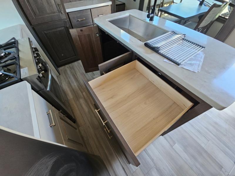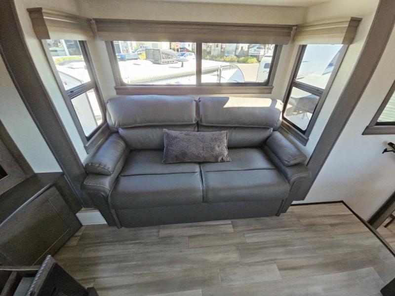 An active family will want this fifth wheel with its exterior basement pull-out tray that measures at 48" x 115" to load up your kayaks and such. Just above this area is the master suite with a rear bathroom that offers a residential shower, a porcelain toilet with soft close seat, plus a wardrobe and shelf storage. The king bed slide gives you more floor space, and you will have a seat, a flip-top dresser, and a Smart TV to watch. The half bath is next to the main entry which is super convenient, and the middle kitchen is separate from the front living area. The cook will love the residential microwave, range and oven, plus the option to add a residential refrigerator, plus the pantry, and the extra counter space on the kitchen island with a stainless steel farm sink. And the views out of the atrium windows in the slide out which includes the floating dinette table are a must see. And when you need to watch the big game, the 55" Smart TV with pull-out fireplace below are up front with the dual recliner love seat and two sleeper sofas.
