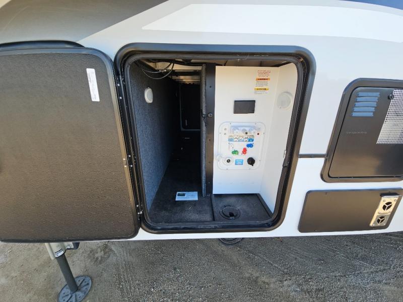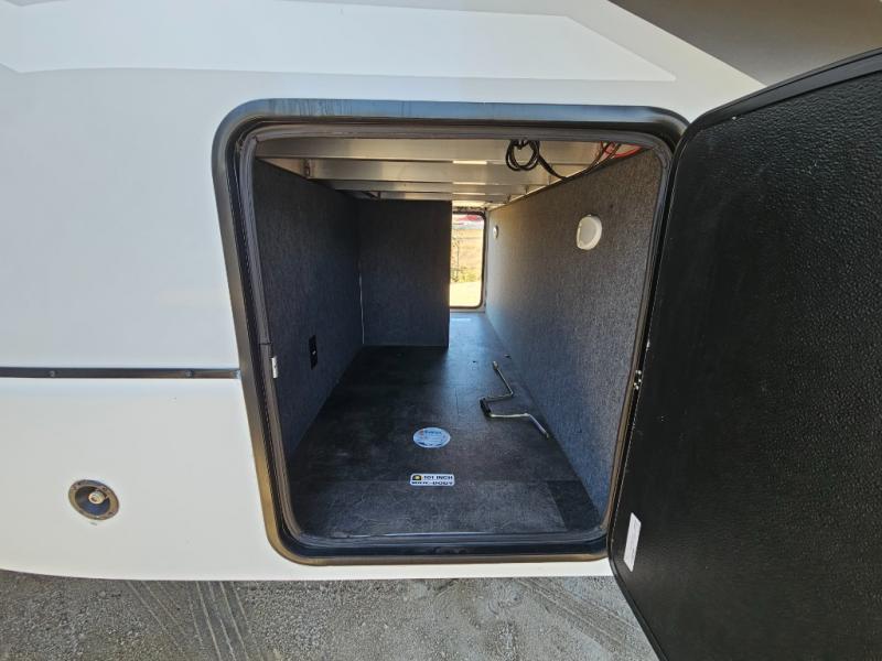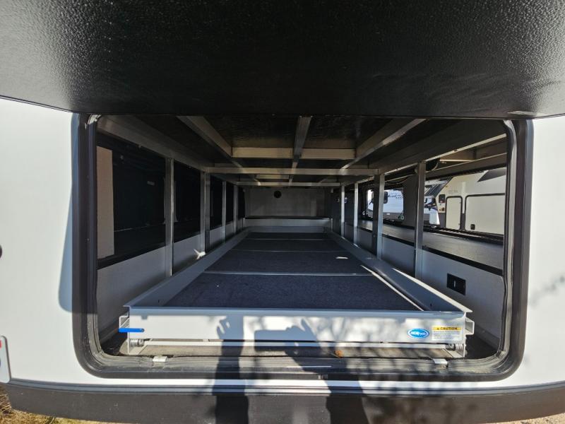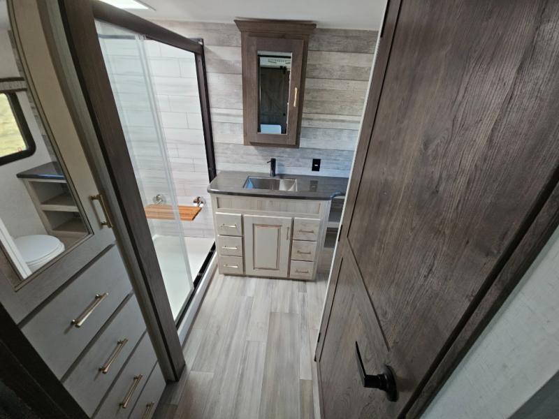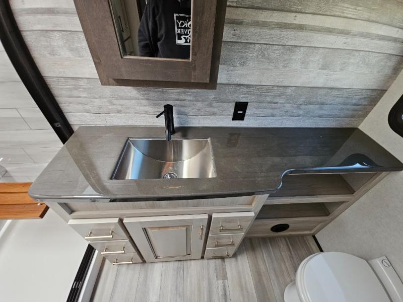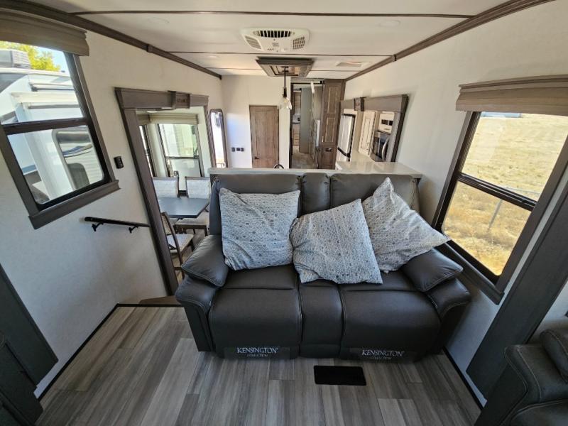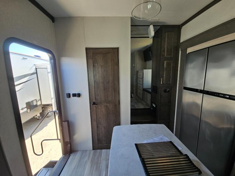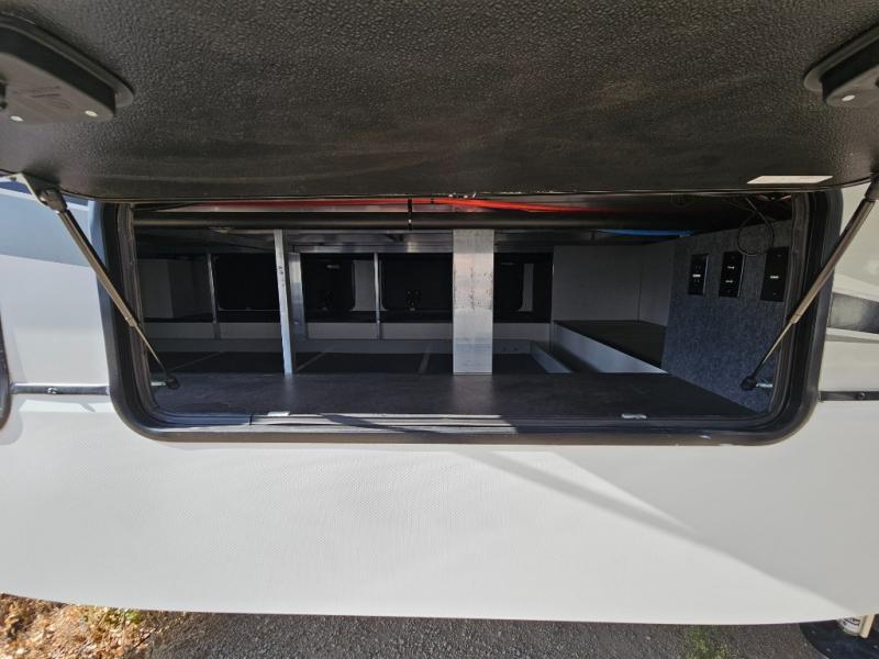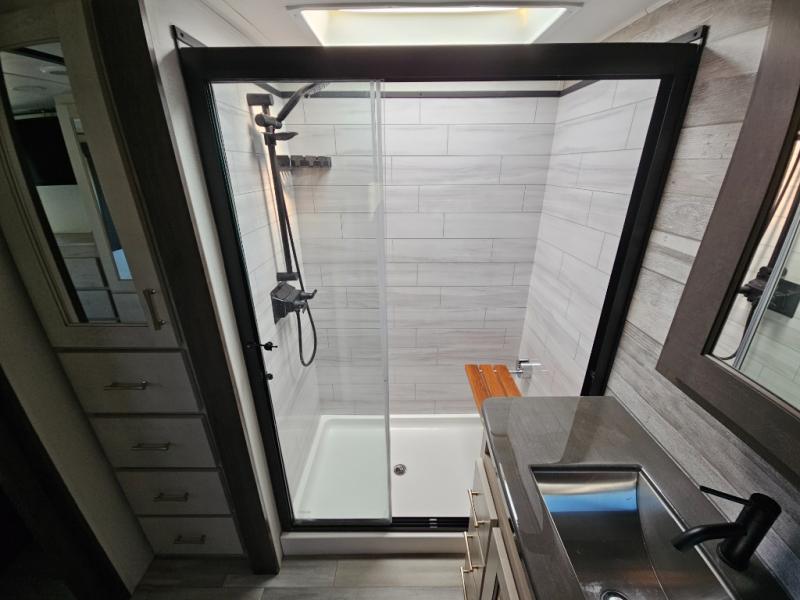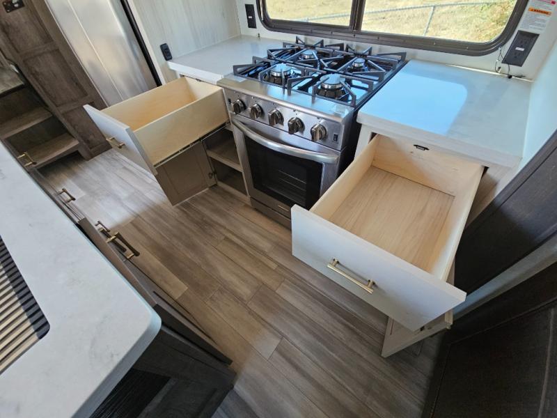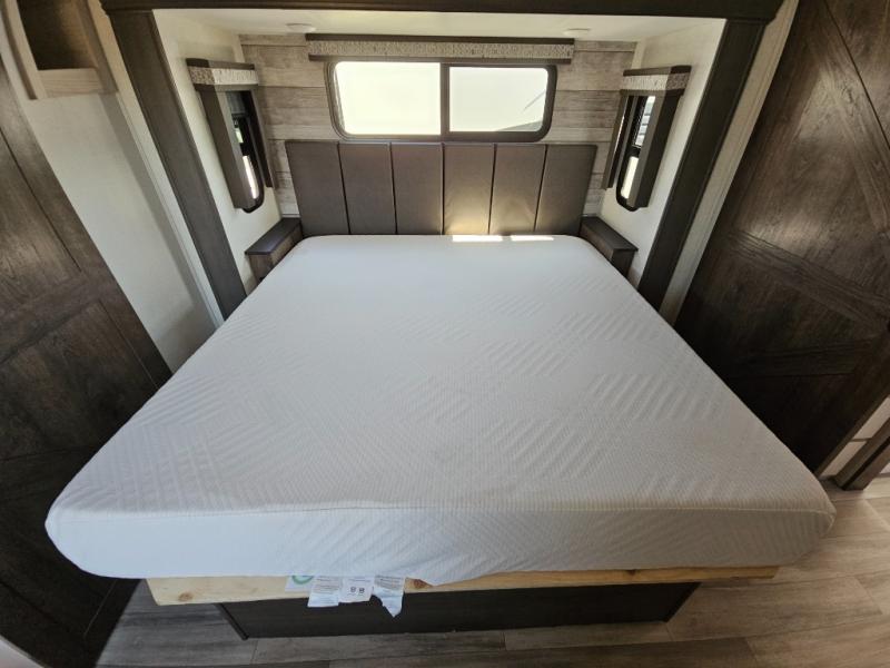 An active family will want this fifth wheel with its exterior basement pull-out tray that measures at 48" x 115" to load up your kayaks and such. Just above this area is the master suite with a rear bathroom that offers a residential shower, a porcelain toilet with soft close seat, plus a wardrobe and shelf storage. The king bed slide gives you more floor space, and you will have a seat, a flip-top dresser, and a Smart TV to watch. The half bath is next to the main entry which is super convenient, and the middle kitchen is separate from the front living area. The cook will love the residential microwave, range and oven, plus the option to add a residential refrigerator, plus the pantry, and the extra counter space on the kitchen island with a stainless steel farm sink. And the views out of the atrium windows in the slide out which includes the floating dinette table are a must see. And when you need to watch the big game, the 55" Smart TV with pull-out fireplace below are up front with the dual recliner love seat and two sleeper sofas.