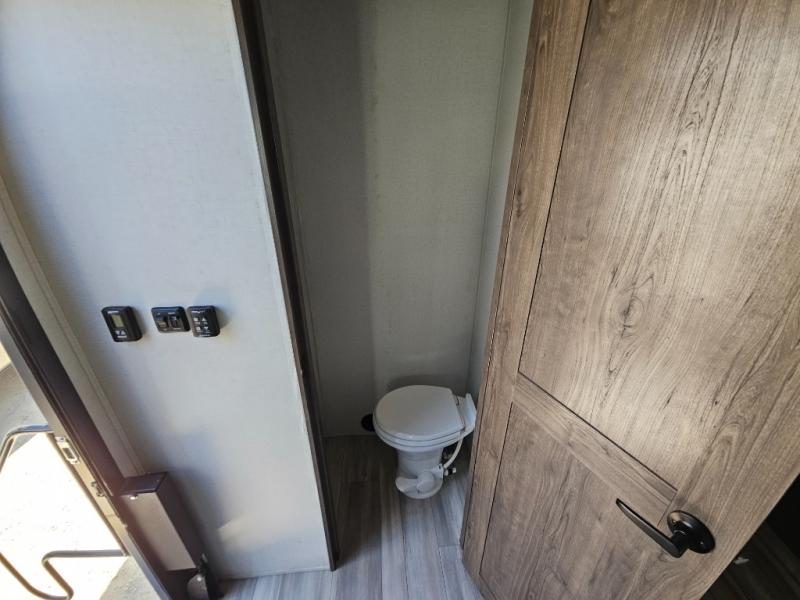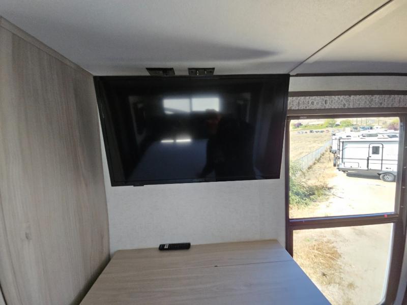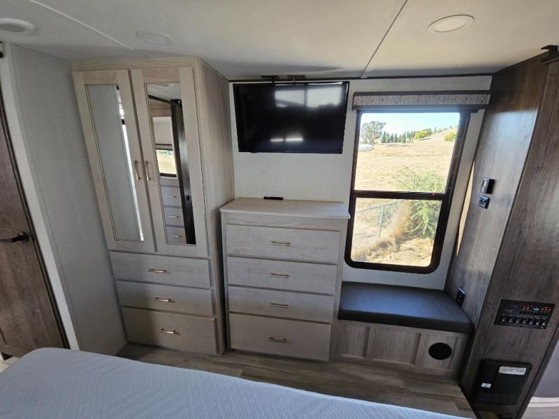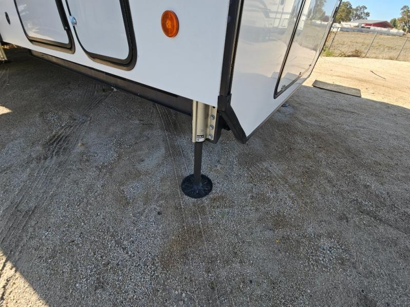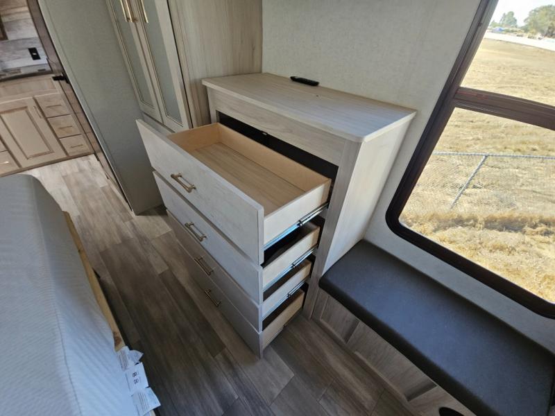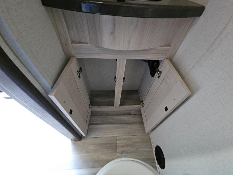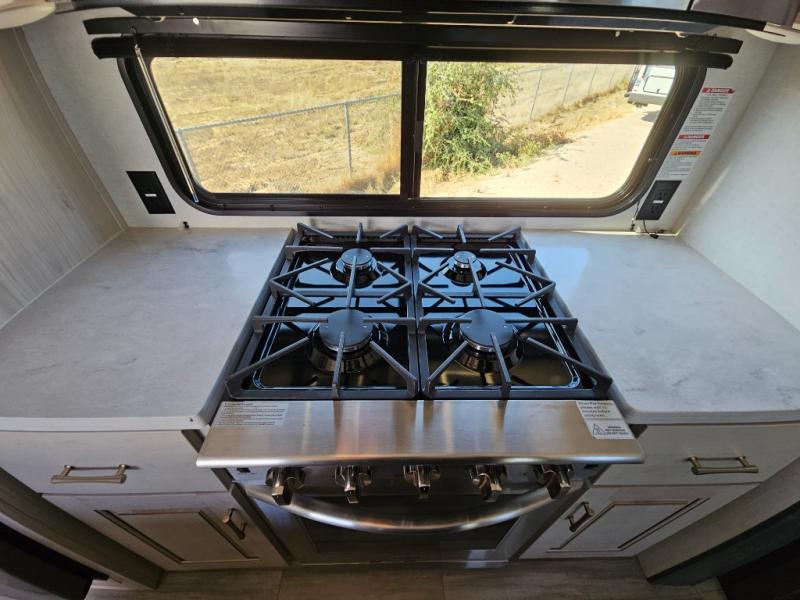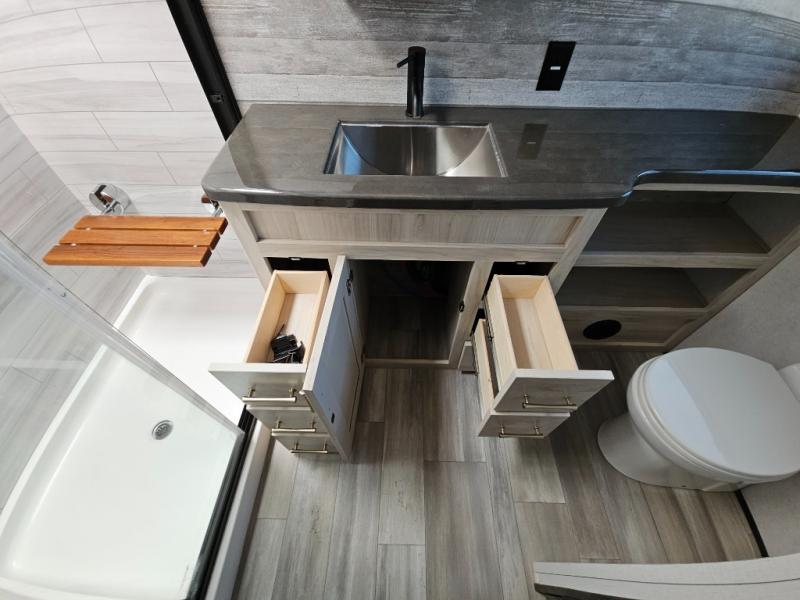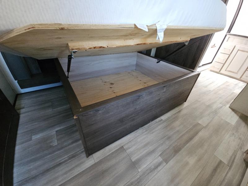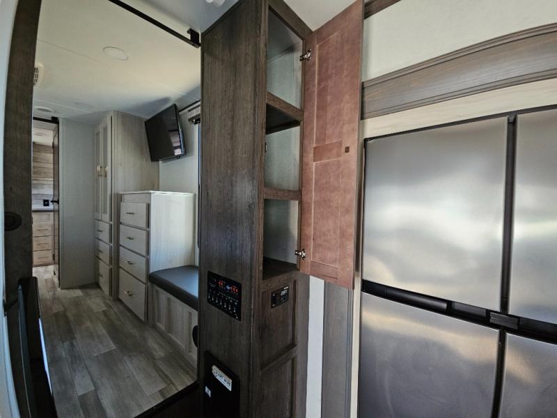 An active family will want this fifth wheel with its exterior basement pull-out tray that measures at 48" x 115" to load up your kayaks and such. Just above this area is the master suite with a rear bathroom that offers a residential shower, a porcelain toilet with soft close seat, plus a wardrobe and shelf storage. The king bed slide gives you more floor space, and you will have a seat, a flip-top dresser, and a Smart TV to watch. The half bath is next to the main entry which is super convenient, and the middle kitchen is separate from the front living area. The cook will love the residential microwave, range and oven, plus the option to add a residential refrigerator, plus the pantry, and the extra counter space on the kitchen island with a stainless steel farm sink. And the views out of the atrium windows in the slide out which includes the floating dinette table are a must see. And when you need to watch the big game, the 55" Smart TV with pull-out fireplace below are up front with the dual recliner love seat and two sleeper sofas.