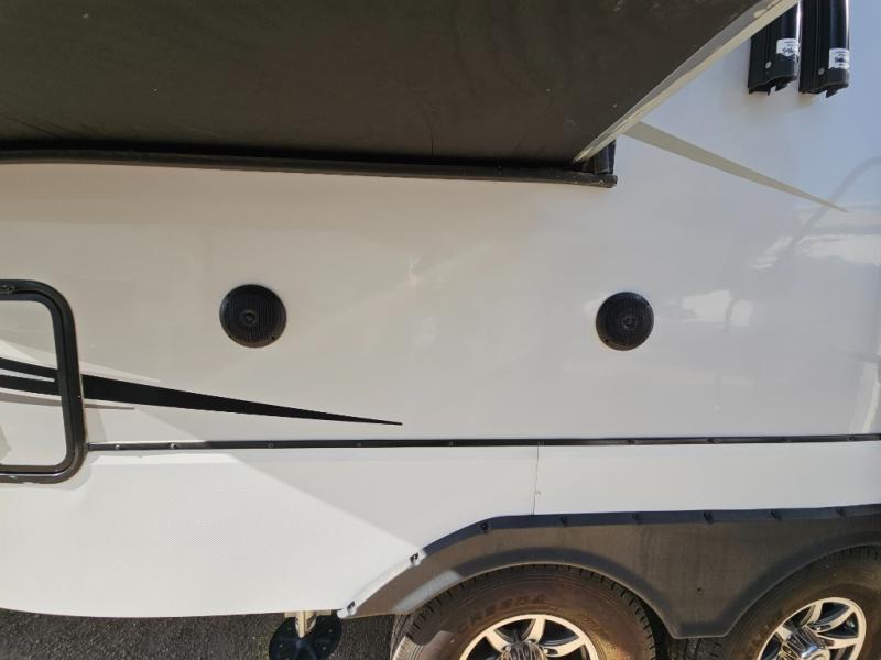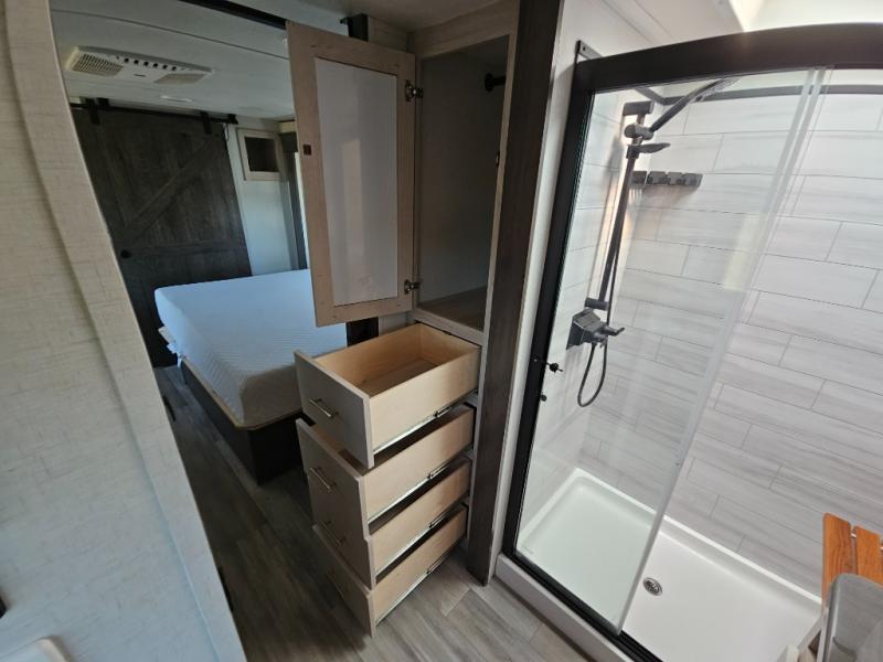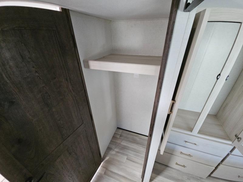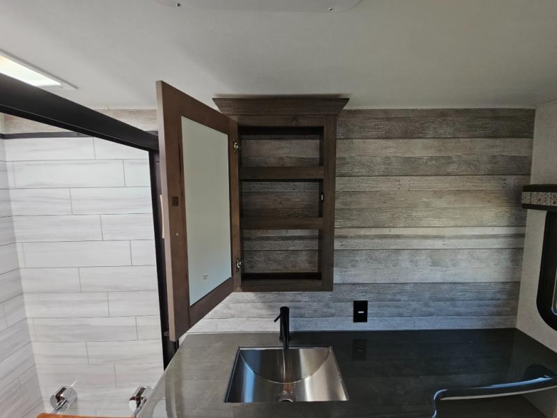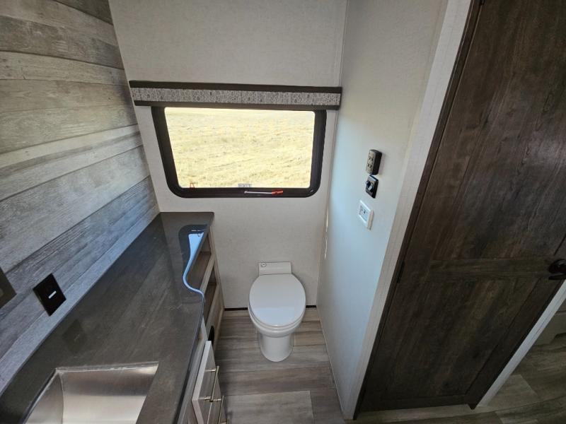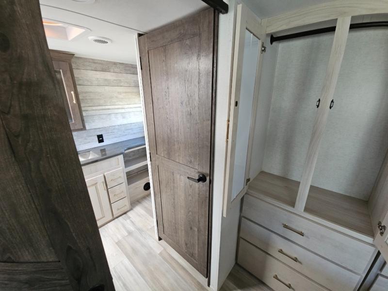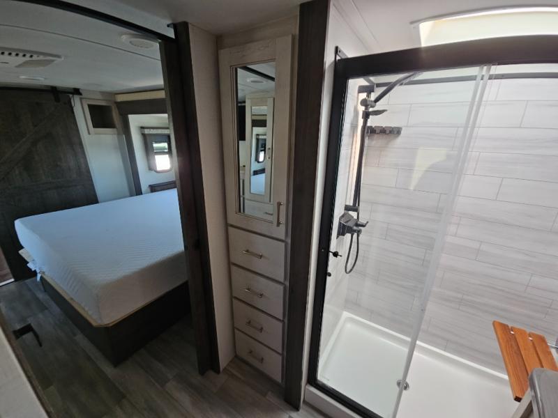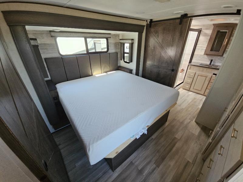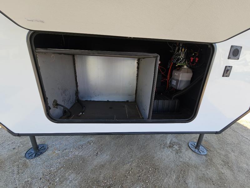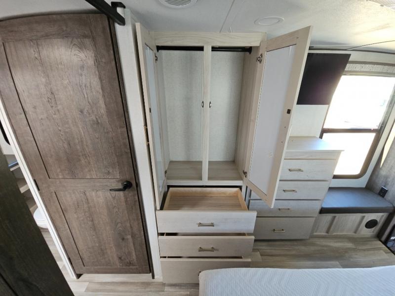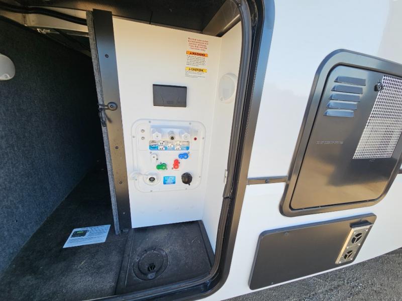An active family will want this fifth wheel with its exterior basement pull-out tray that measures at 48" x 115" to load up your kayaks and such. Just above this area is the master suite with a rear bathroom that offers a residential shower, a porcelain toilet with soft close seat, plus a wardrobe and shelf storage. The king bed slide gives you more floor space, and you will have a seat, a flip-top dresser, and a Smart TV to watch. The half bath is next to the main entry which is super convenient, and the middle kitchen is separate from the front living area. The cook will love the residential microwave, range and oven, plus the option to add a residential refrigerator, plus the pantry, and the extra counter space on the kitchen island with a stainless steel farm sink. And the views out of the atrium windows in the slide out which includes the floating dinette table are a must see. And when you need to watch the big game, the 55" Smart TV with pull-out fireplace below are up front with the dual recliner love seat and two sleeper sofas.