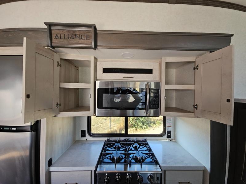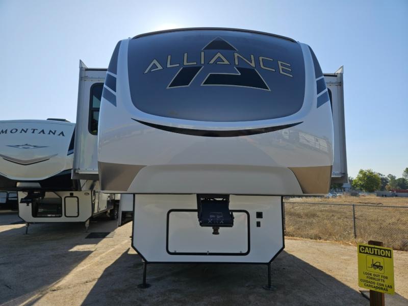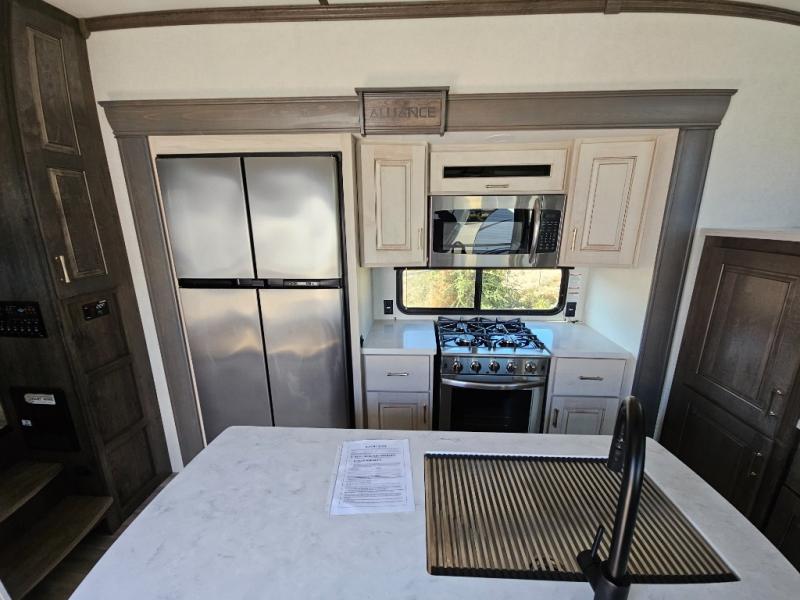 With any Paradigm fifth wheel by Alliance RV, you will experience the next generation advanced frame technology with heavy duty performance running gear. The Benchmark chassis features solid steel 10" l-beam main rails with a 2" torsion tube welded where the running gear attaches, drop frame storage area, flush upper deck design, reinforced goose neck area and a Rota-Flex pin box. The six-point hydraulic auto leveling is faster, stronger and quieter allowing you to enjoy more time away, and the PVC roof is more puncture resistant, ultra bright white and more solar reflective to help keep your fifth wheel cool. The triple 13,500 BTU A/Cs are ultra quiet, independently controlled direct flow A/C units that maximize cooling capacity, plus the 40,000 BTU furnace has flex ducts connected to formed ducts in the floor, and there are dedicated heat vents into the basement and underbelly to keep the tanks and your gear cozy warm during the cooler seasons. Choose luxury, choose convenience, choose to own the best, a Paradigm!